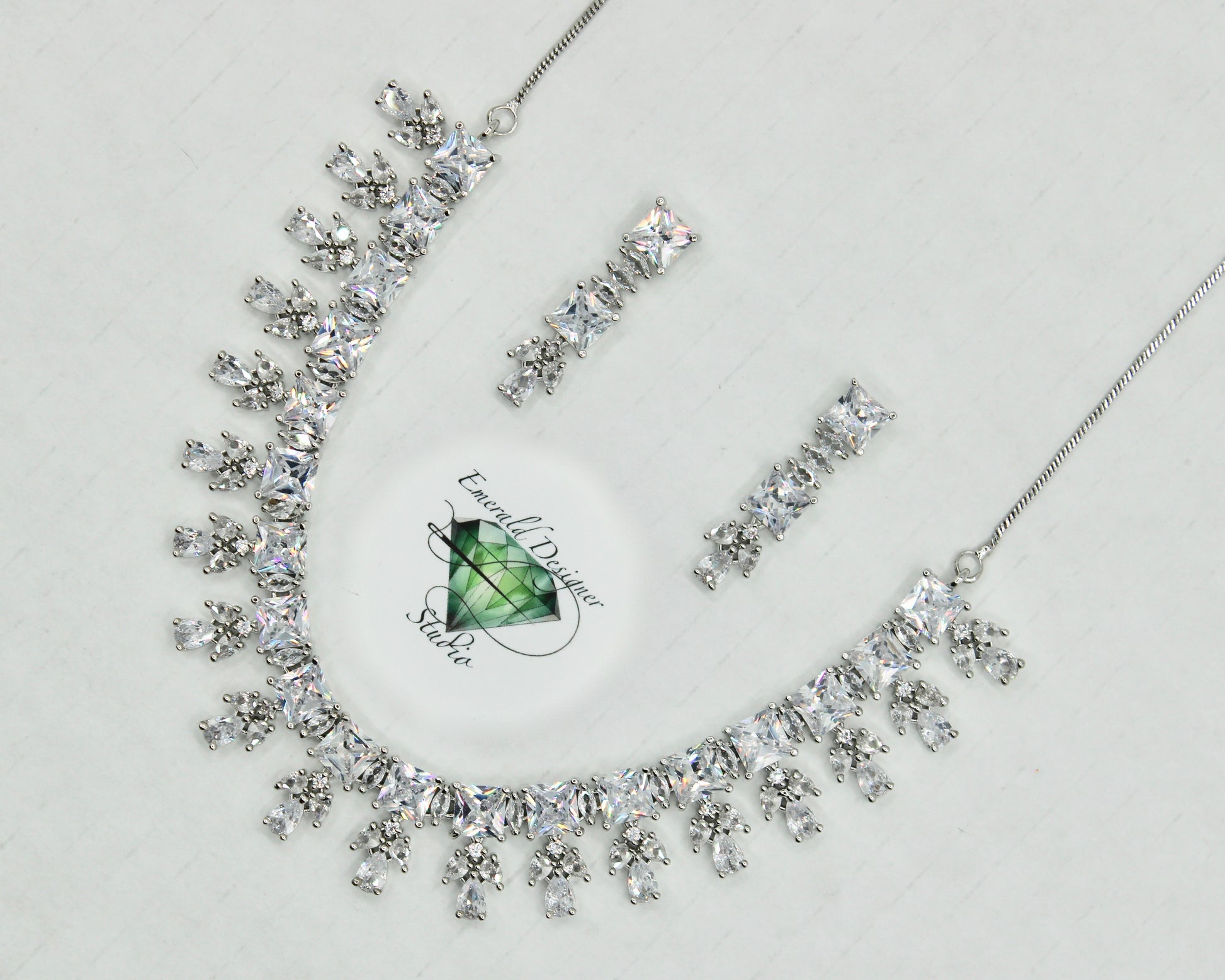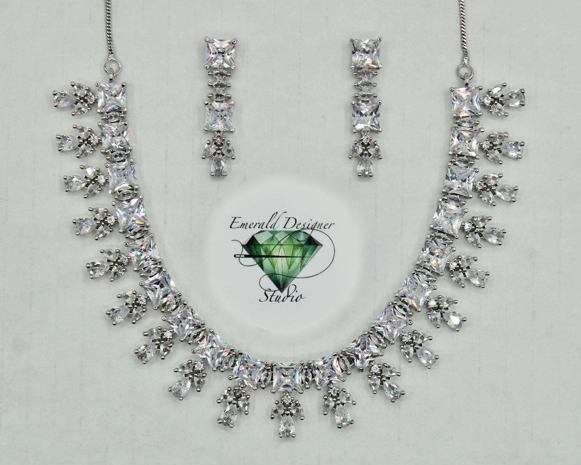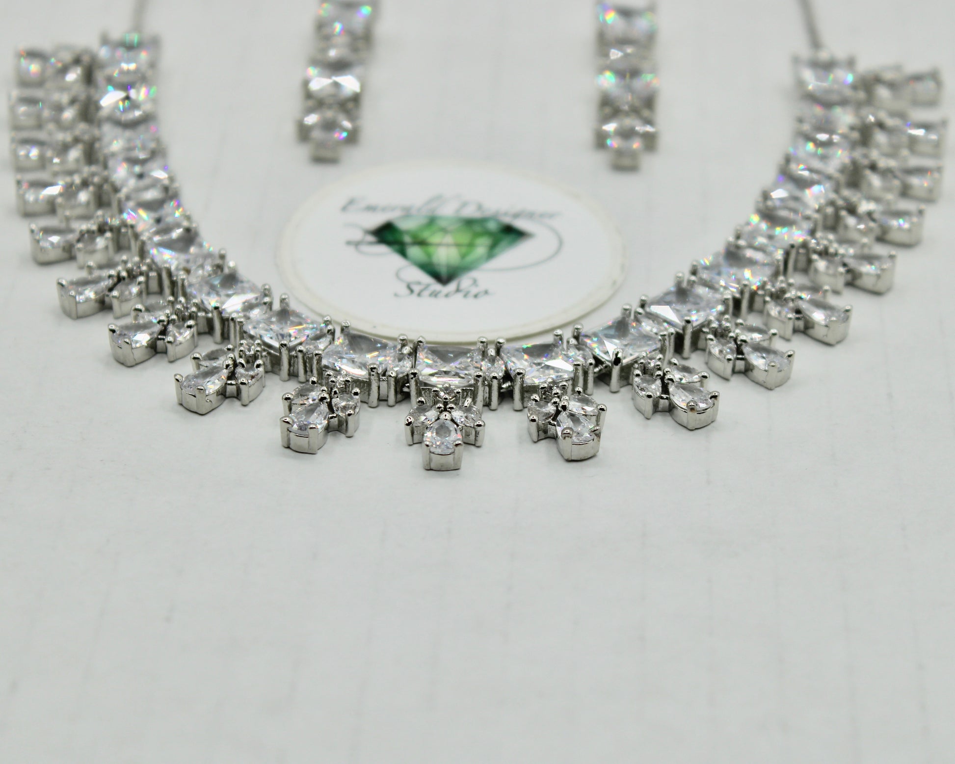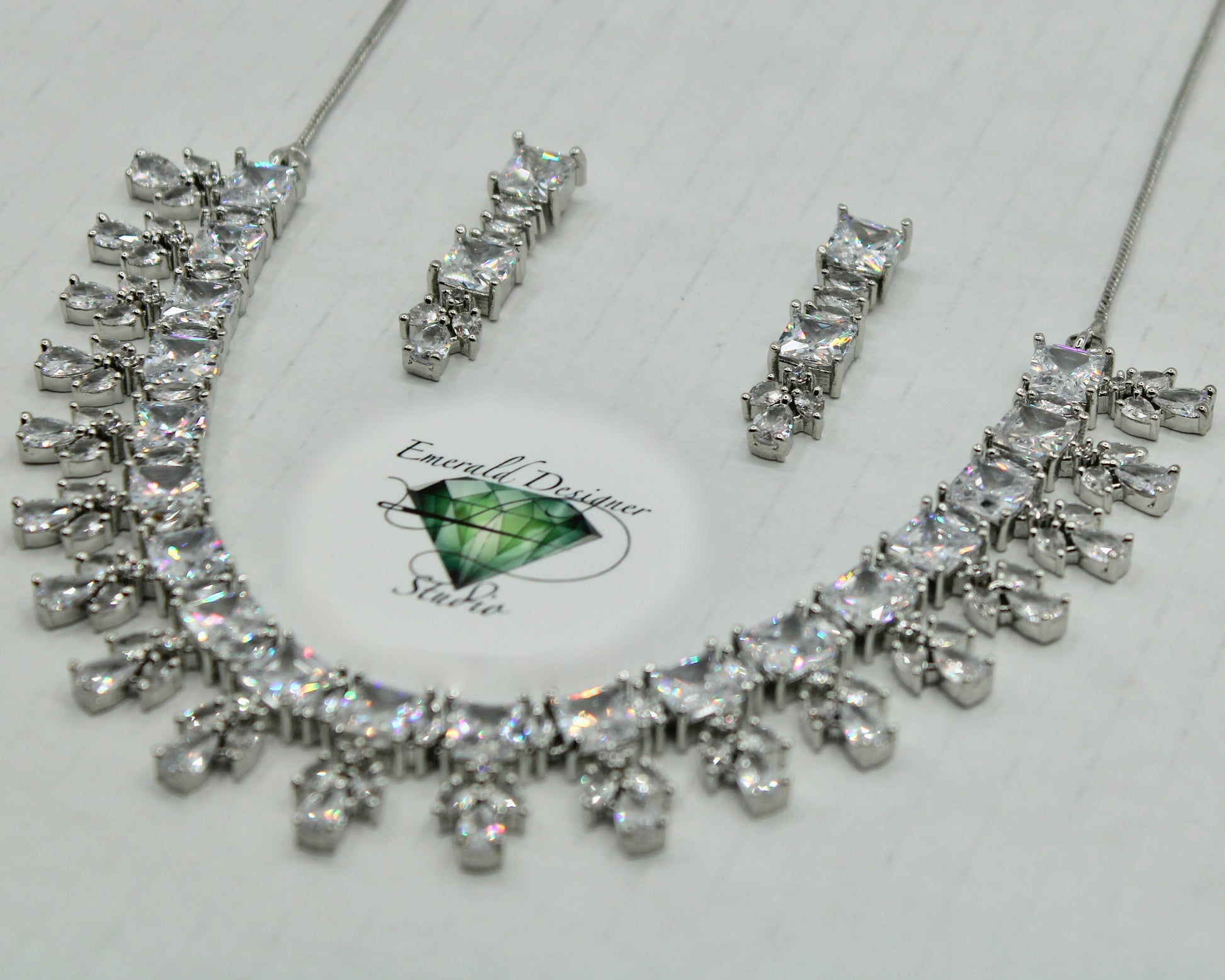 This delicate necklace set is complete with pear-cut cubic zirconia and is complete with matching earrings. This necklace set is the perfect addition for any look and for all ages.