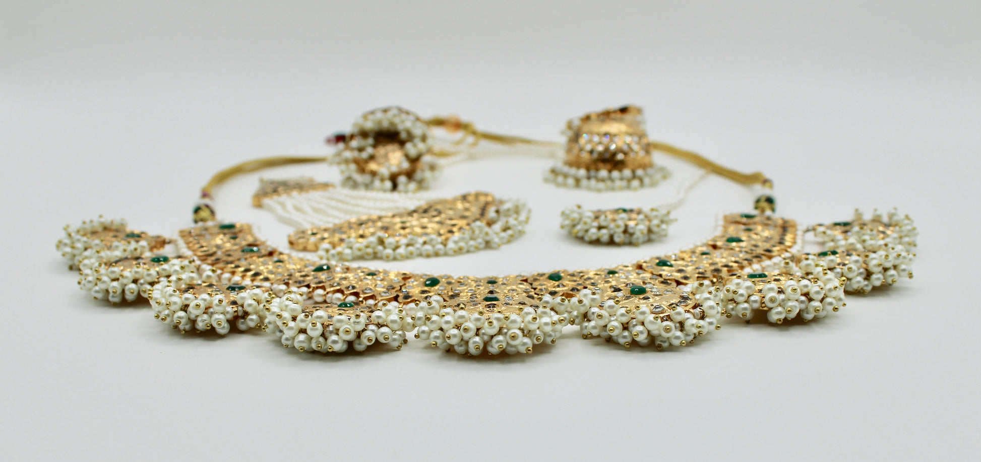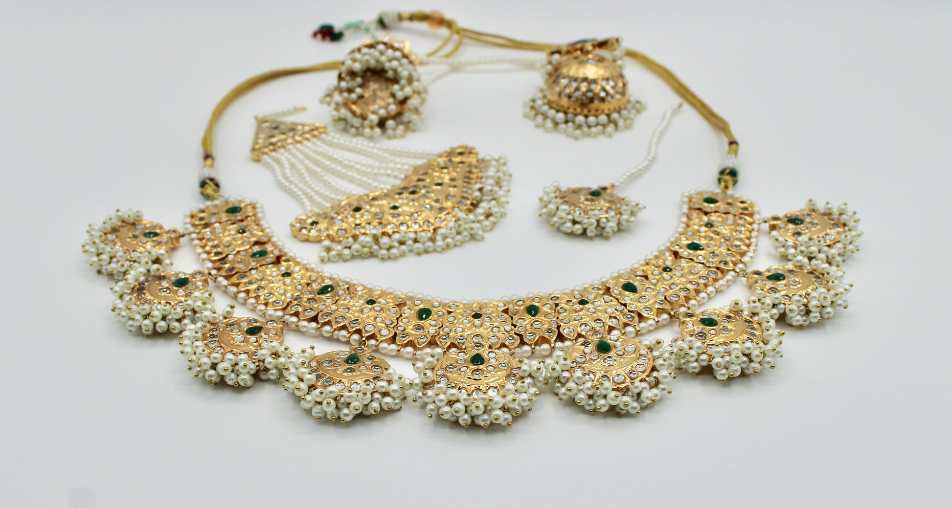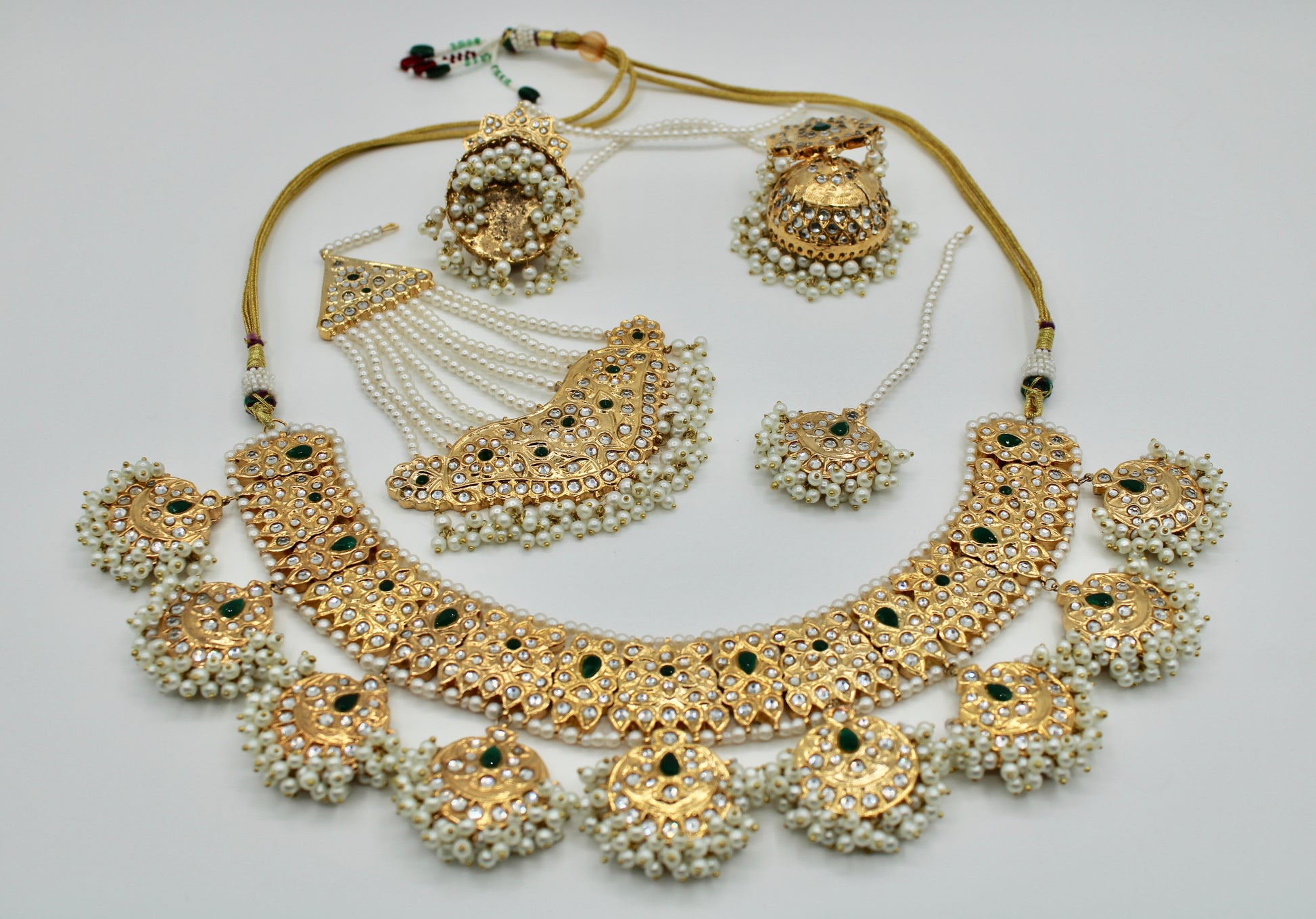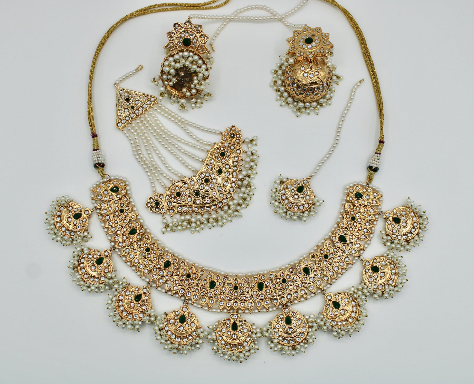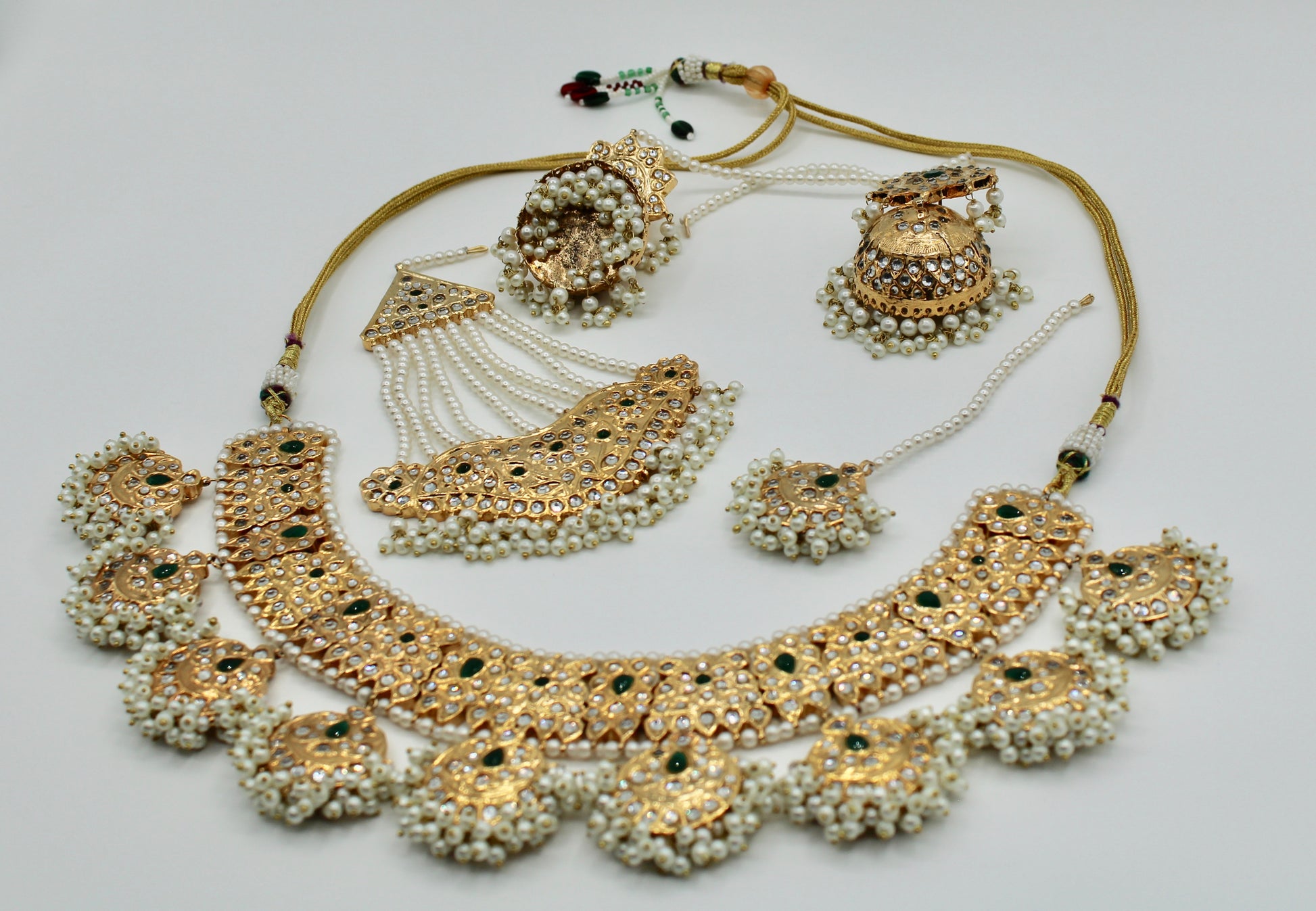 This magnificent hand-made Pakistani thappa kundan set is detailed with semi precious Emeralds and is completed with gujra pearls detailing. It is also fully gold-plated. This heavy set includes a jhumer, a teeka and jhumkay. Made of brass to increase product lifetime.