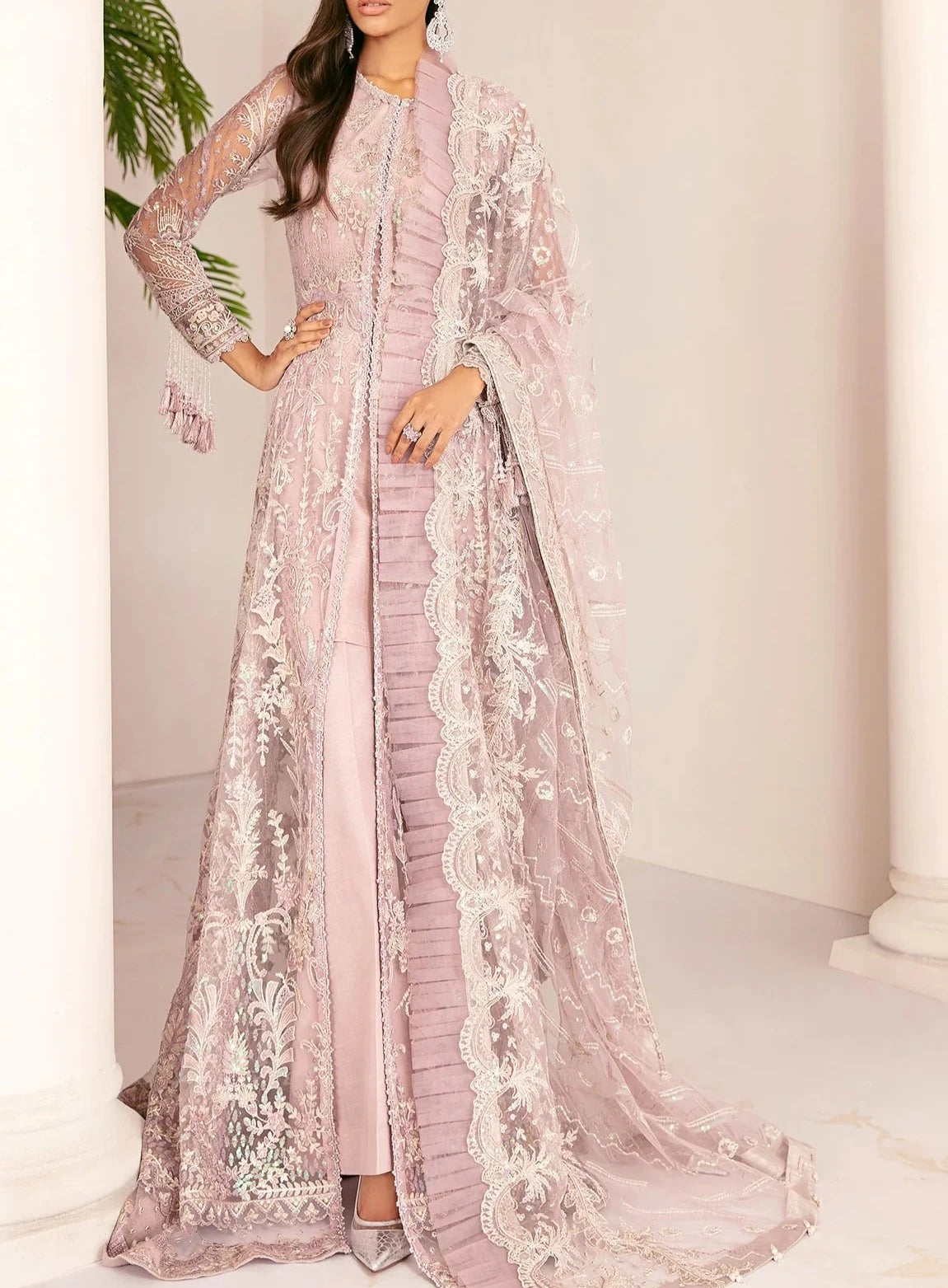 Baroque official, premium stitched. This exquisite three piece net ensemble is accentuated with embroidery work all over, and has an ethereal appearance. The net top and dupatta is fully adorned with embroidery and is the epitome of glamour. It comes with a dyed silk trouser.