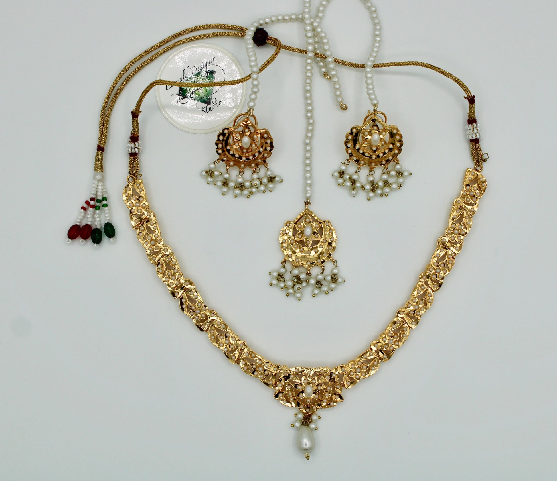 This stunning hand-crafted ari work necklace set is gold plated and complete with faux pearls detailing throughout.