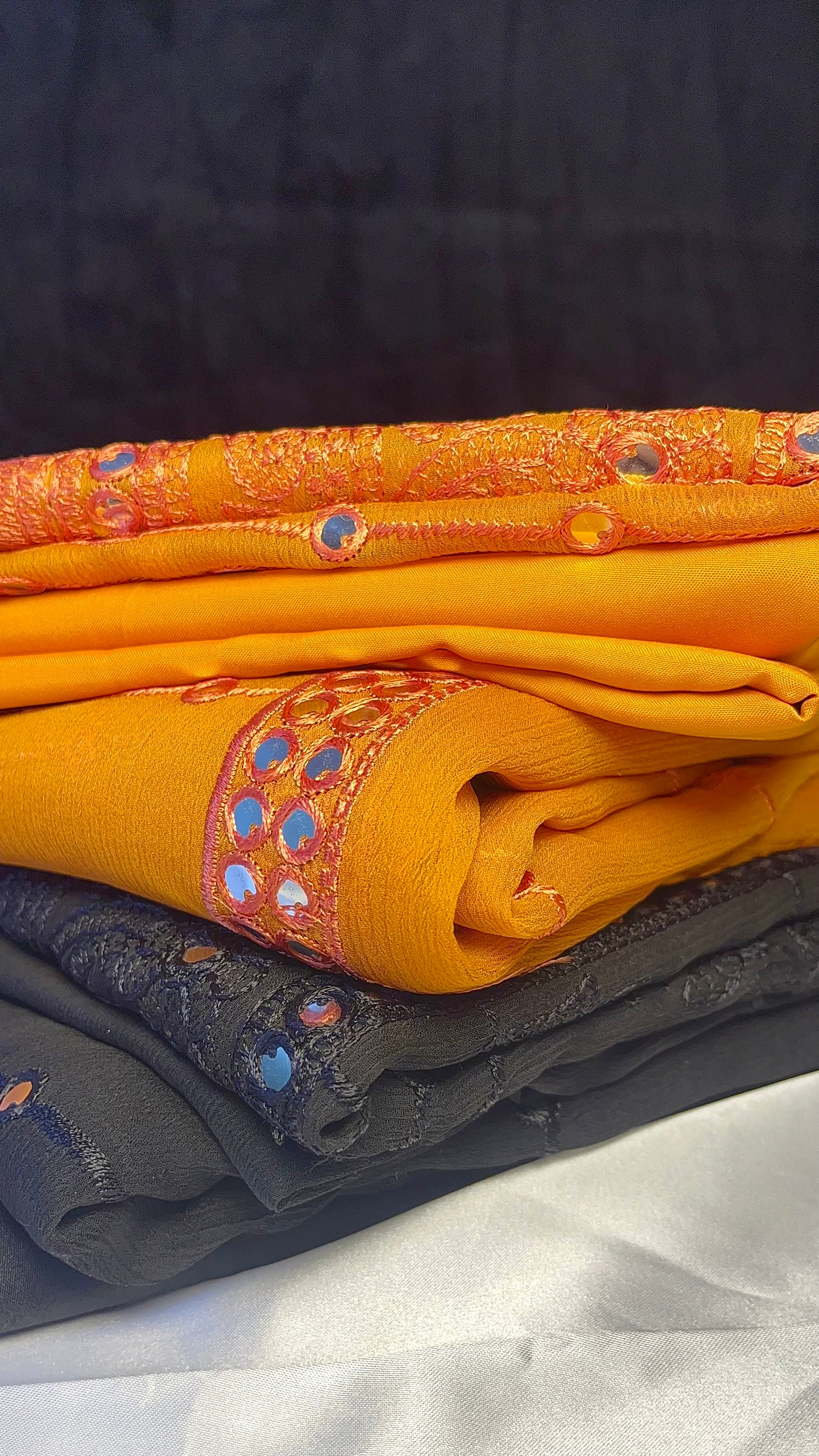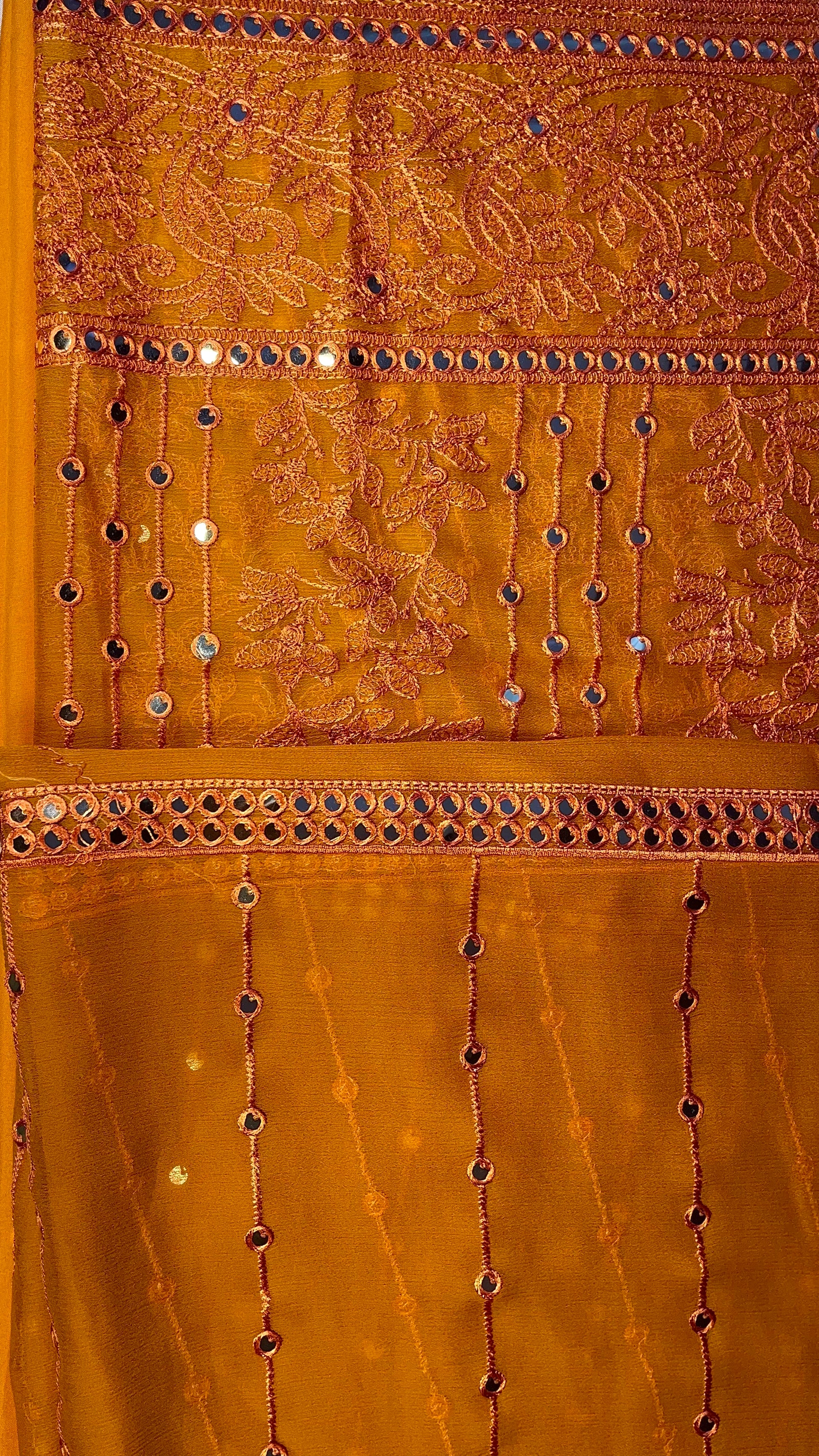 This fully embroidered unstitched suit features sequin that resembles mirrors which make it both stunning but lightweight, complete with fabric for malai trousers.