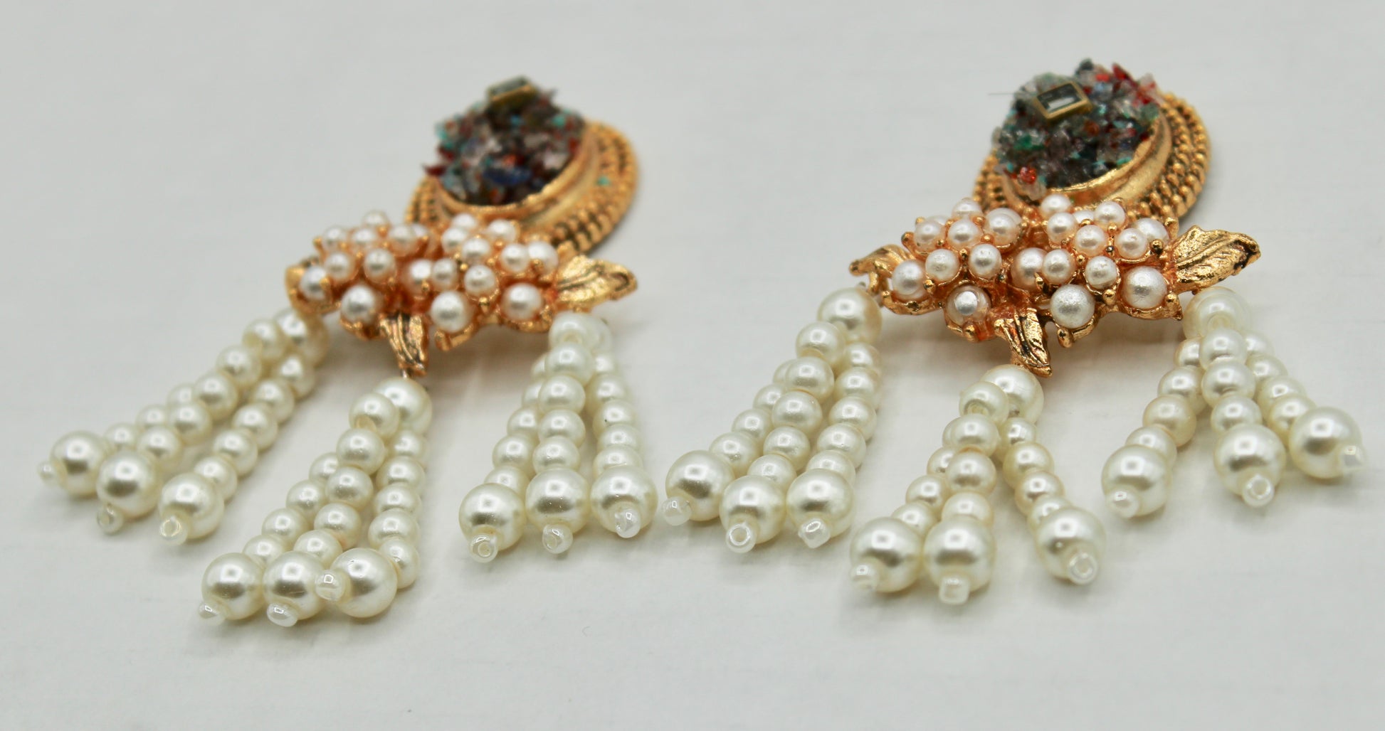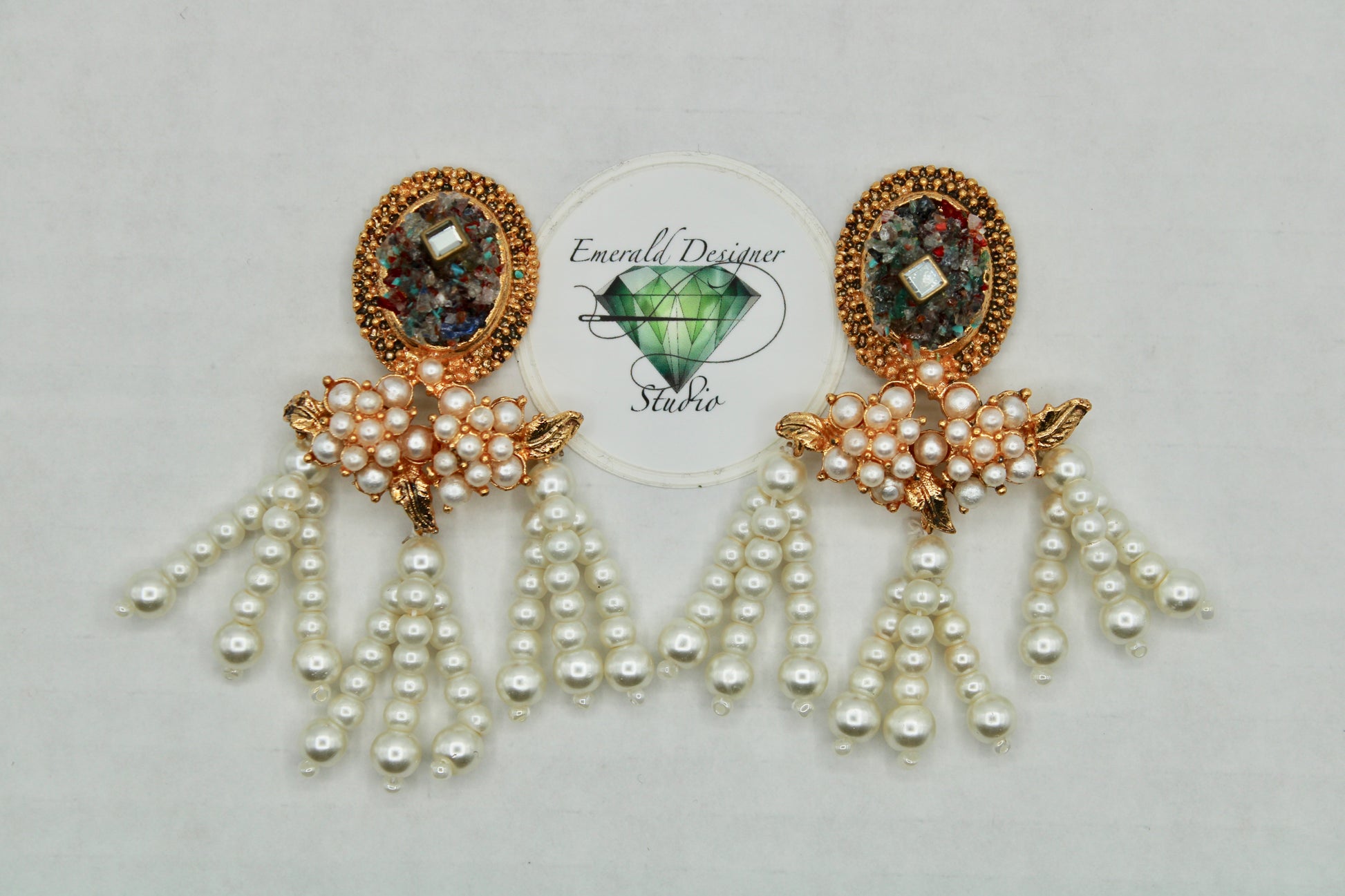 These unique earrings are made of iridescent crushed stone and faux pearl detailing throughout.