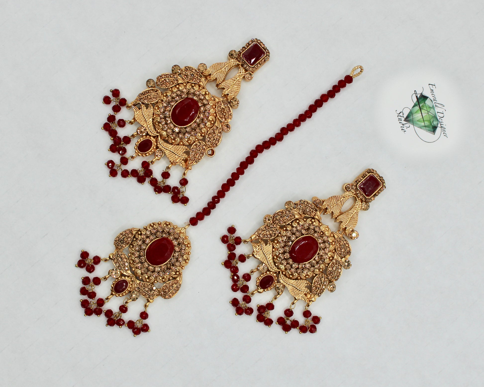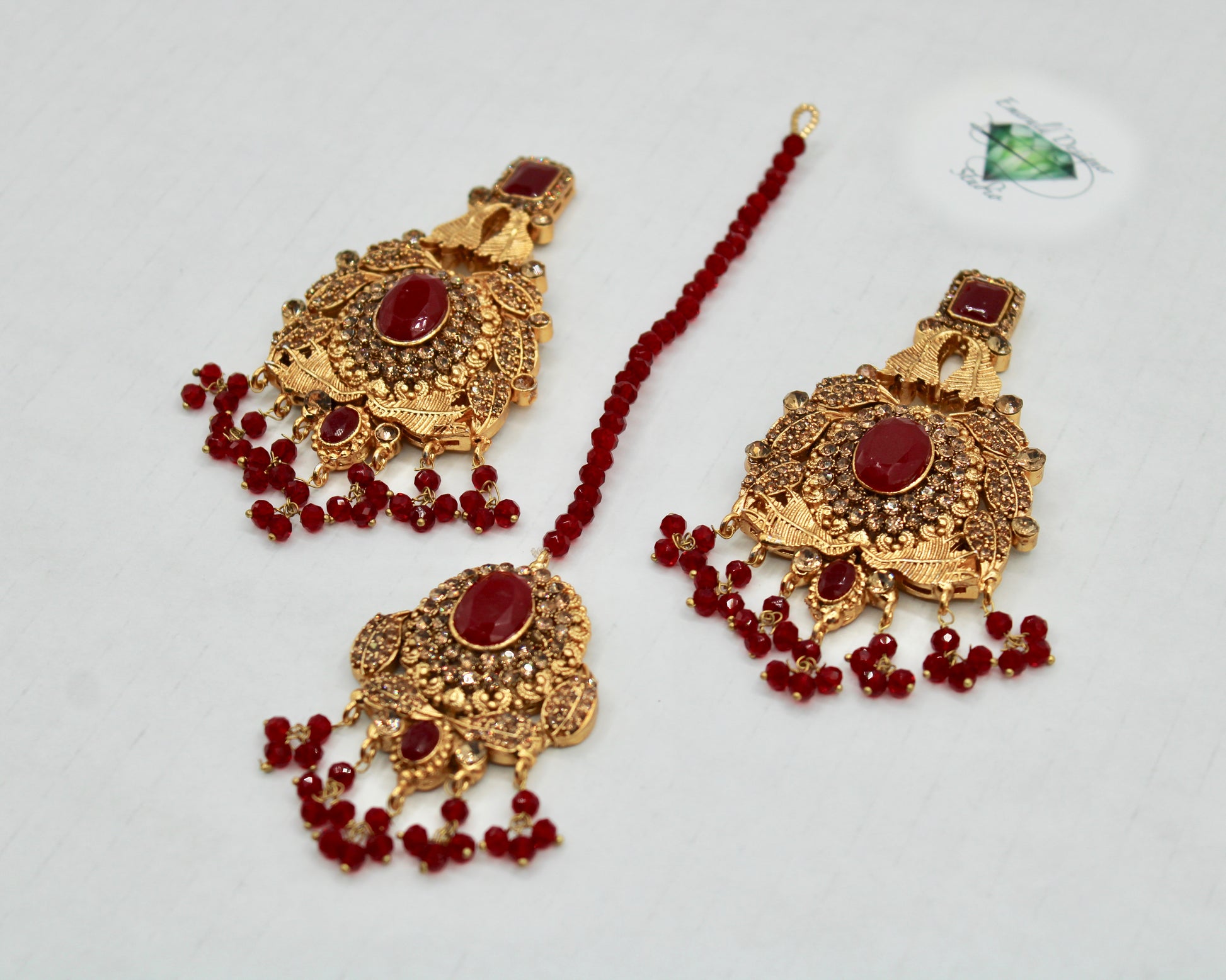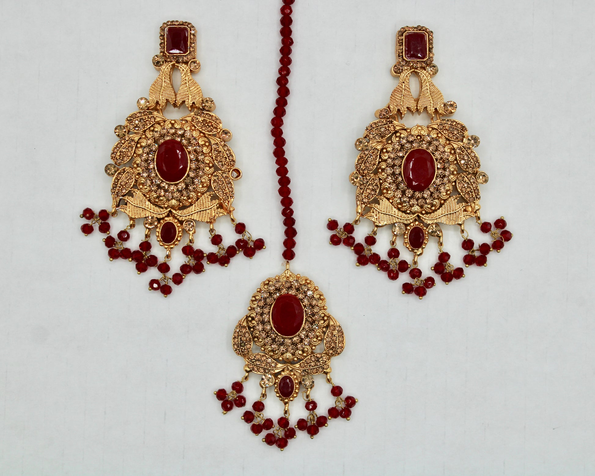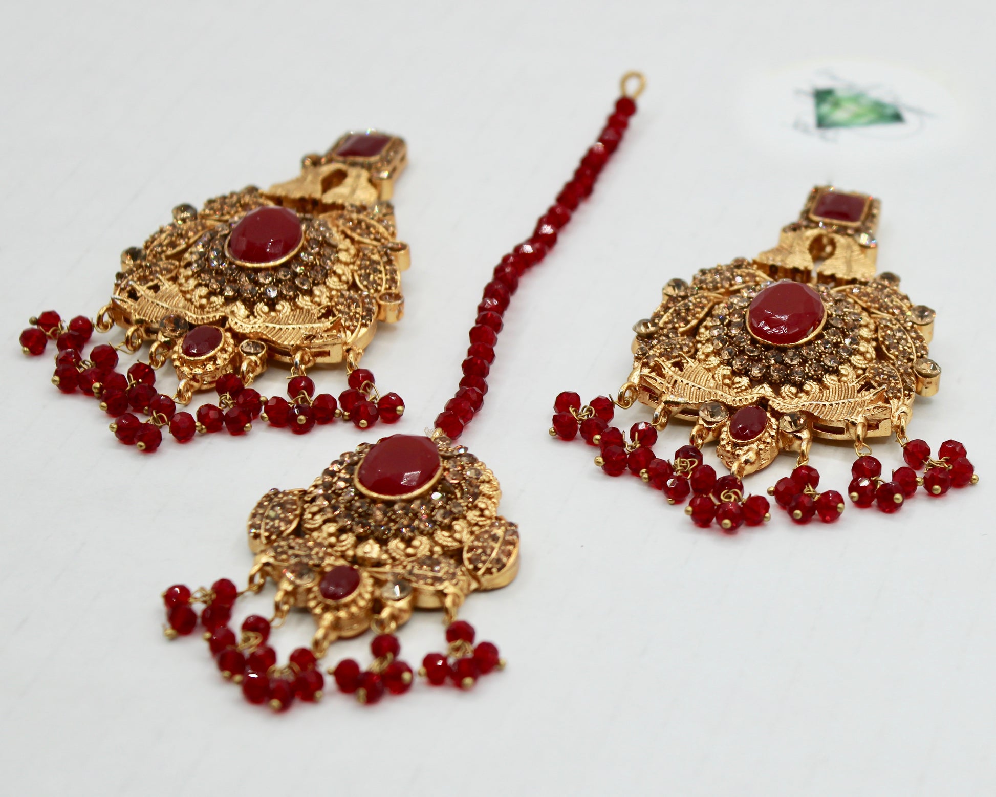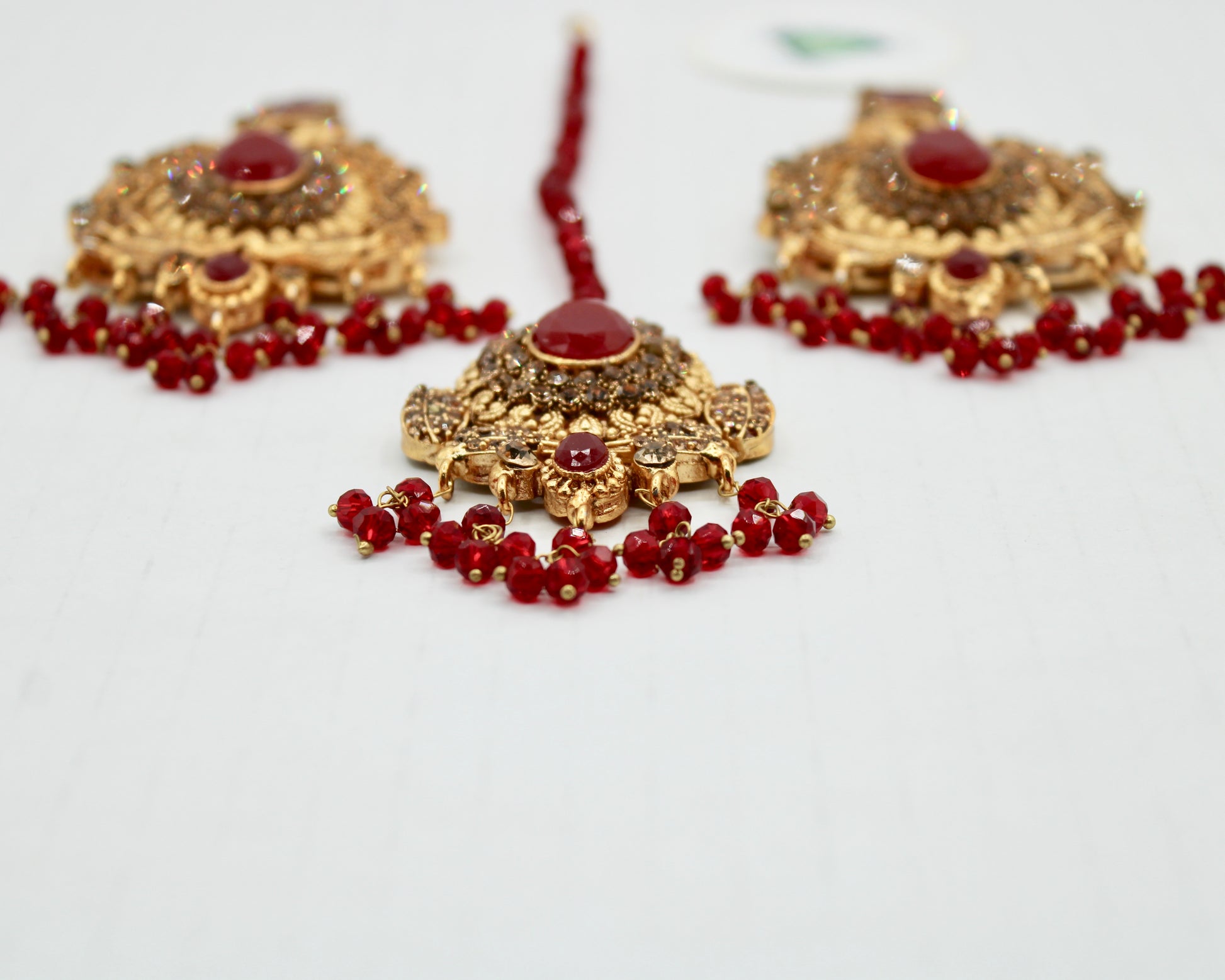 This beautiful Rajwadi teeka set is complete with in red crystal and stone detailing, and is matte gold.