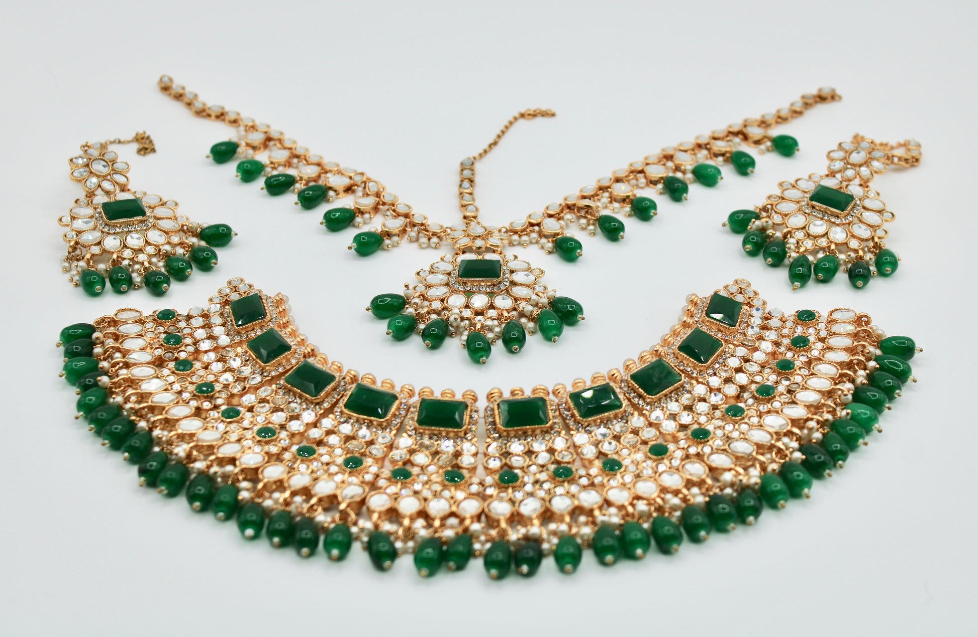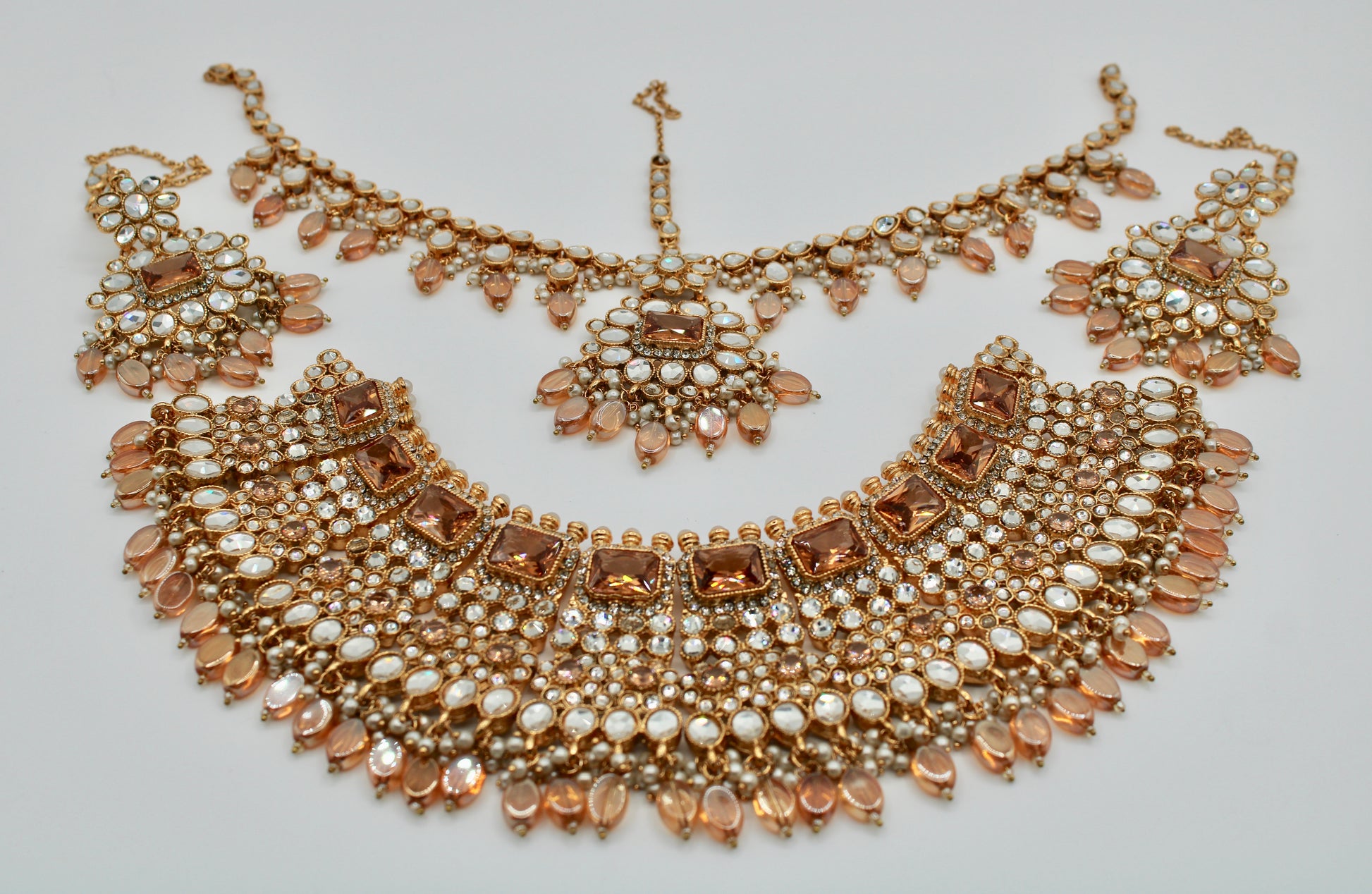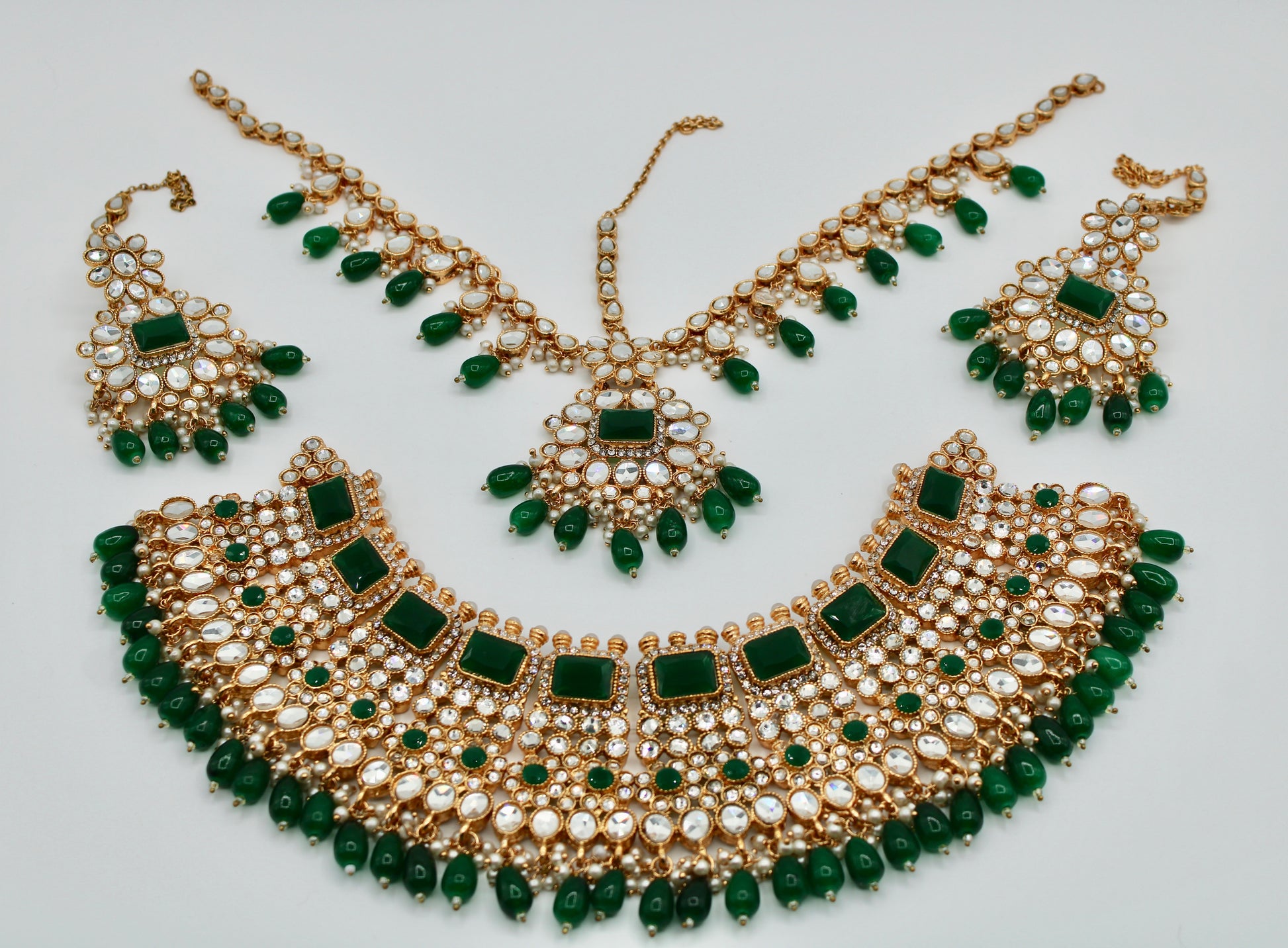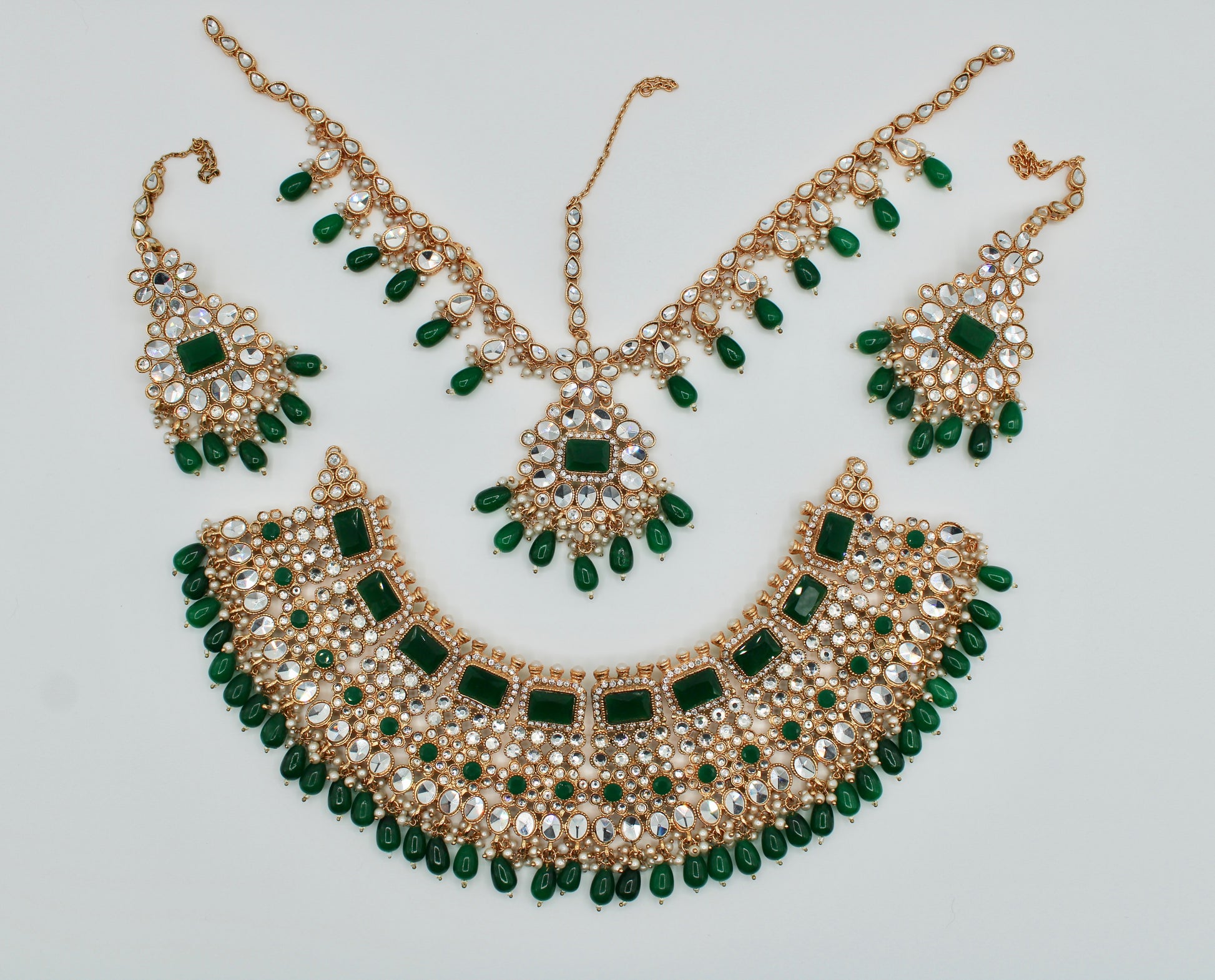This stunning bridal necklace set is complete with sheesha kundan and crystals, giving this set an antique look. The set includes a matha patti, broad earrings and a necklace. Available in 2 colours.