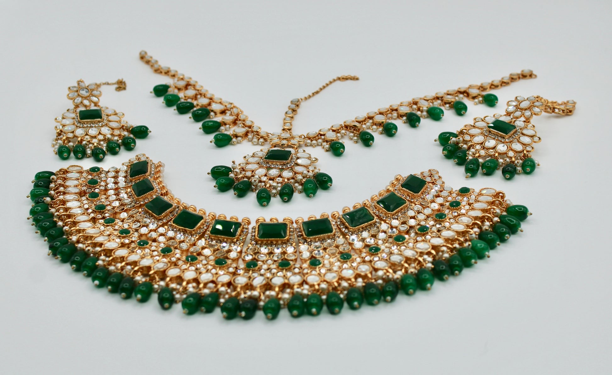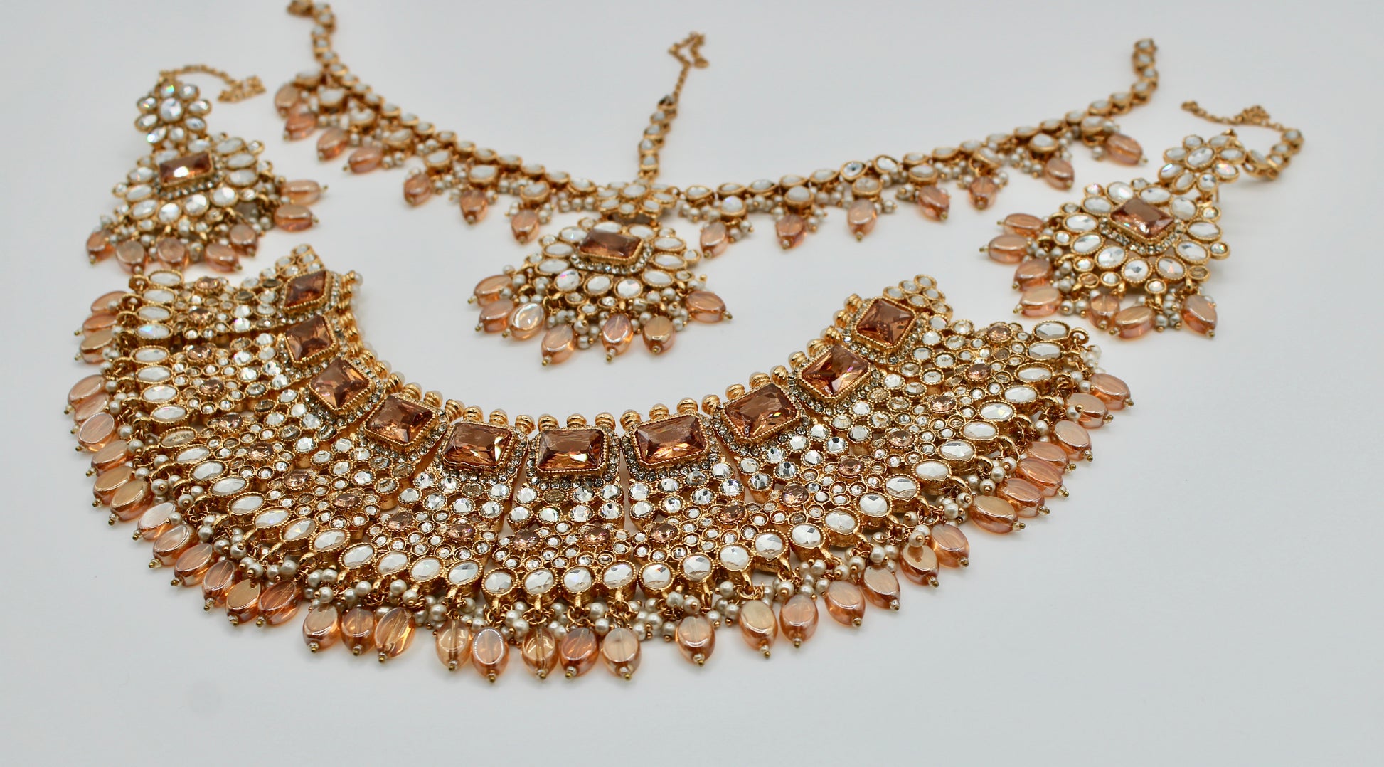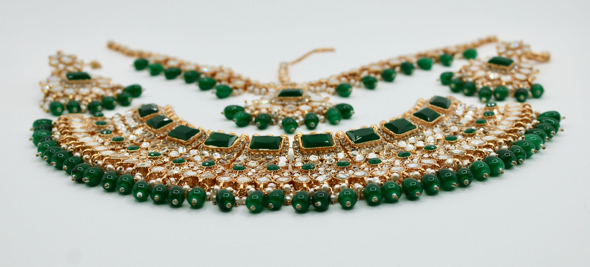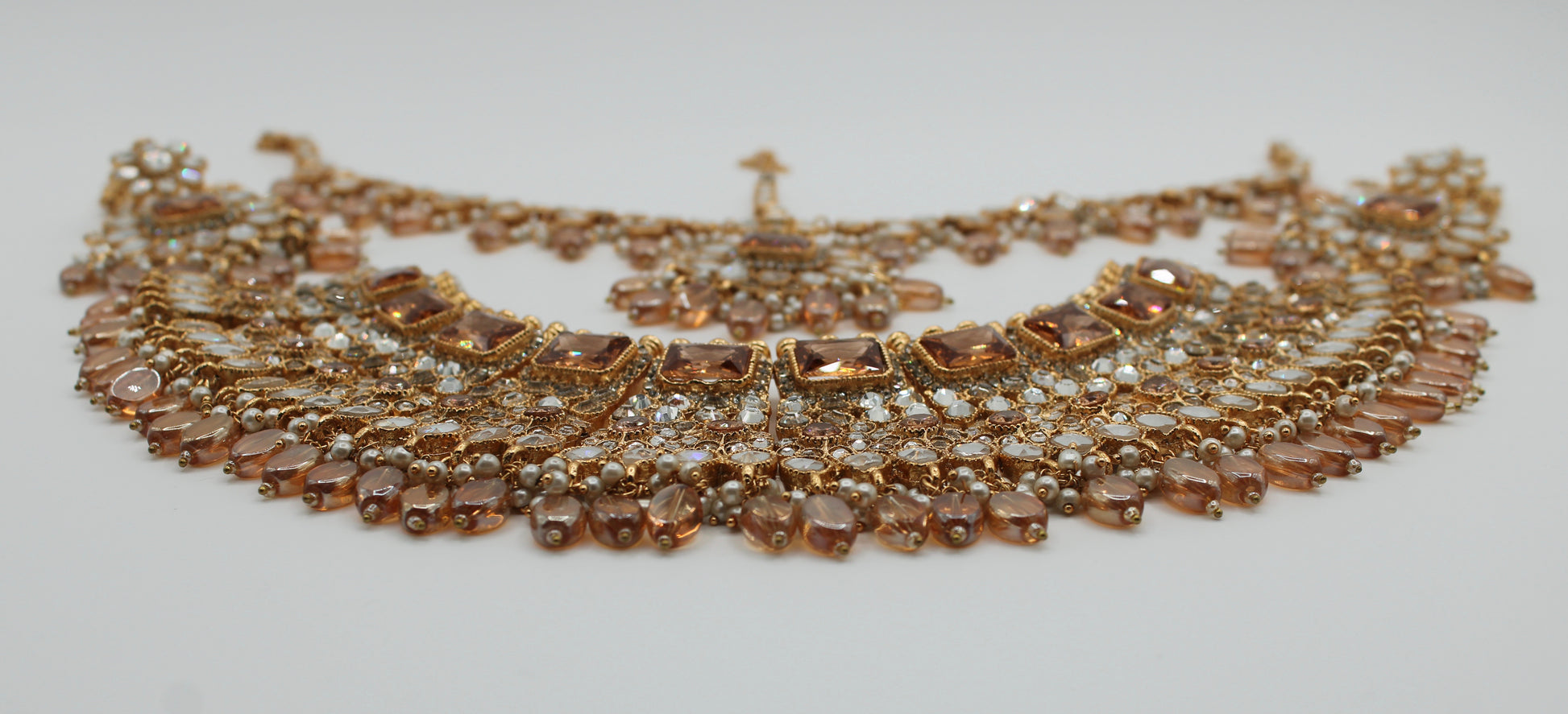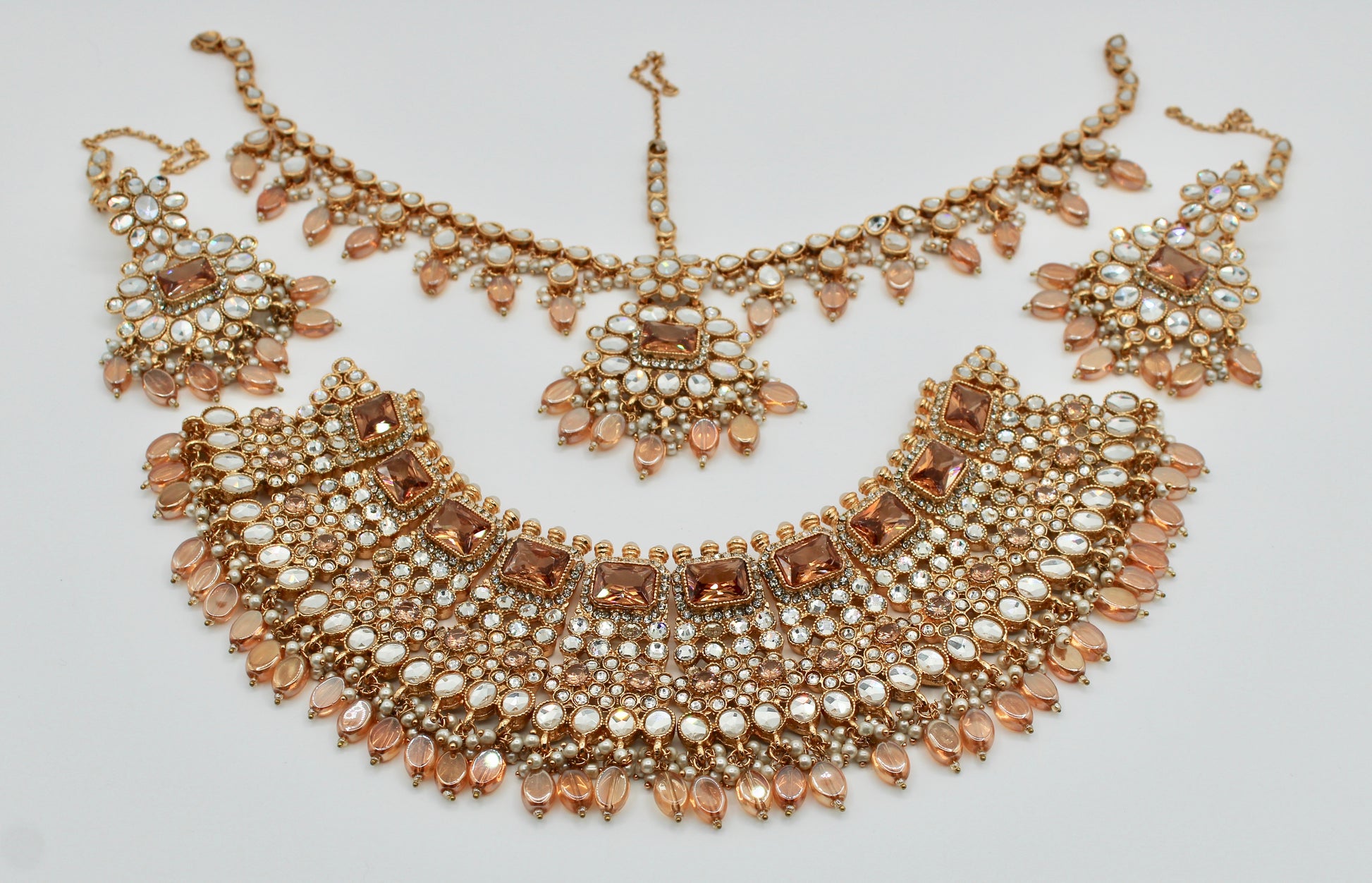 This stunning bridal necklace set is complete with sheesha kundan and crystals, giving this set an antique look. The set includes a matha patti, broad earrings and a necklace. Available in 2 colours.