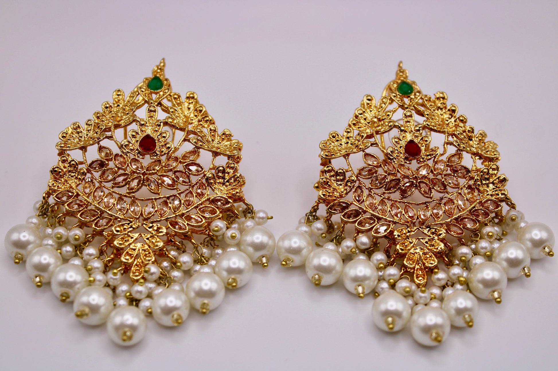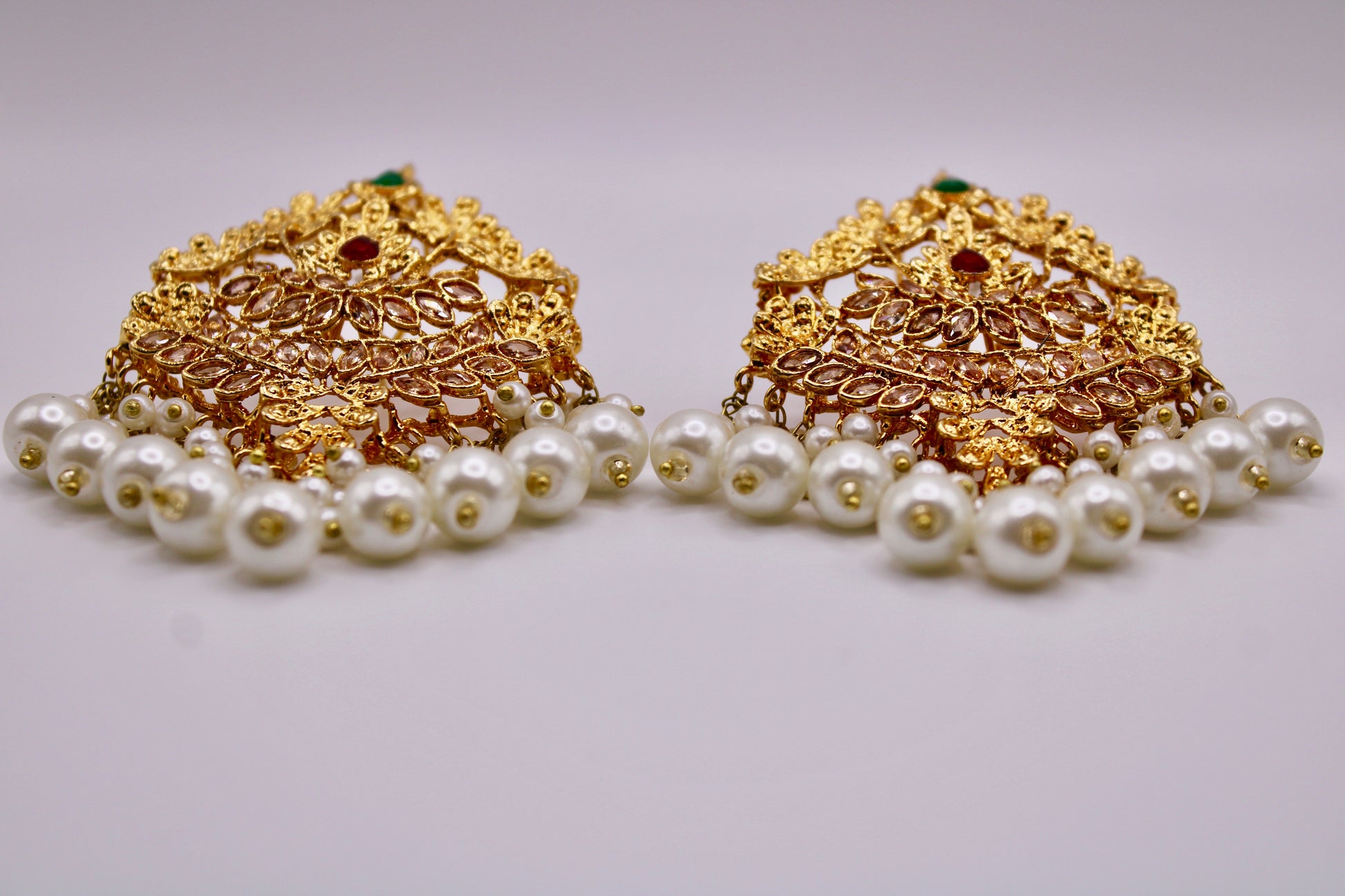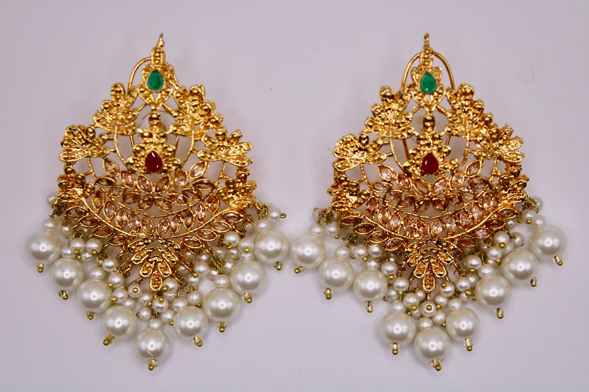 These delicate polki chaand balis are complete with semi-precious gem detailing and faux pearls throughout.