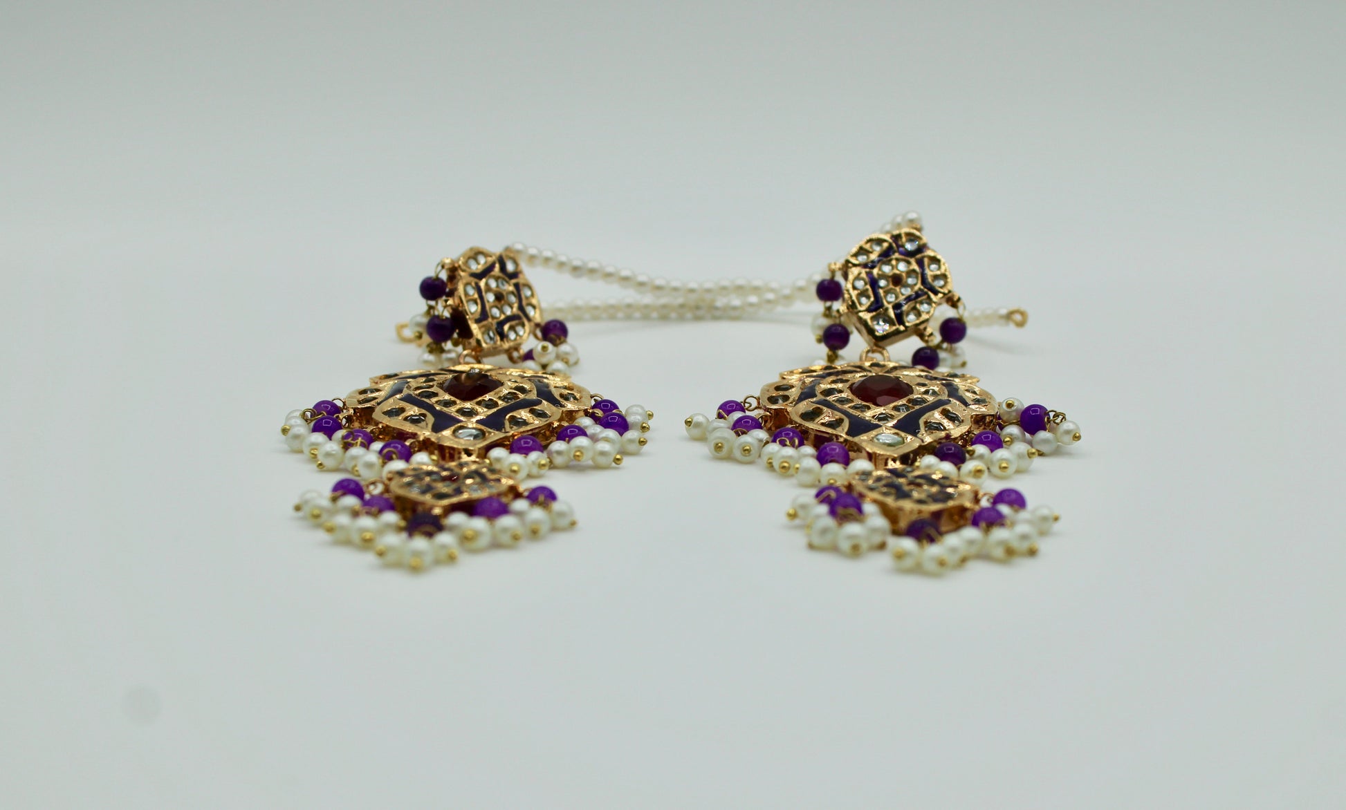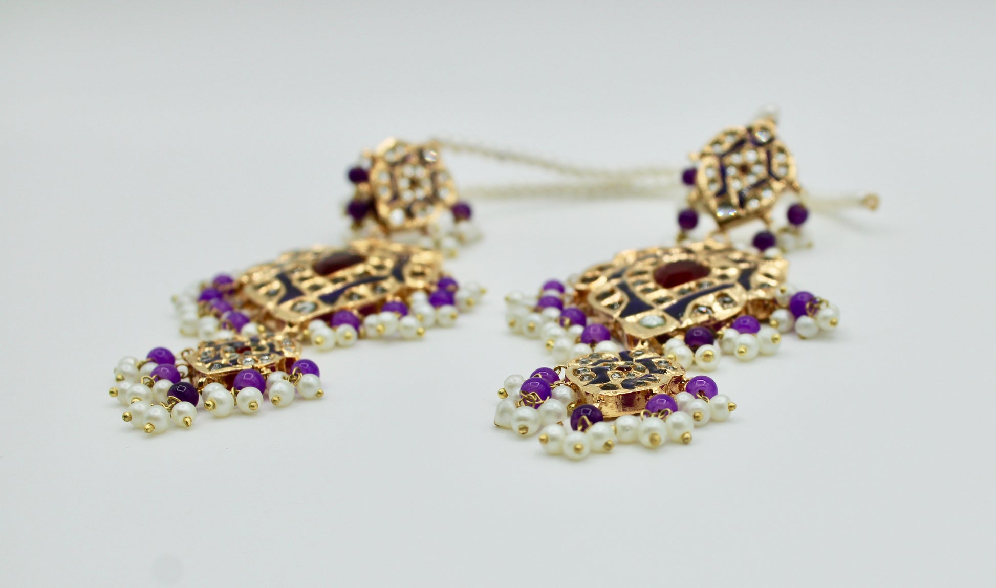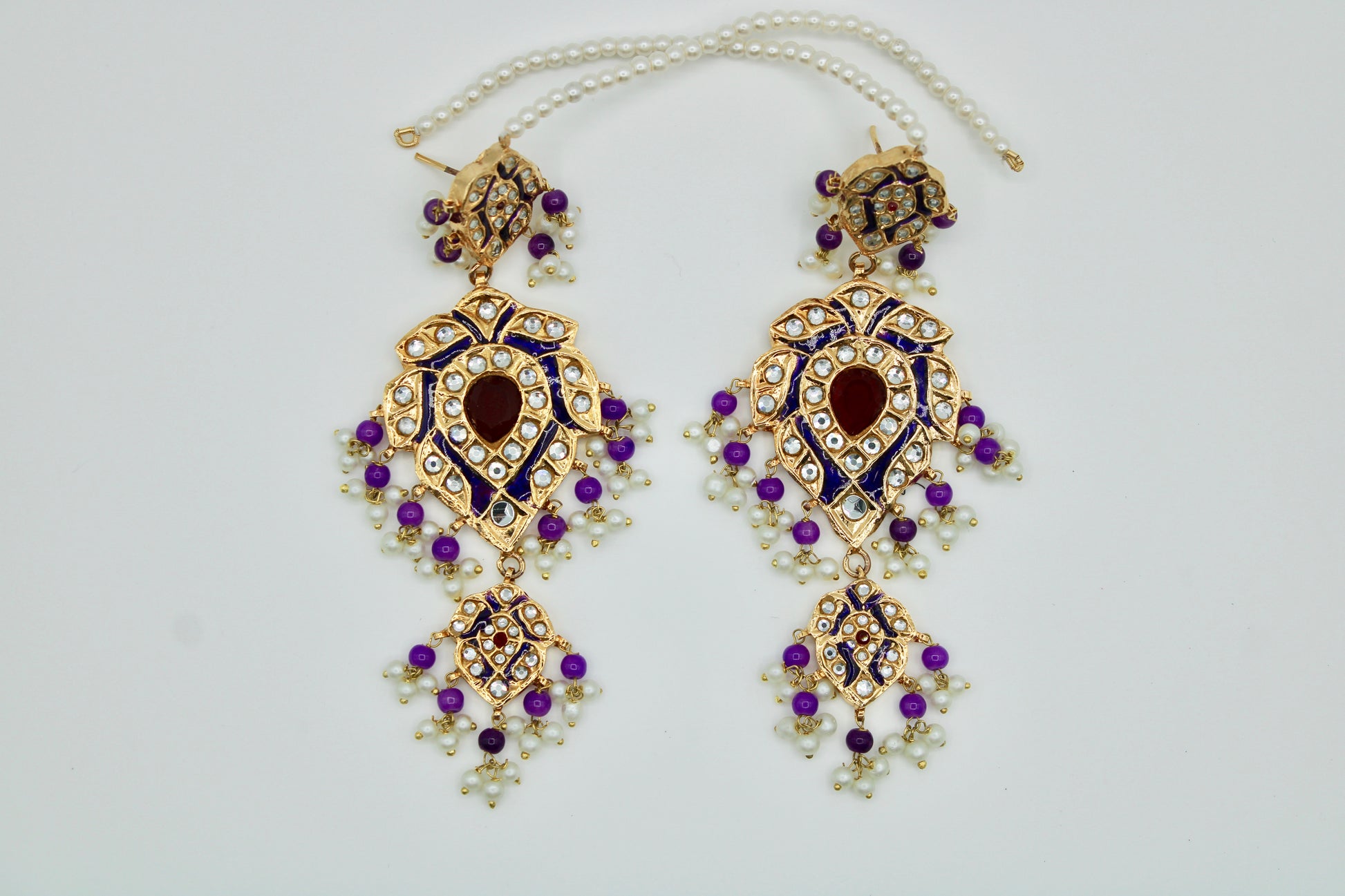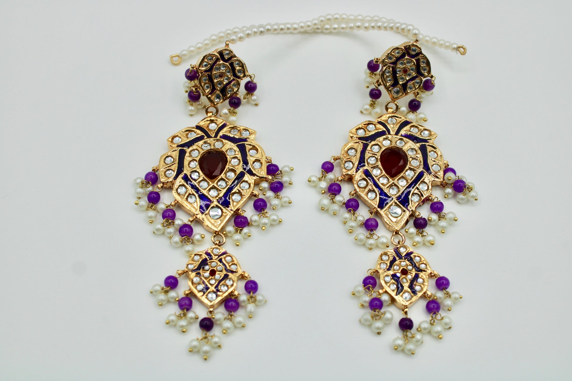These traditional hand-made meena kari Pakistani thappa kundan has two toned pearls detailing in a fancy leaf shape. These earrings come with hand-weaved detailing, and are gold-plated. Made of brass to increase product lifetime.