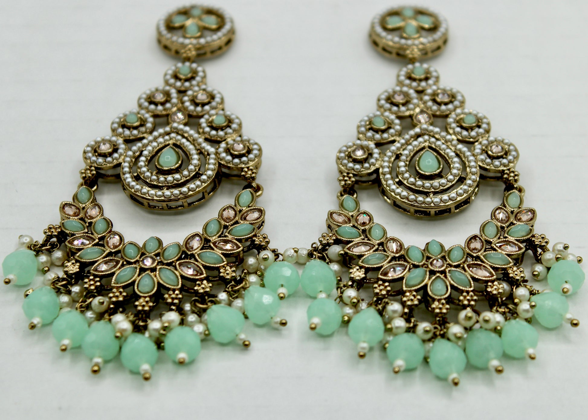 These dazzling earrings are complete with faux pearl, diamante and bead detailing throughout in a striking sage and are set in a bronze base. They are the perfect way to accessorize any look and are suitable for all ages and occasions.