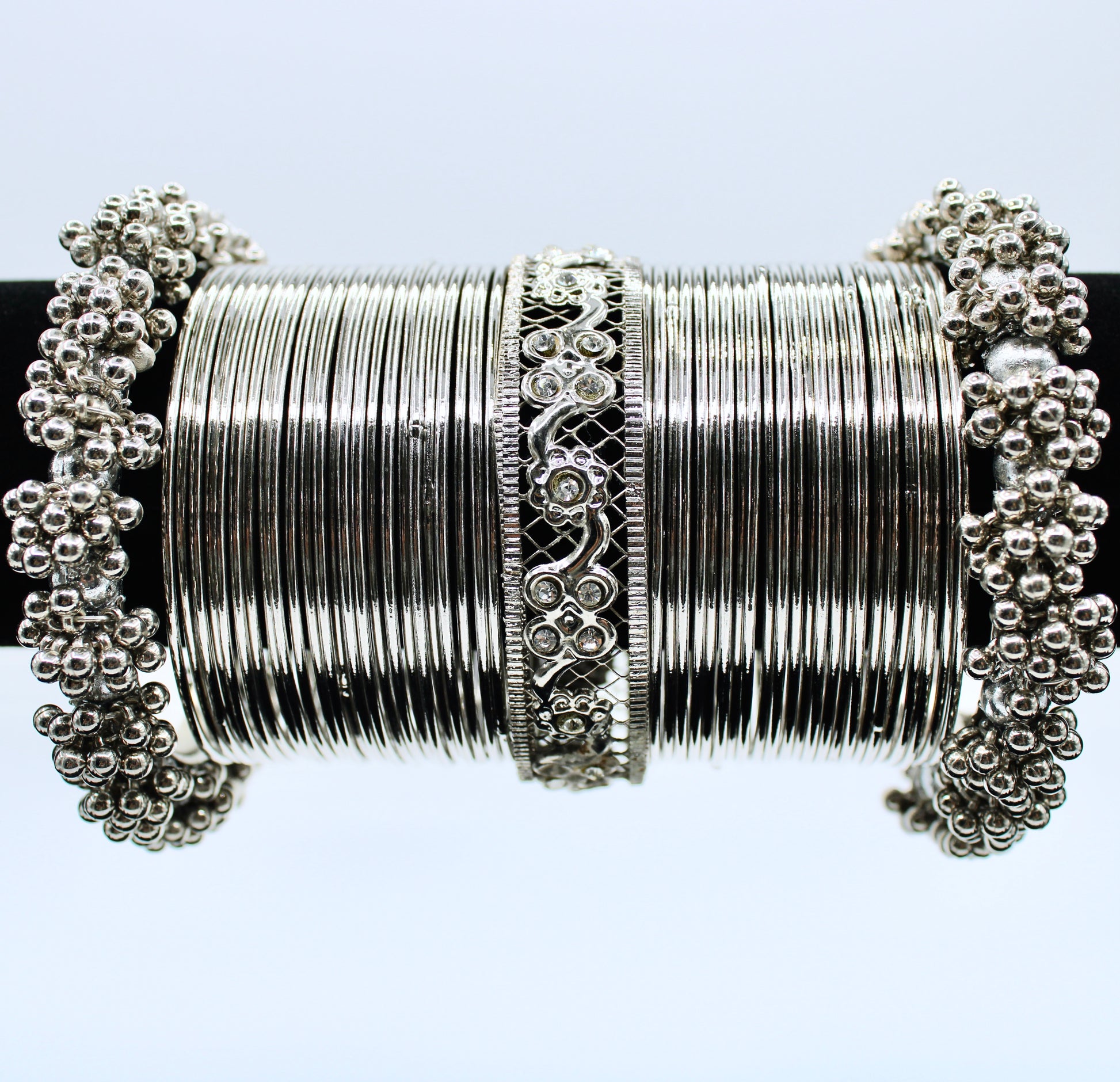 This classic golden bangle and kada set has silver pearl-like detailing on the kadas and is complete with sleek silver bangles. This set is suitable for all ages, occasions, and outfits.