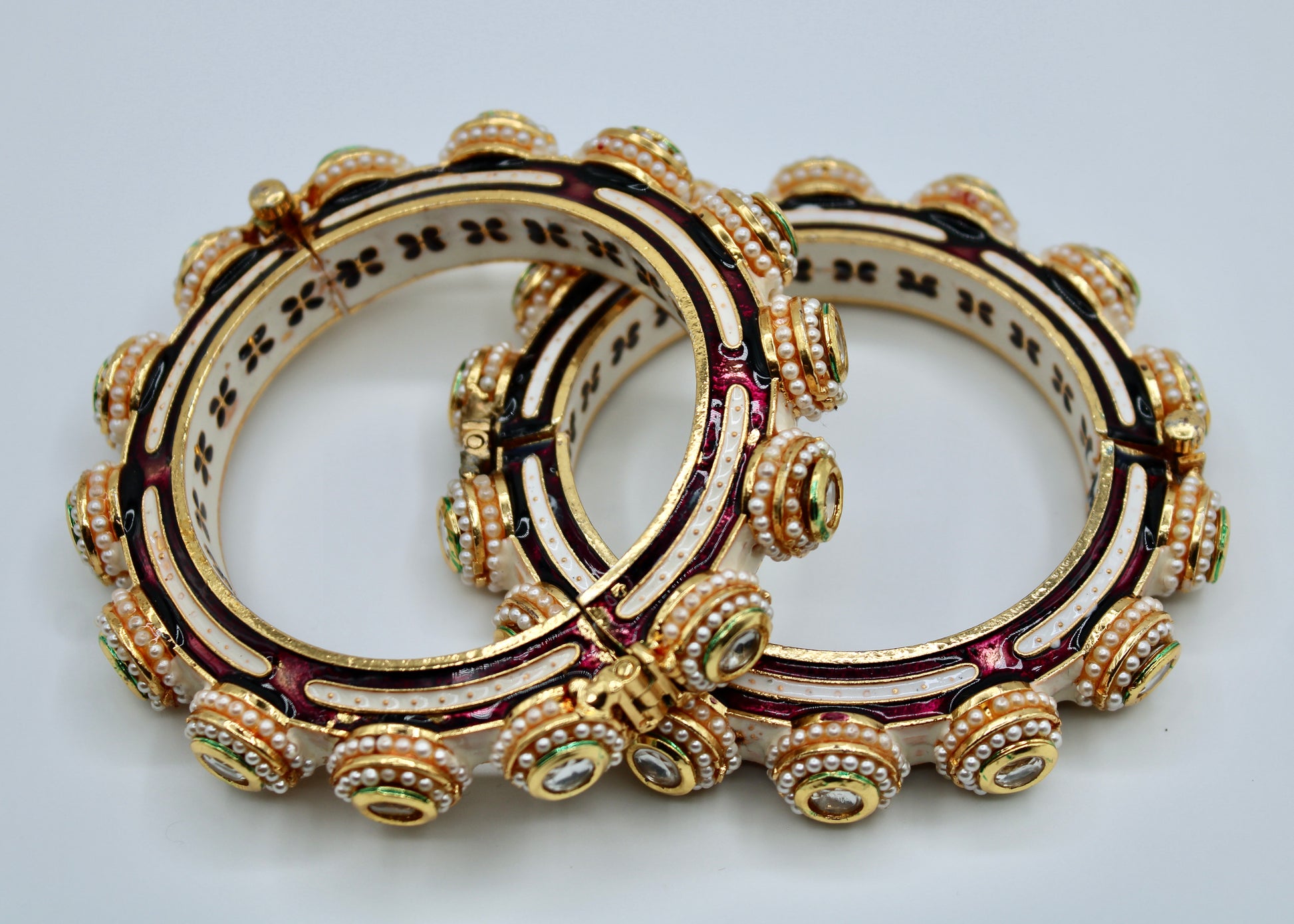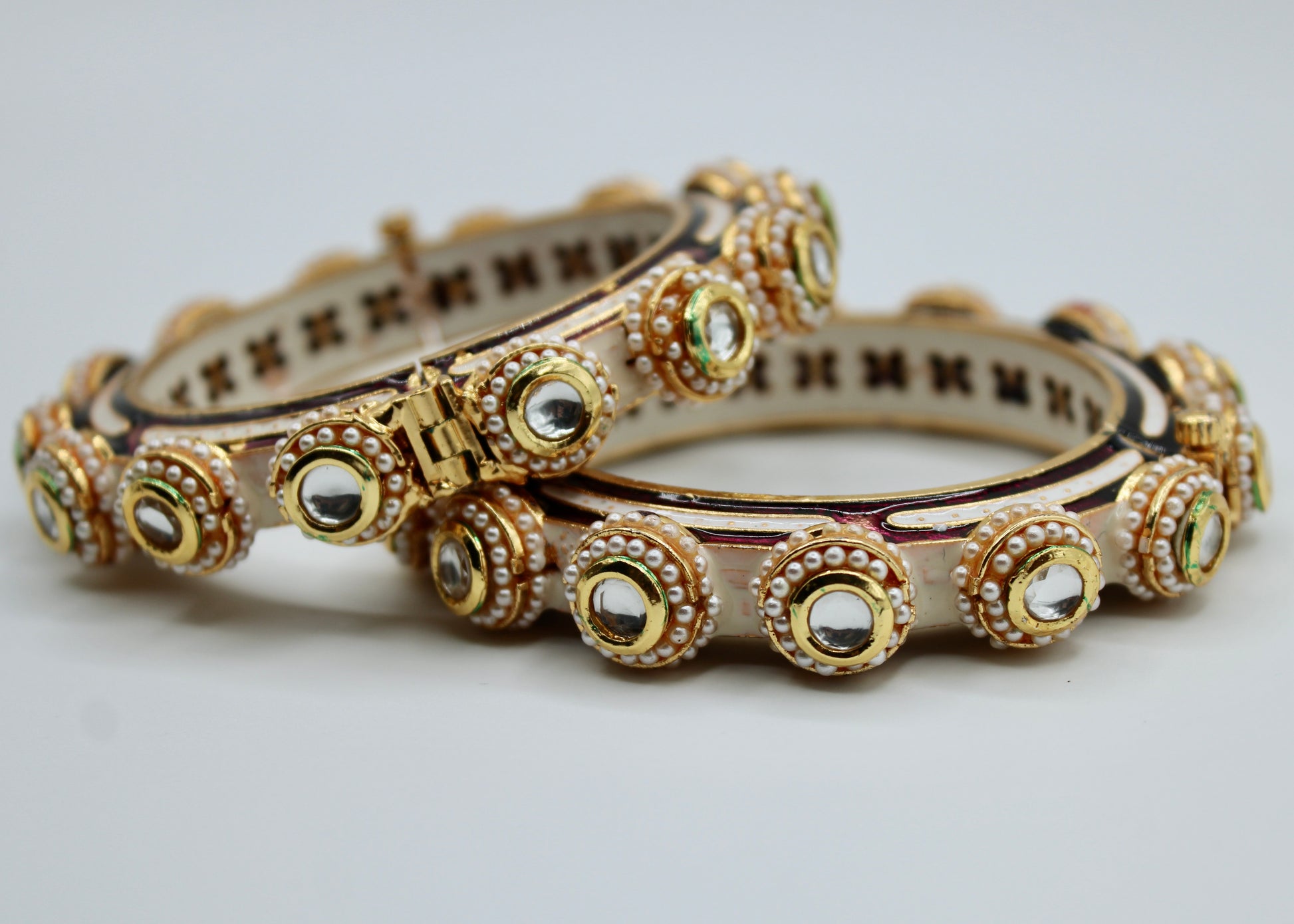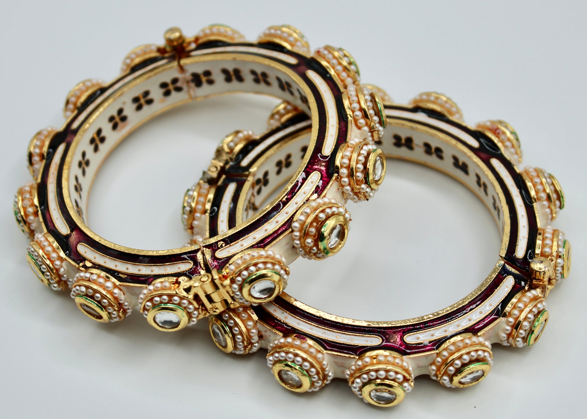 This elegant hand-made meena kari kada features jadao kundan detailings along its surface and the kadas perimeter. It is complete with meena kari accents studded with pearls and a floral interior with screw-in clasps. This design is sold in singles.