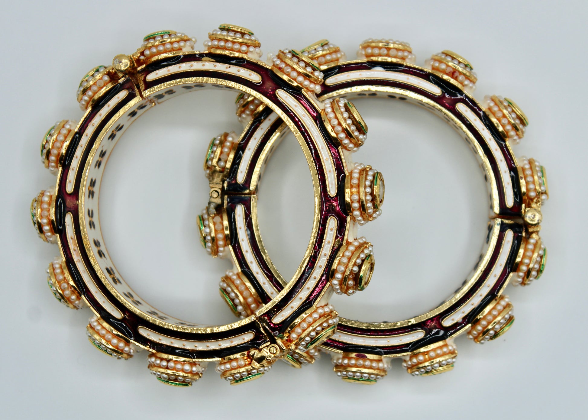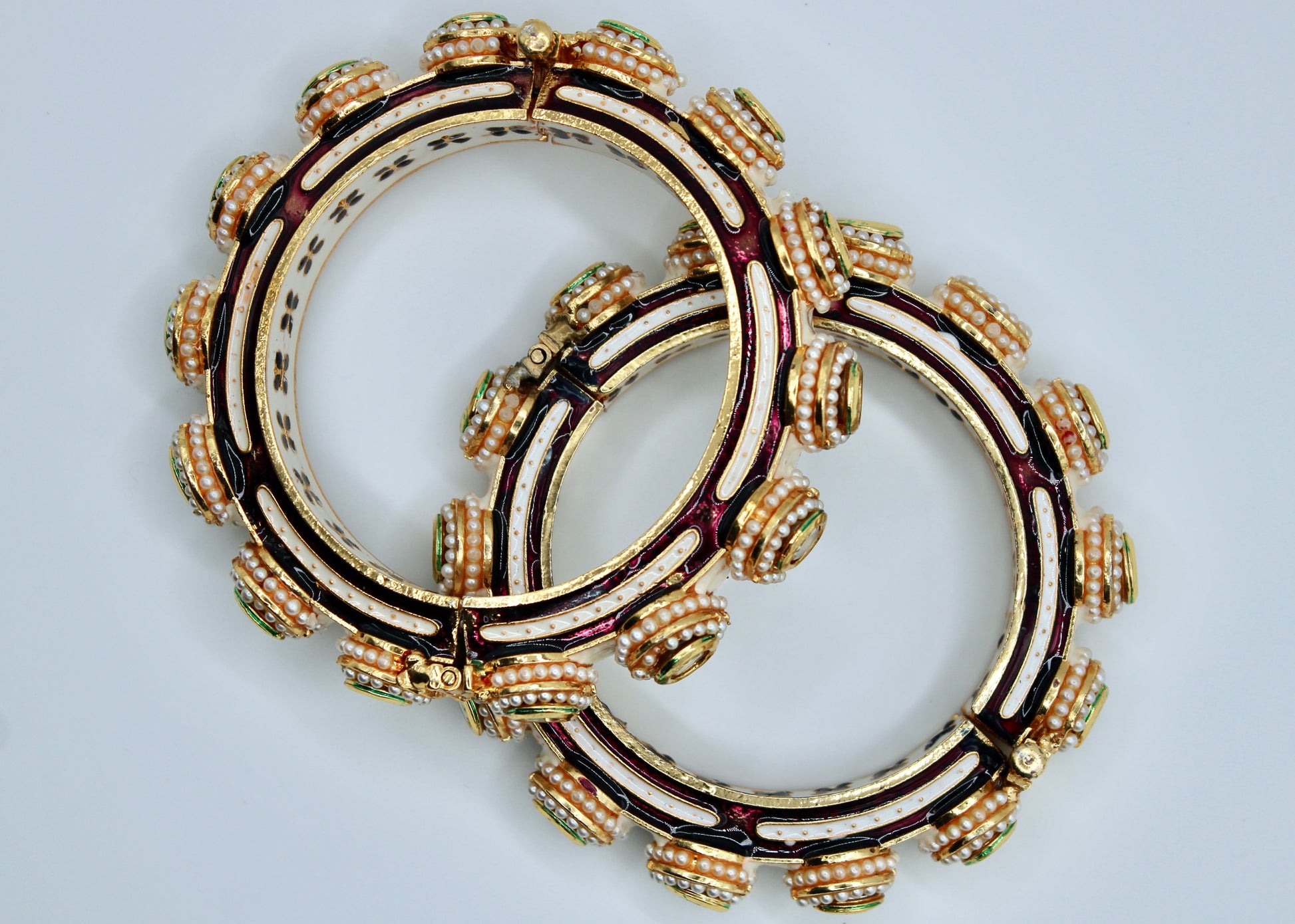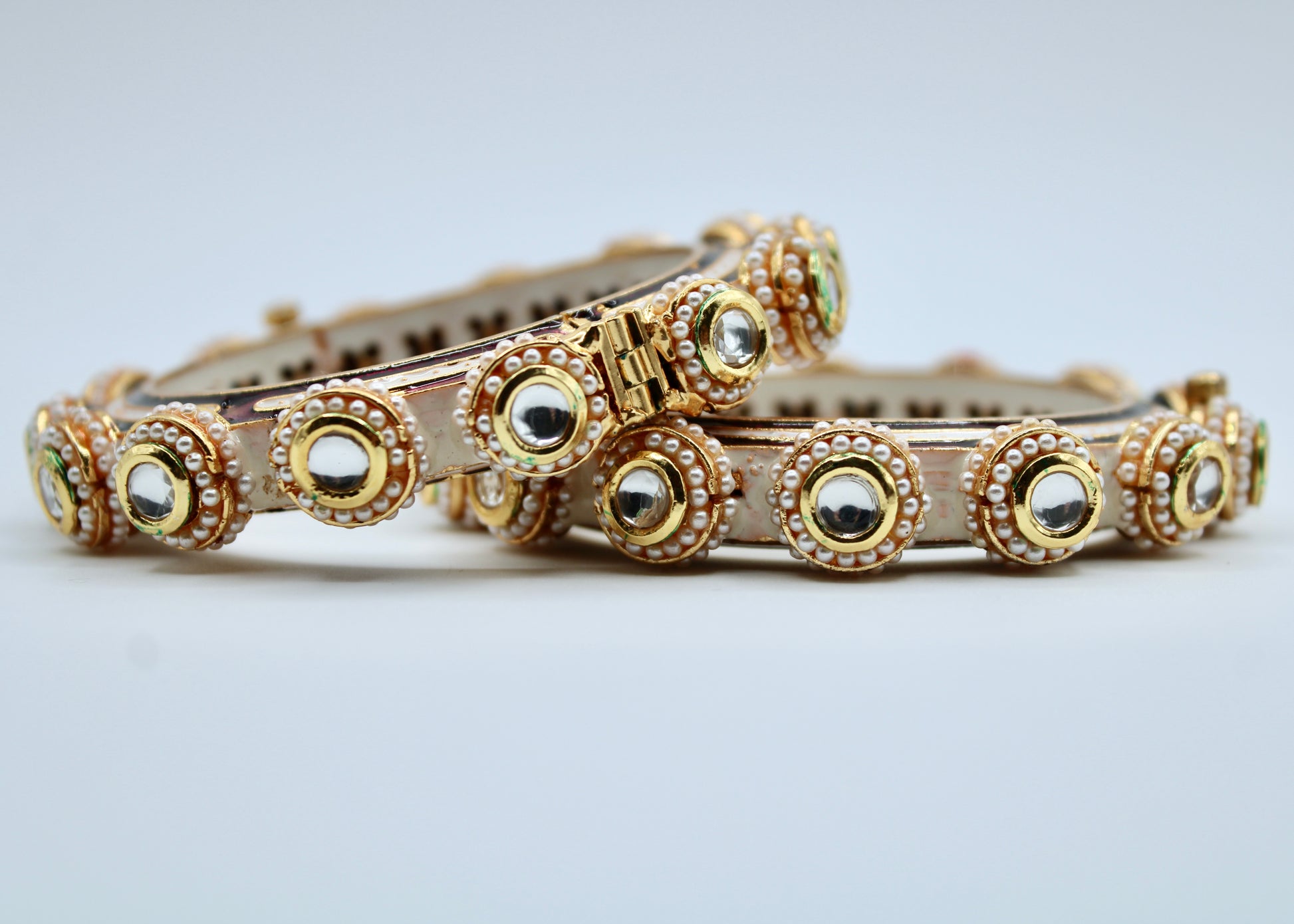 This elegant hand-made meena kari kada features jadao kundan detailings along its surface and the kadas perimeter. It is complete with meena kari accents studded with pearls and a floral interior with screw-in clasps. This design is sold in singles.
