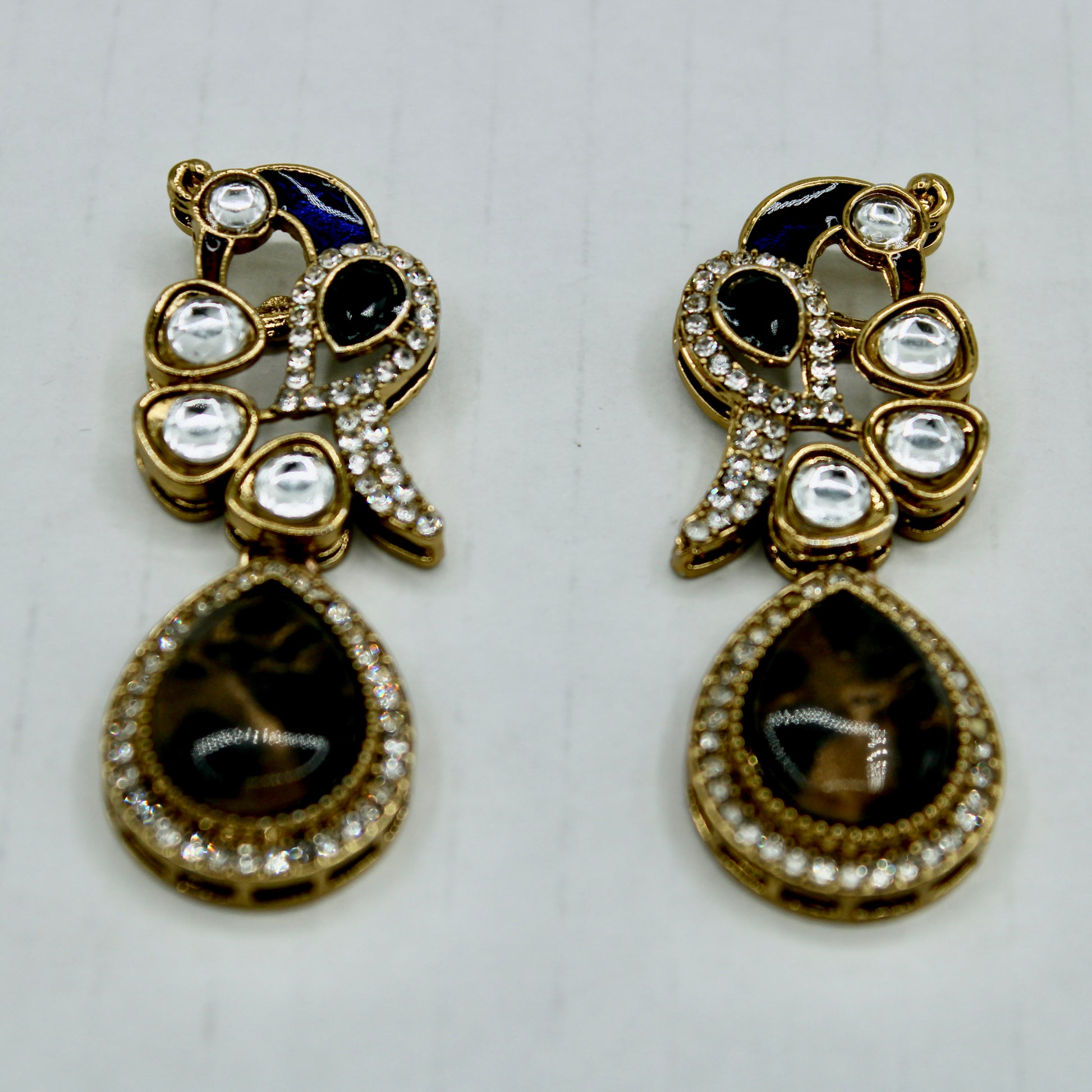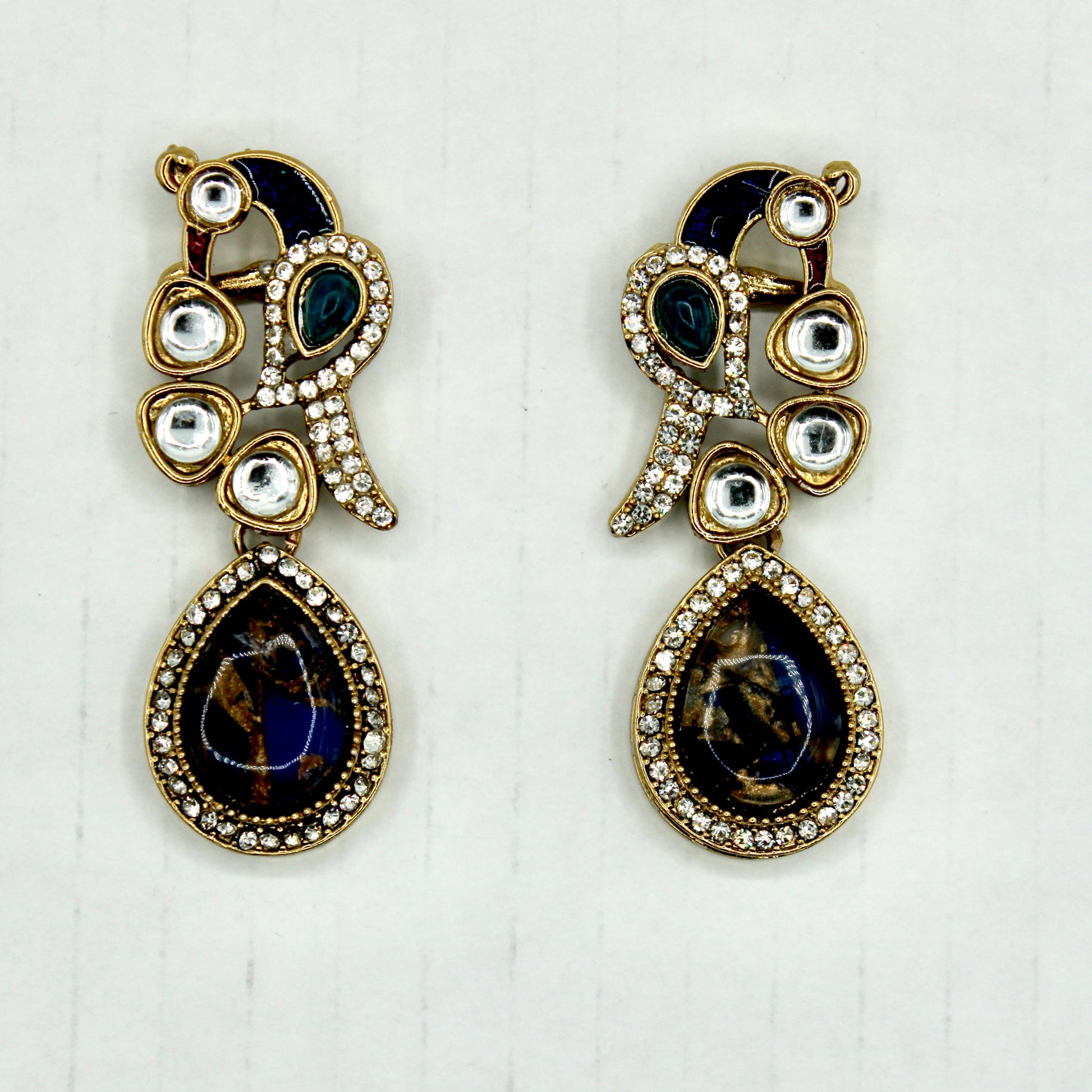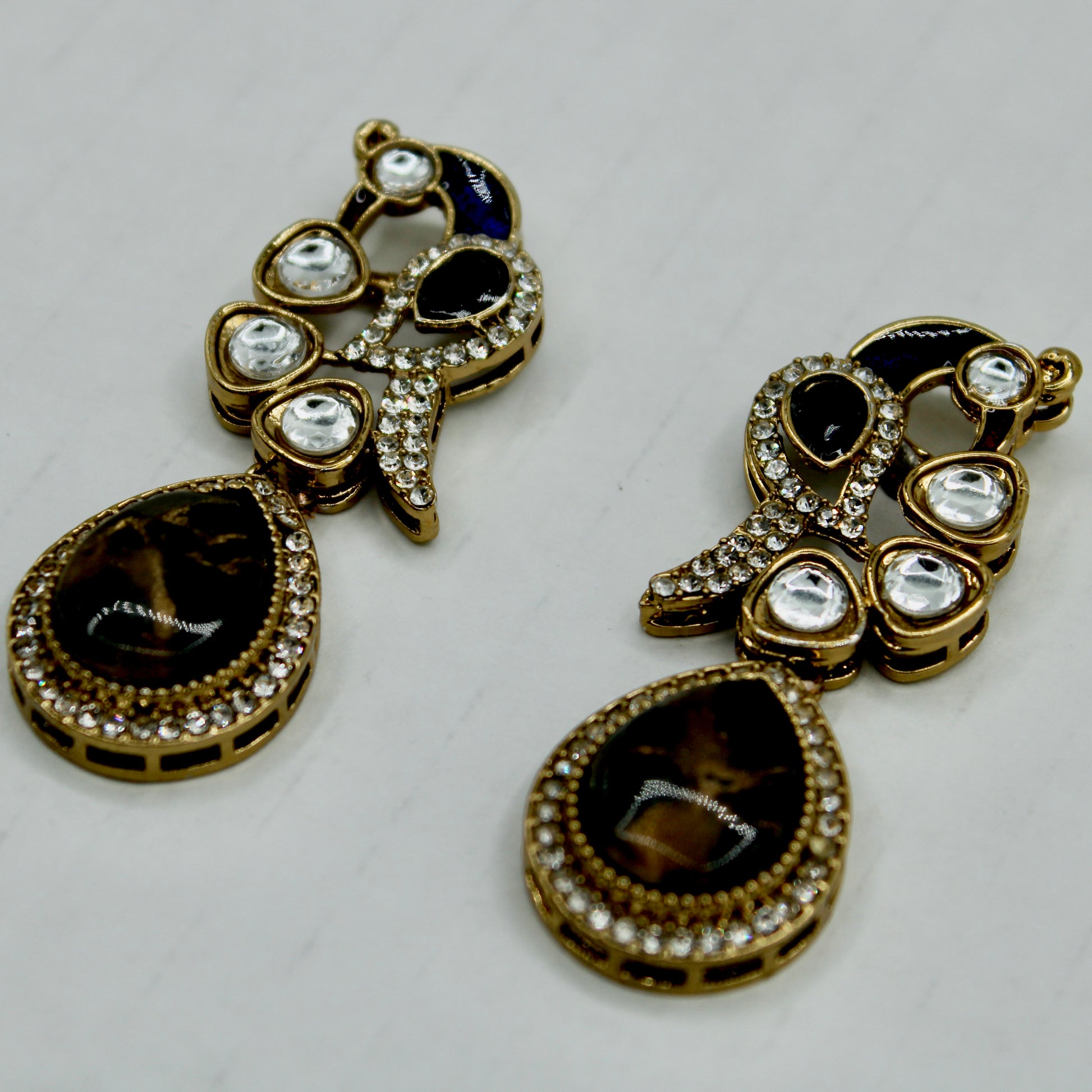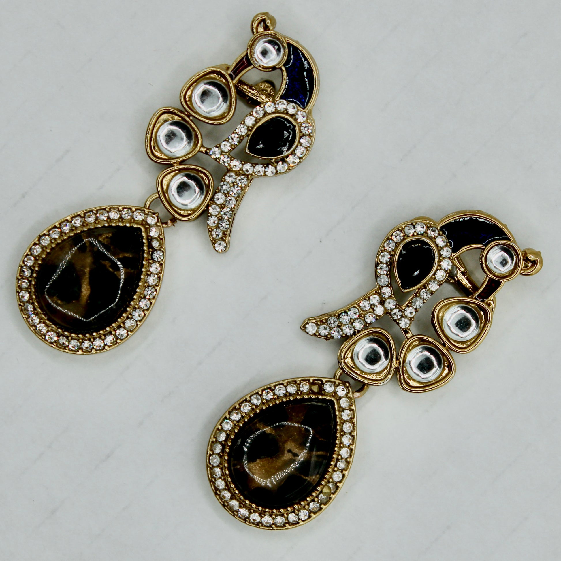 These unique earrings are complete with cubic zirconia and kundan detailing throughout, and a centred marbled stone. They can also be paired with both Eastern and Western looks, and are suitable for all ages.