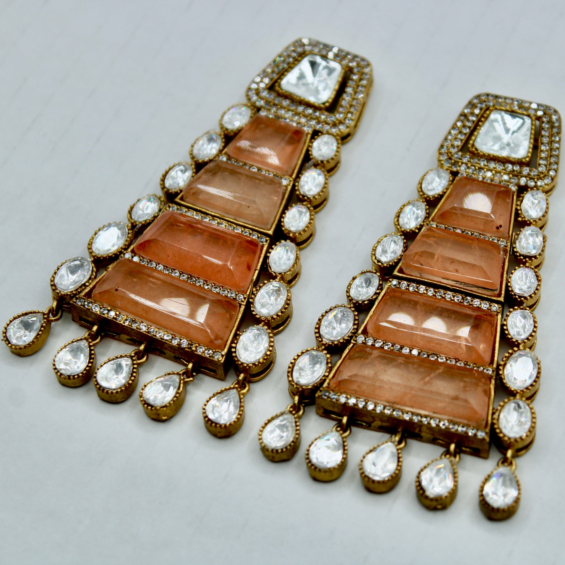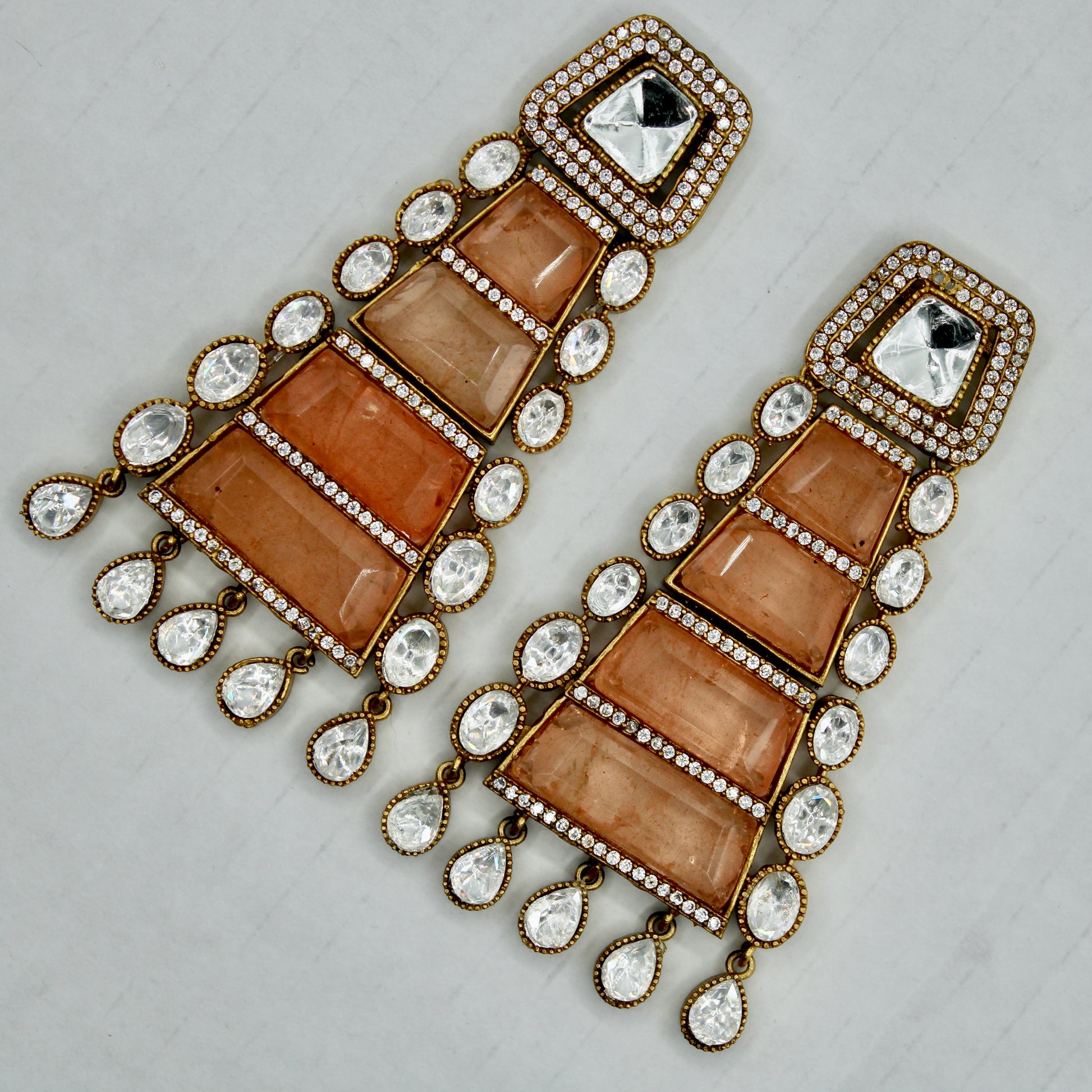 These stunning cocktail earrings are complete with moissanite detailing throughout and vibrant orange stones. They can be paired with both Eastern and Western looks, and are suitable for all ages.