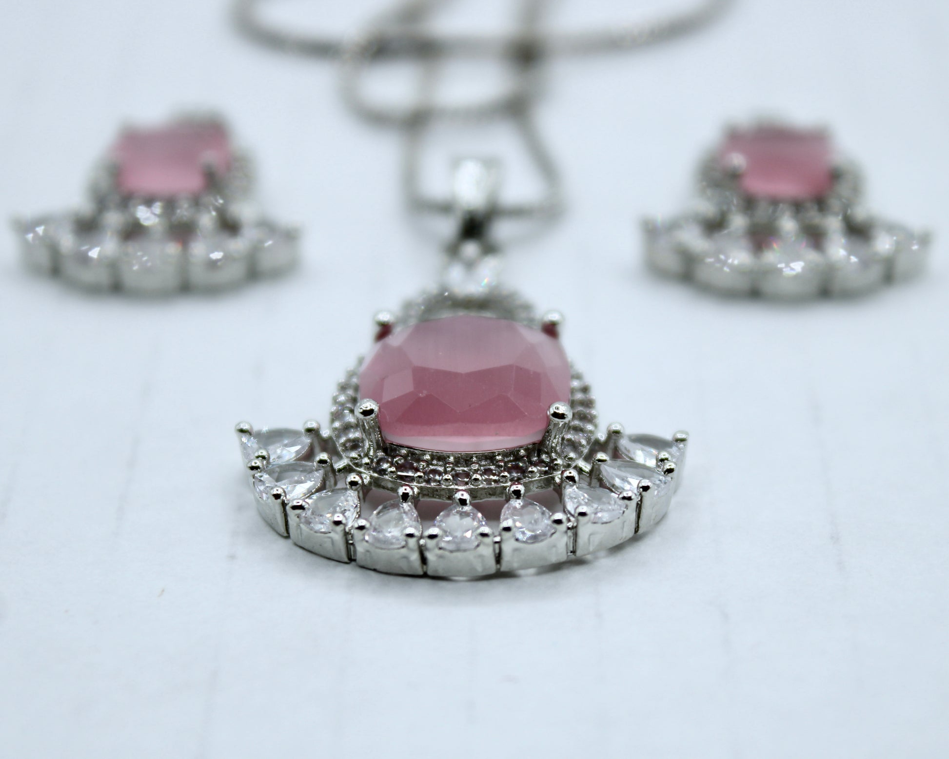 This dazzling pendant set is complete with a centred old mine cut Mona-lisa stone in pink. This design can easily be paired with any outfit and is suitable for all ages. It is complete with matching studs and a chain.