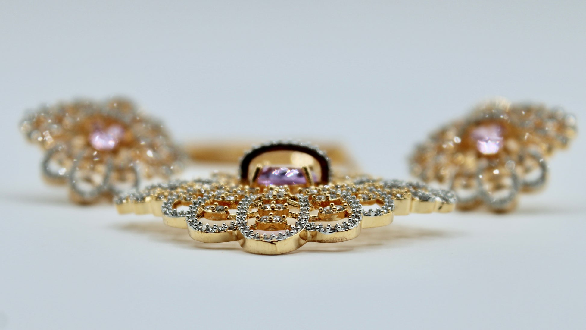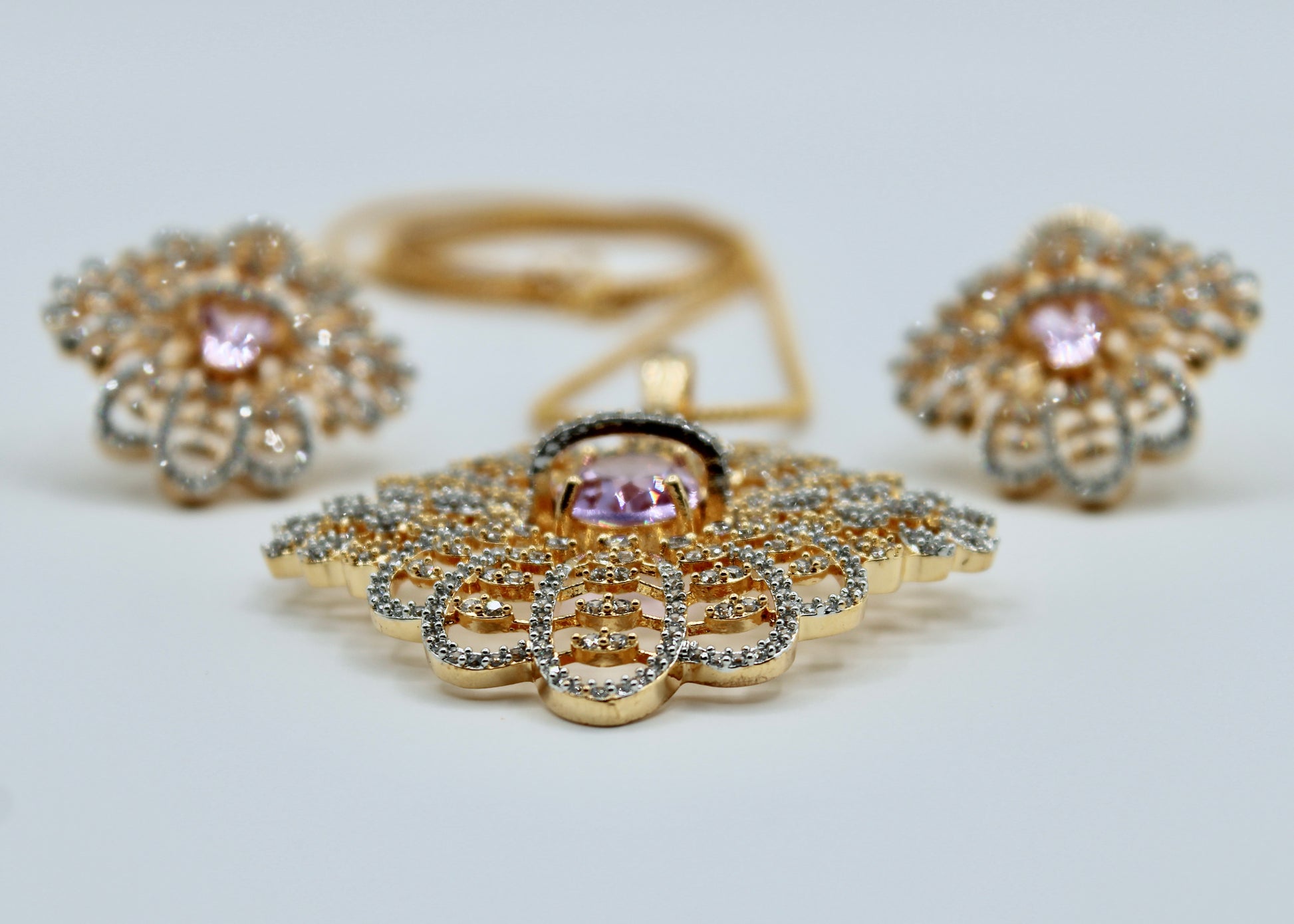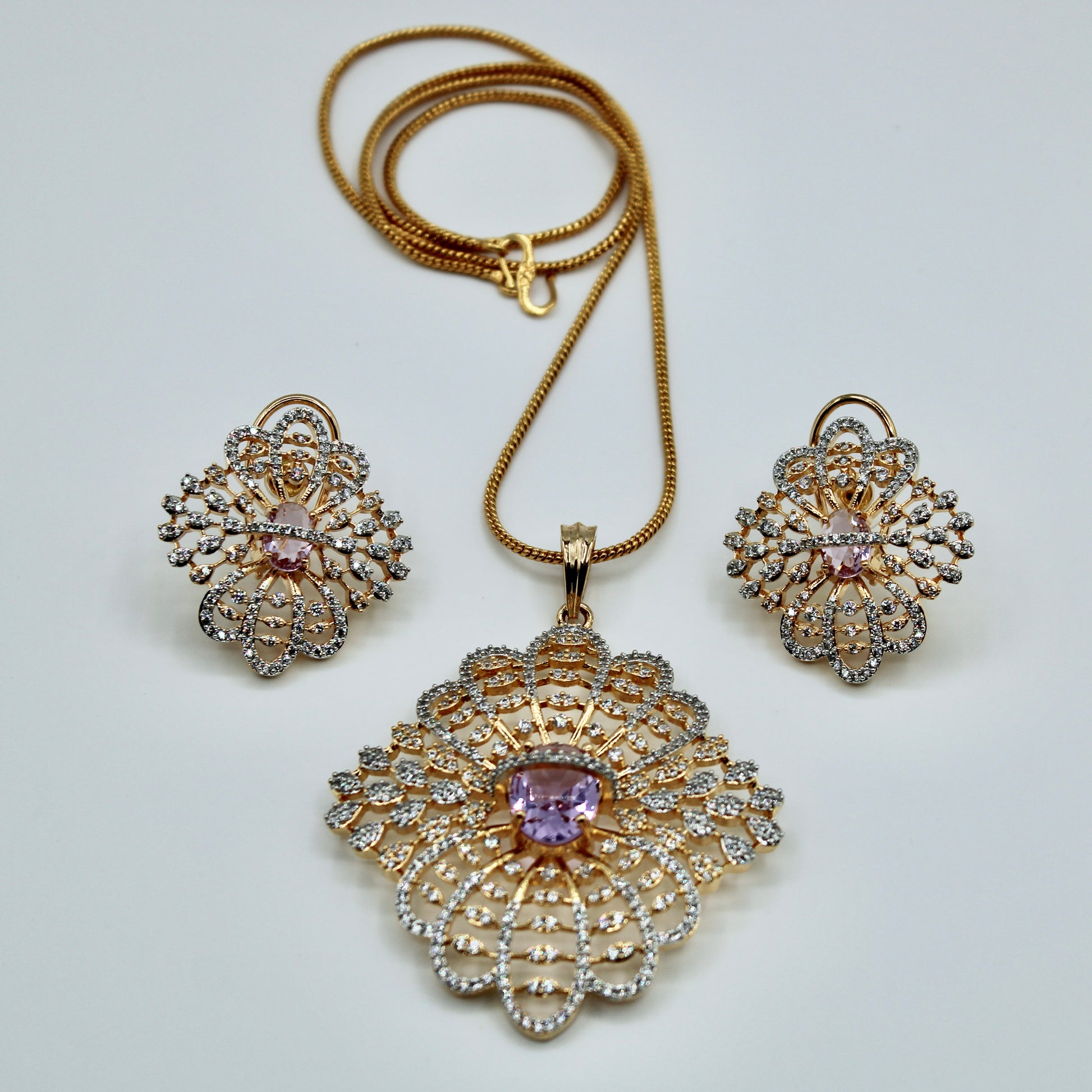 This delicate pendant set is complete with cubic zirconia throughout and a Amethyst coloured oval-cut centred stone. It is complete with matching studs and a chain.