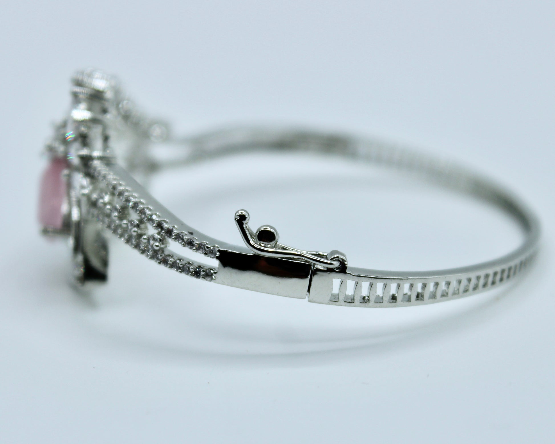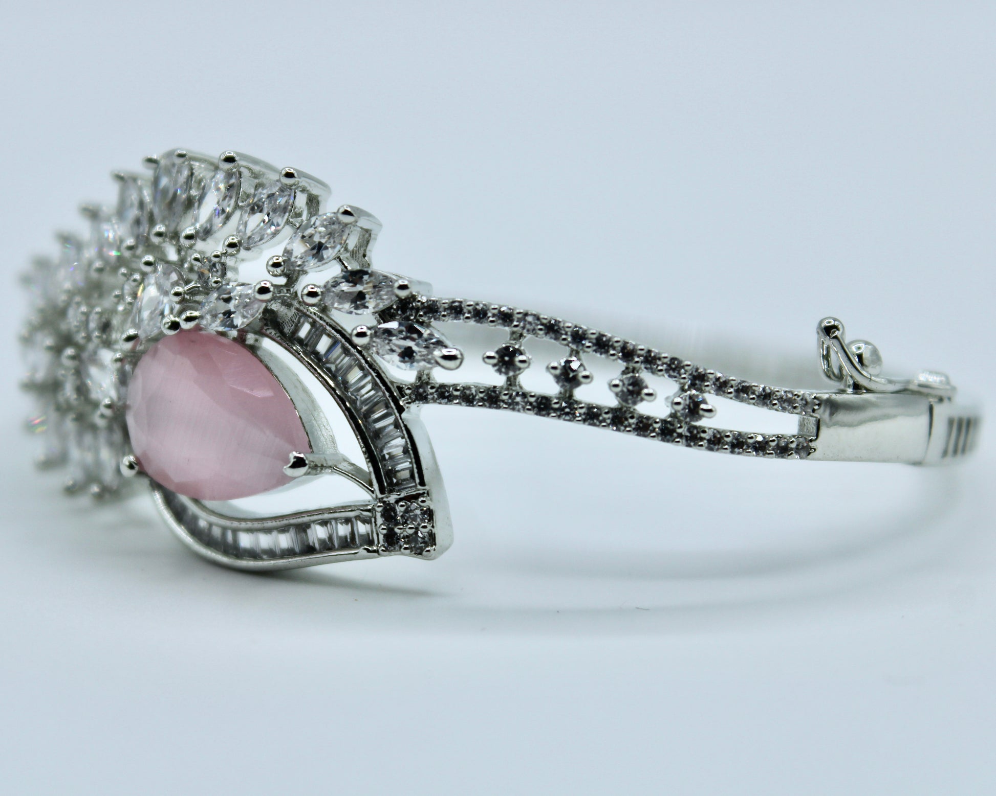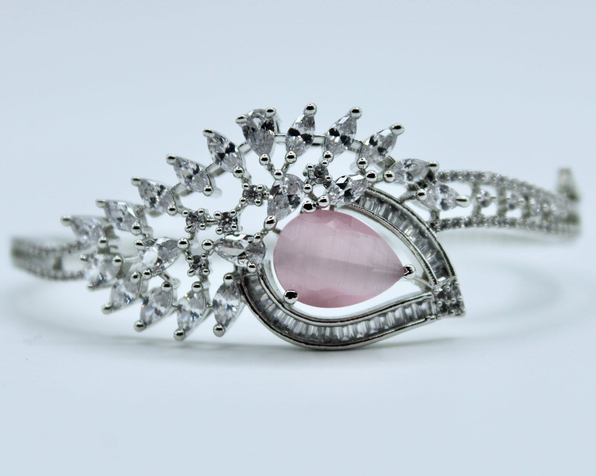 This stunning cubic zirconia bracelet features cubic zirconia studding and a pear-cut centered cubic zirconia. It is complete with a clasp and is openable. This design can be easily styled up or down and can be paired with both Eastern and Western looks.
