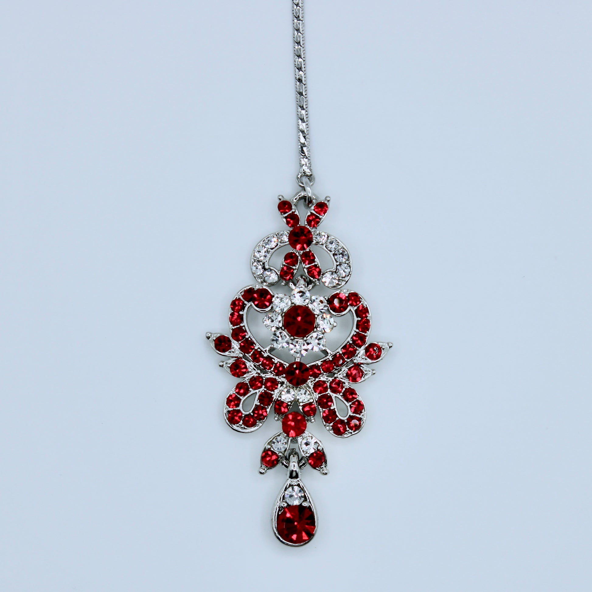 This unique teeka is studded with cubic zirconia throughout. The stunning combination of red and silver is both classy and timeless. It is suitable for all ages and occasions, and can easily be paired with other pieces of jewelry.