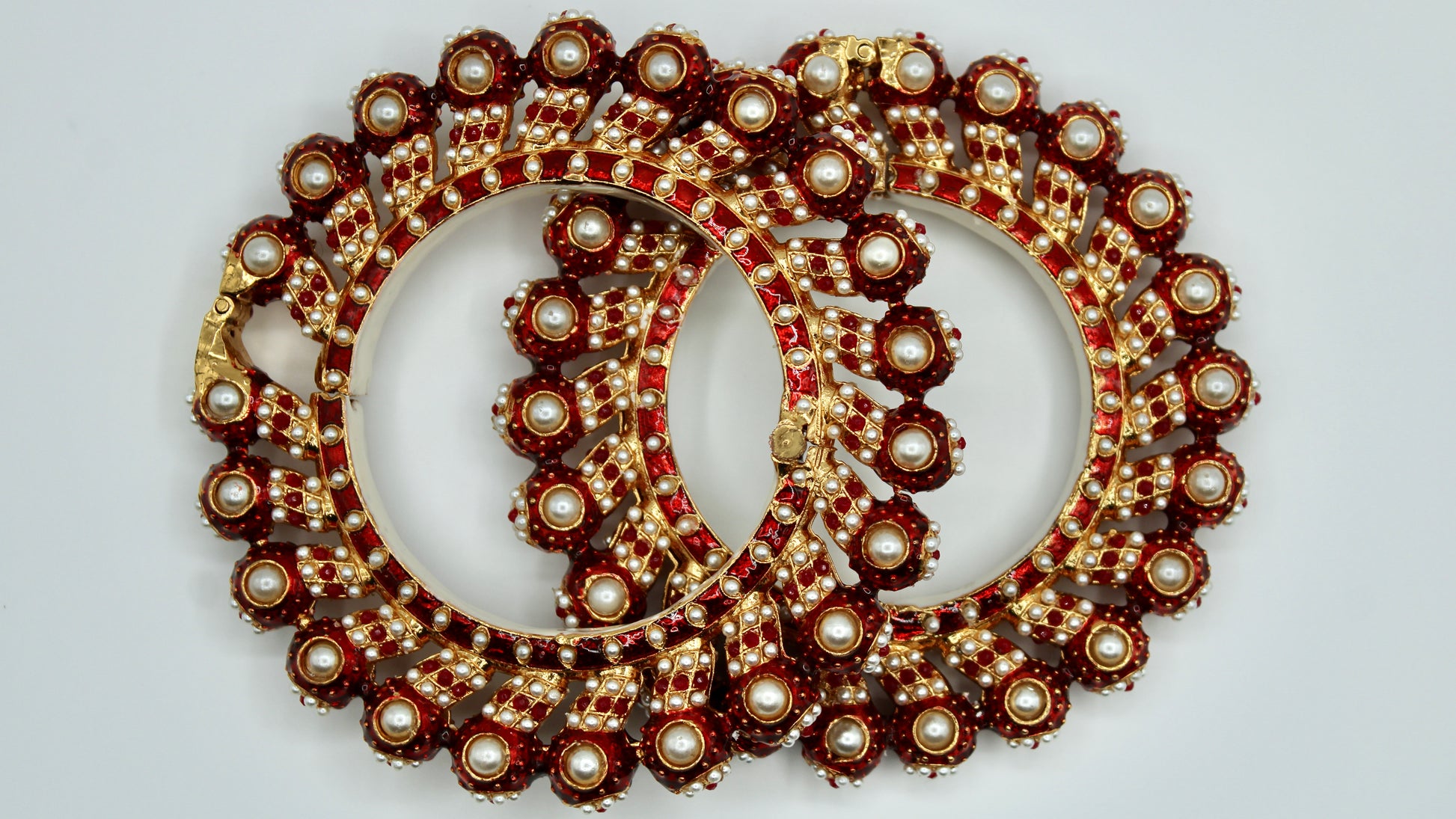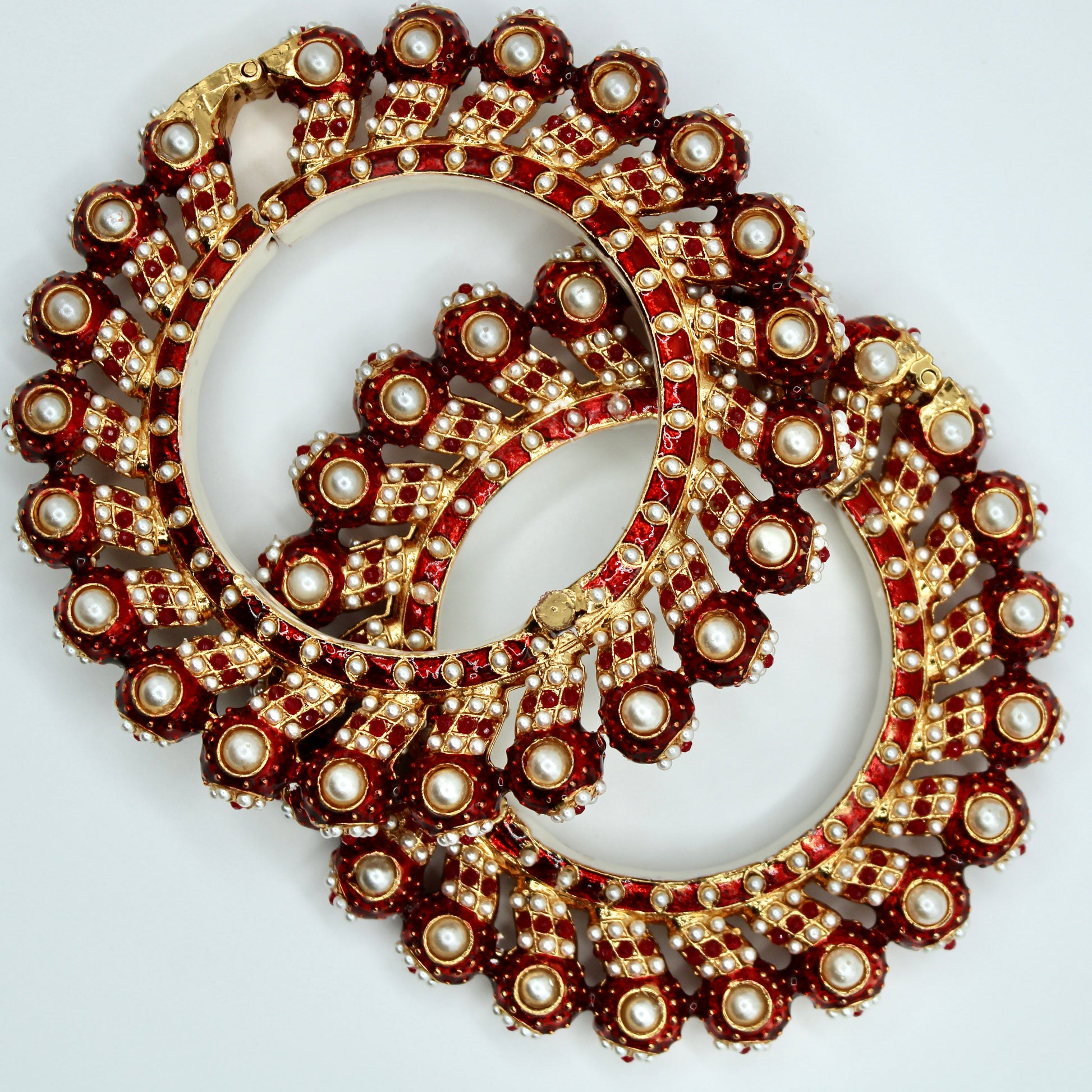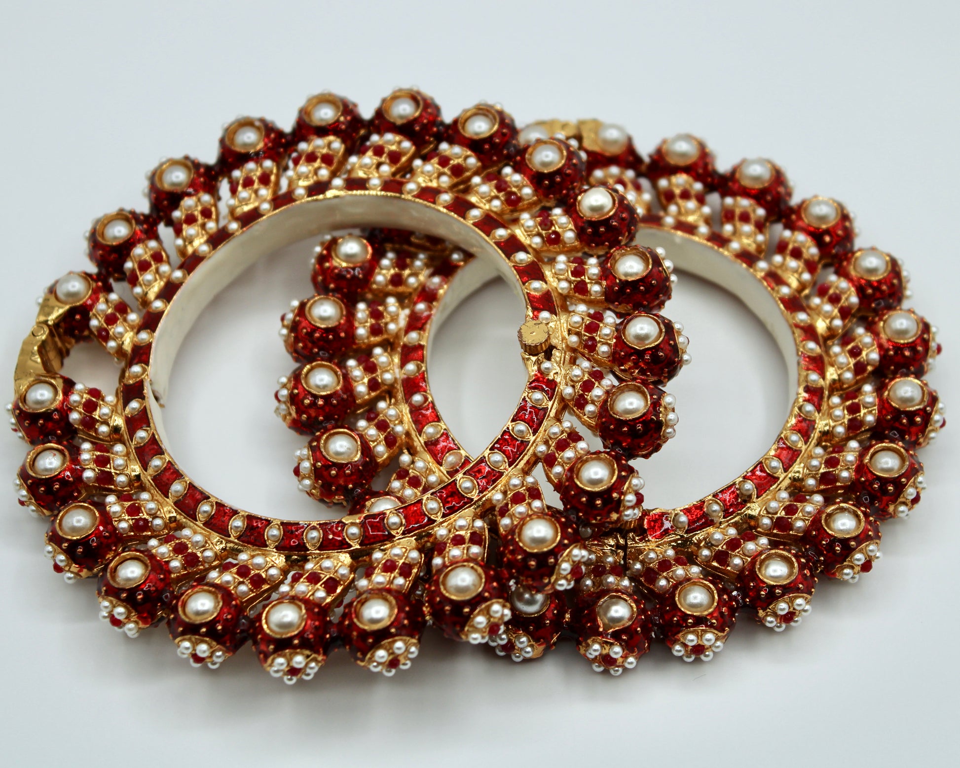 This hand-made meena kari kada features jadao pearl detailing throughout and along the kadas perimeter. It is complete with gold accents and a screw-in clasps. It can easily be paired with a bridal outfit for a timeless look. This design is sold in singles.