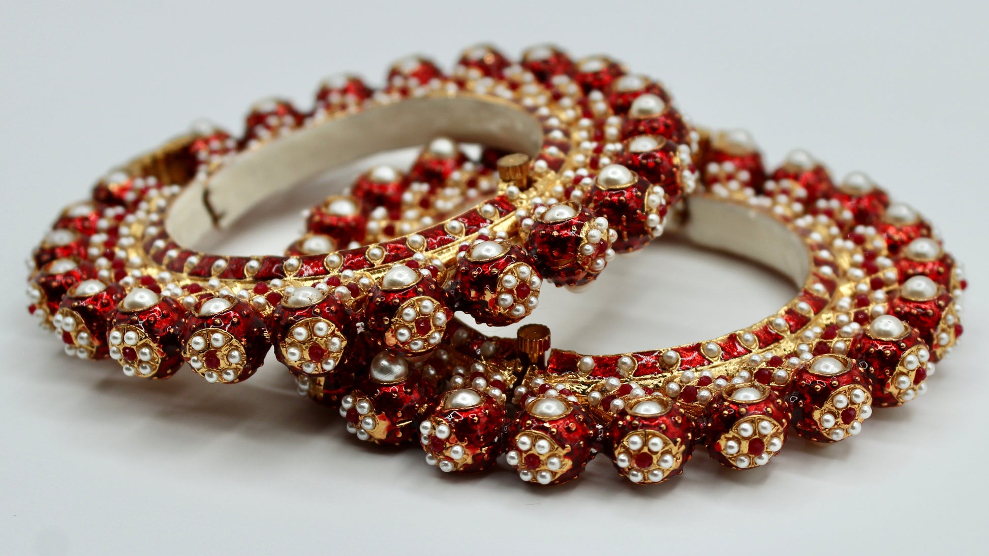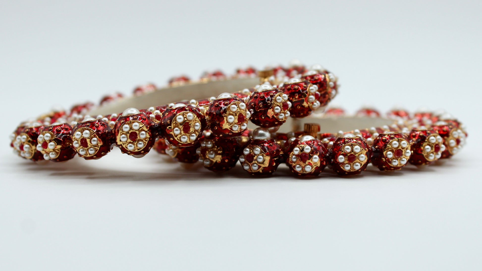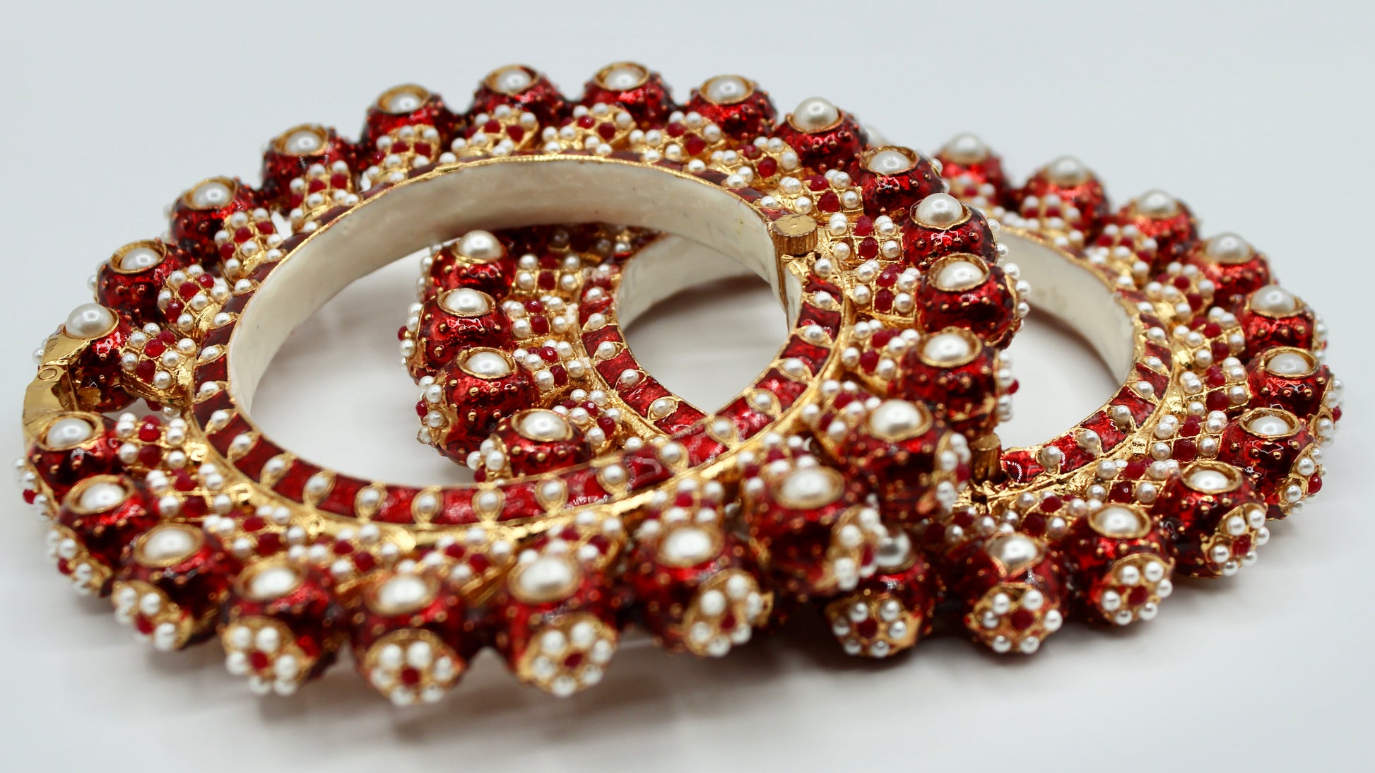 This hand-made meena kari kada features jadao pearl detailing throughout and along the kadas perimeter. It is complete with gold accents and a screw-in clasps. It can easily be paired with a bridal outfit for a timeless look. This design is sold in singles.