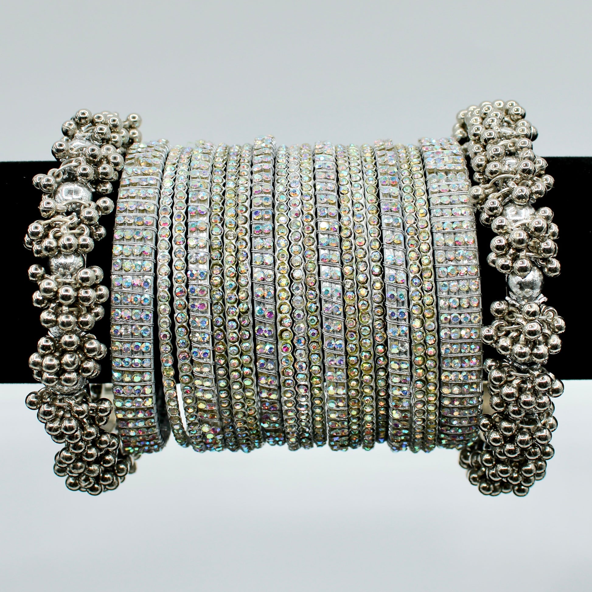 This ethereal bangle and kada set is complete with silver pearl-like detailing on the kadas with iridescent rhinestones on the bangles. This set is suitable for all ages, occasions, and outfits.