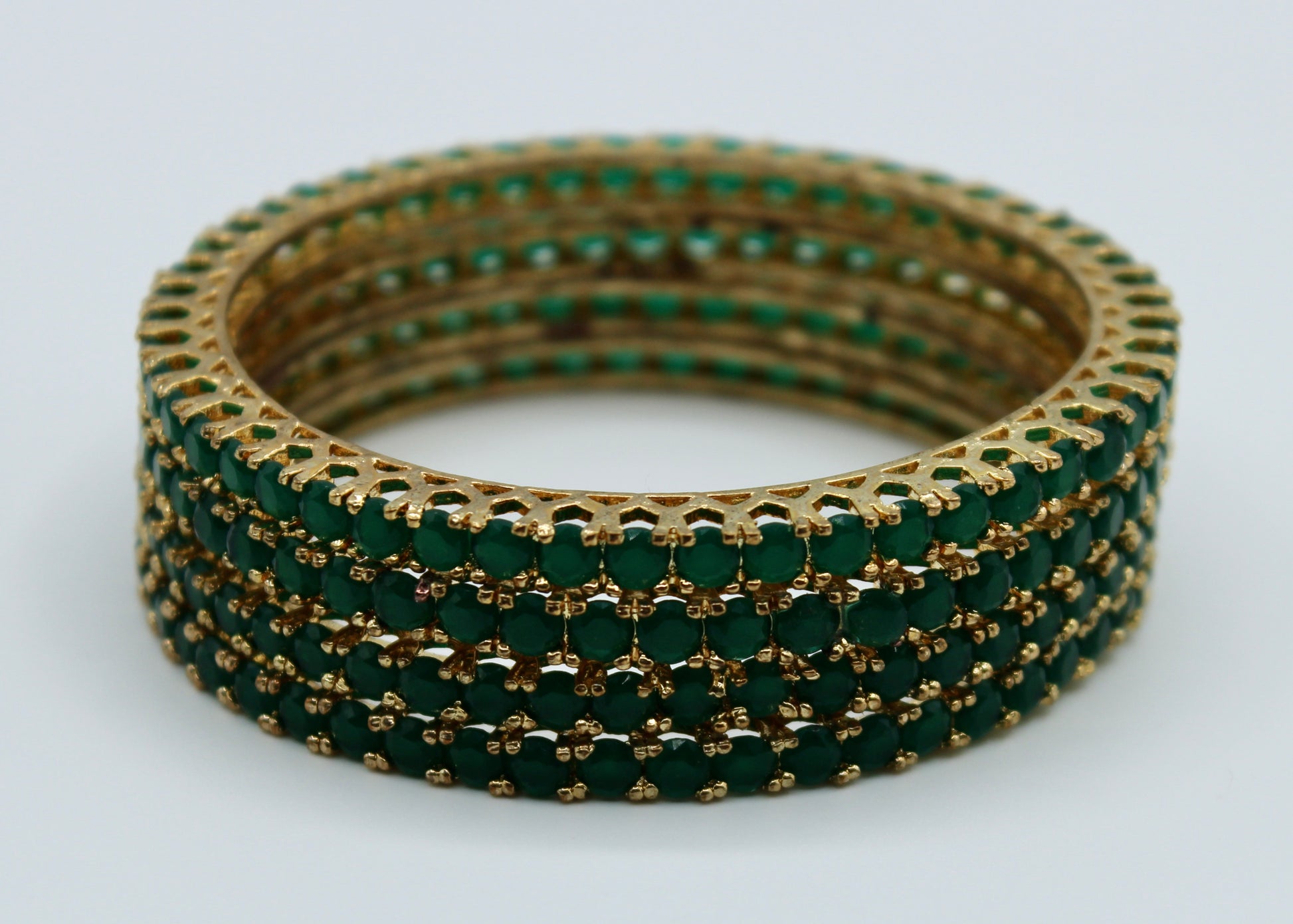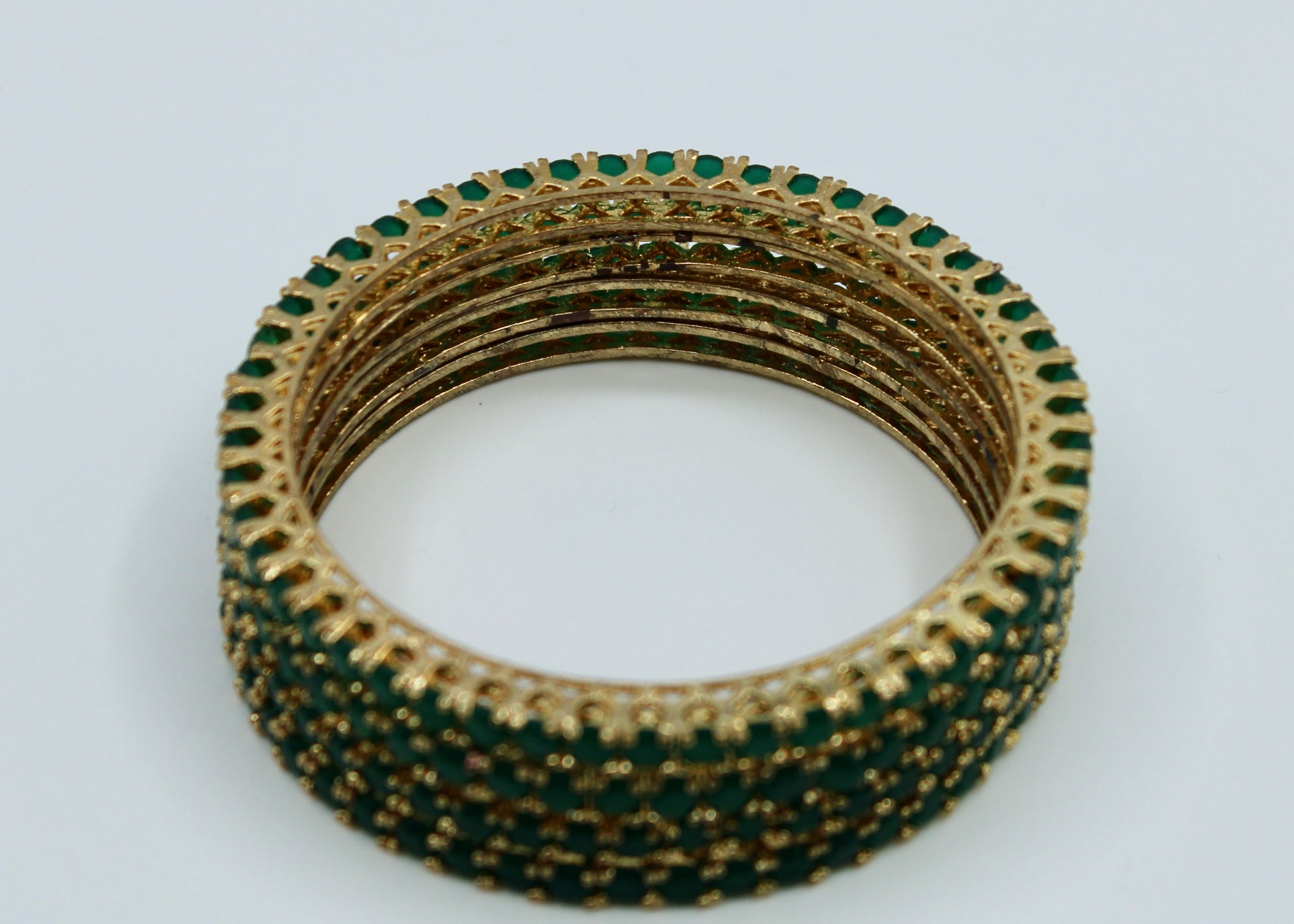 This traditional bangle set is studded with emerald cubic zirconia throughout on a golden base, it is suitable for all ages and occasions and can be paired with both Eastern and Western looks. This design is sold in sets of four.