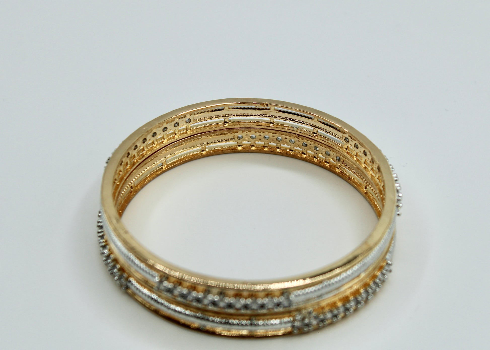 This unique bangle set is studded with cubic zirconia throughout on a two-toned base, making it the perfect way to accessorize any look. It is suitable for all ages and occasions and can be paired with both Eastern and Western looks. This design is sold in pairs.