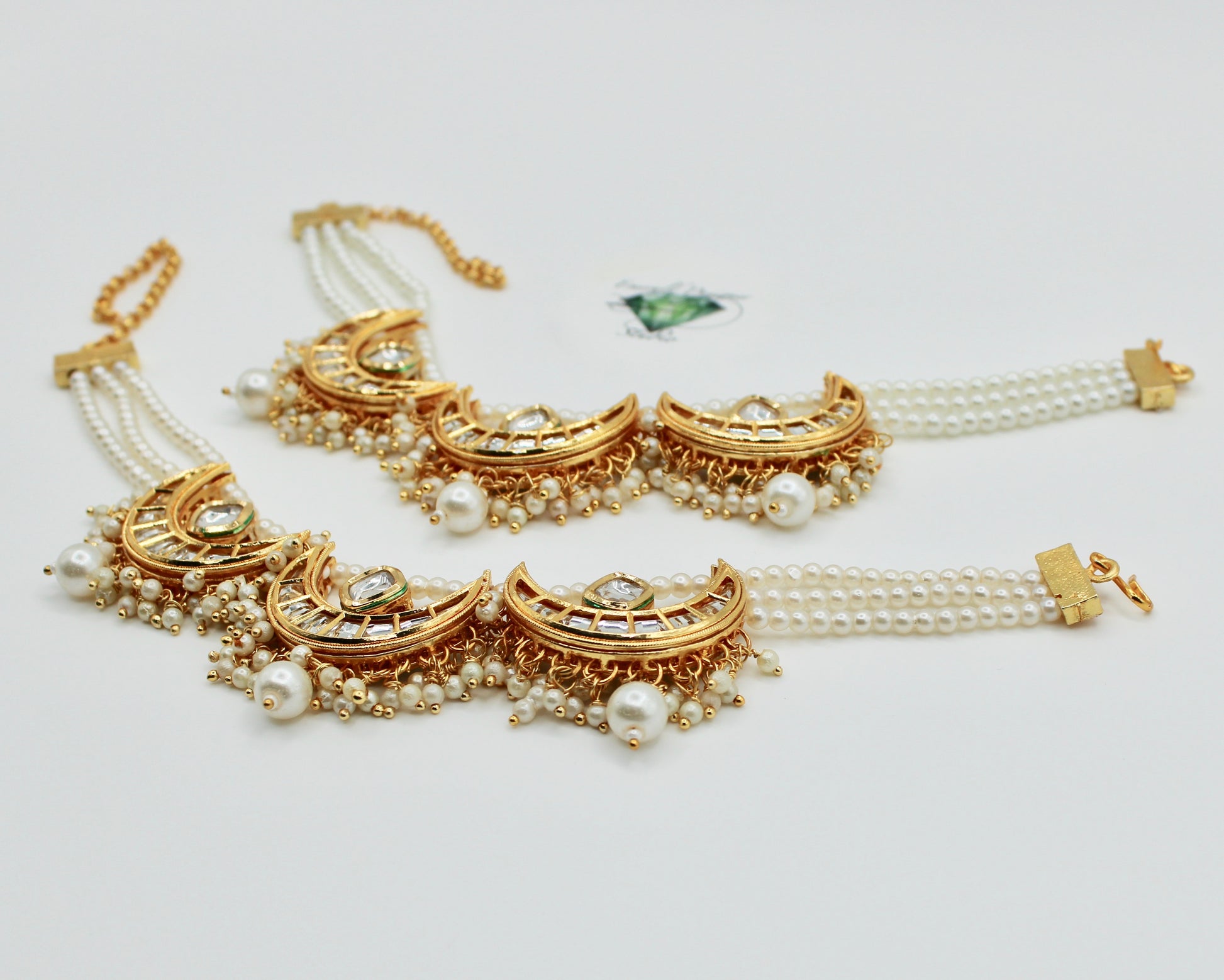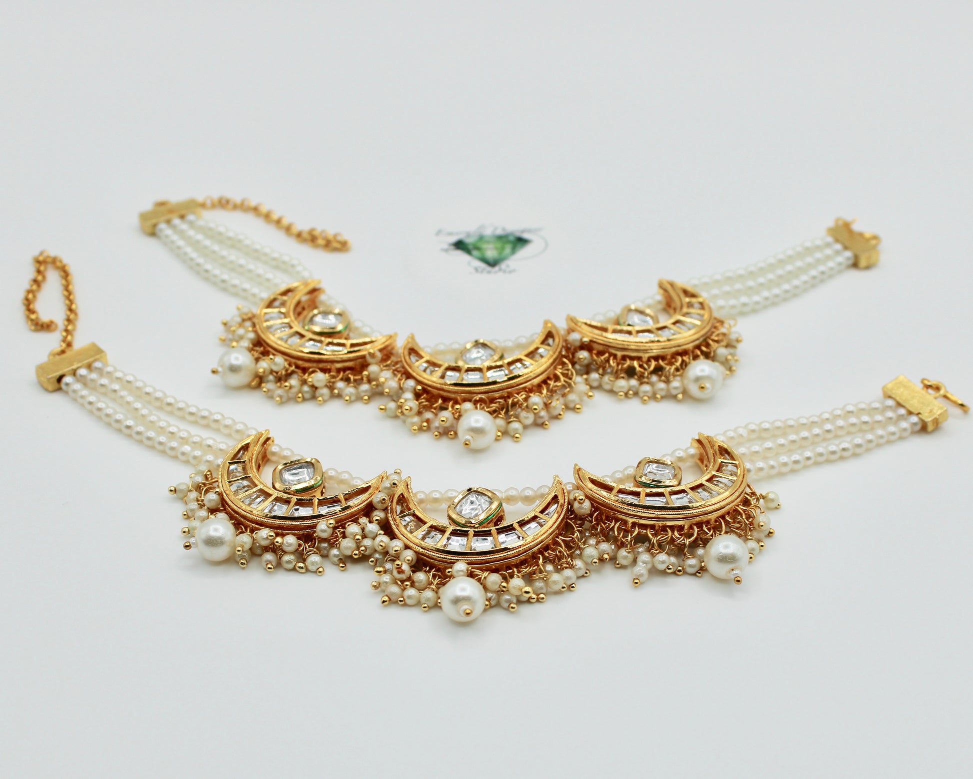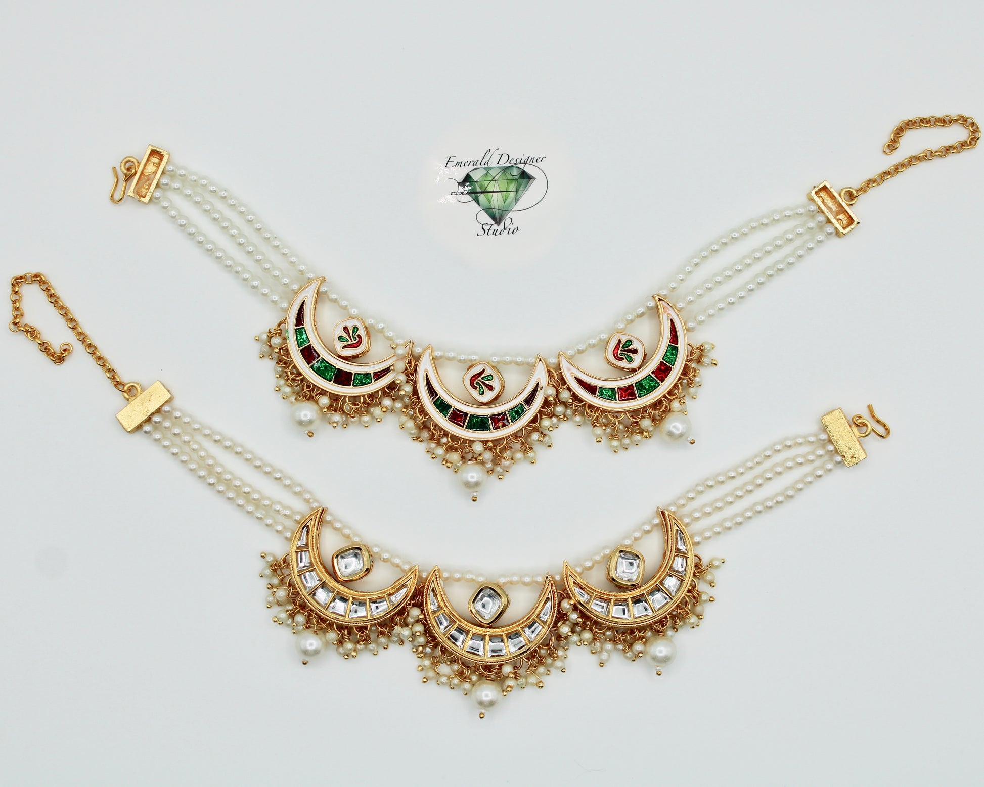 These traditional, anklets are made with meena-kari and kundan, complete with pearl detailing. This design is truly unique and hard to find.