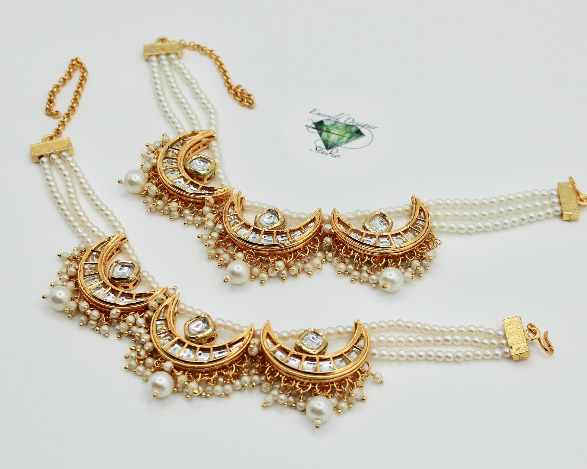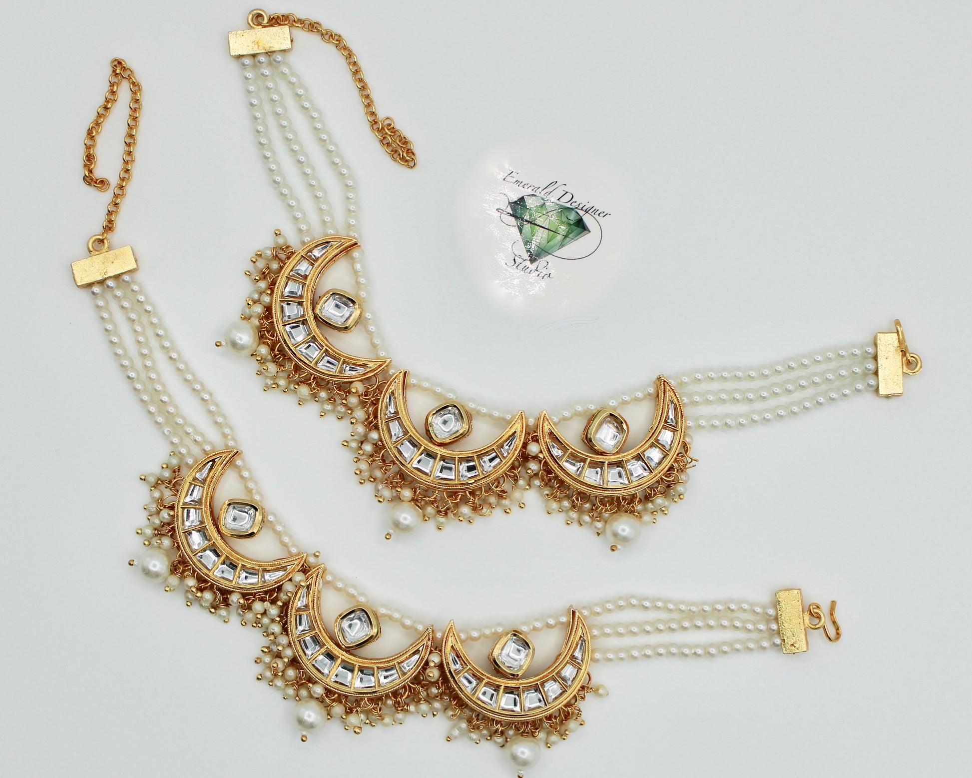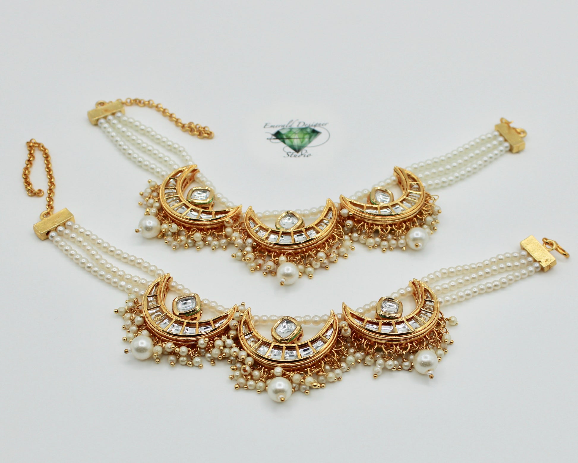 These traditional, anklets are made with meena-kari and kundan, complete with pearl detailing. This design is truly unique and hard to find.