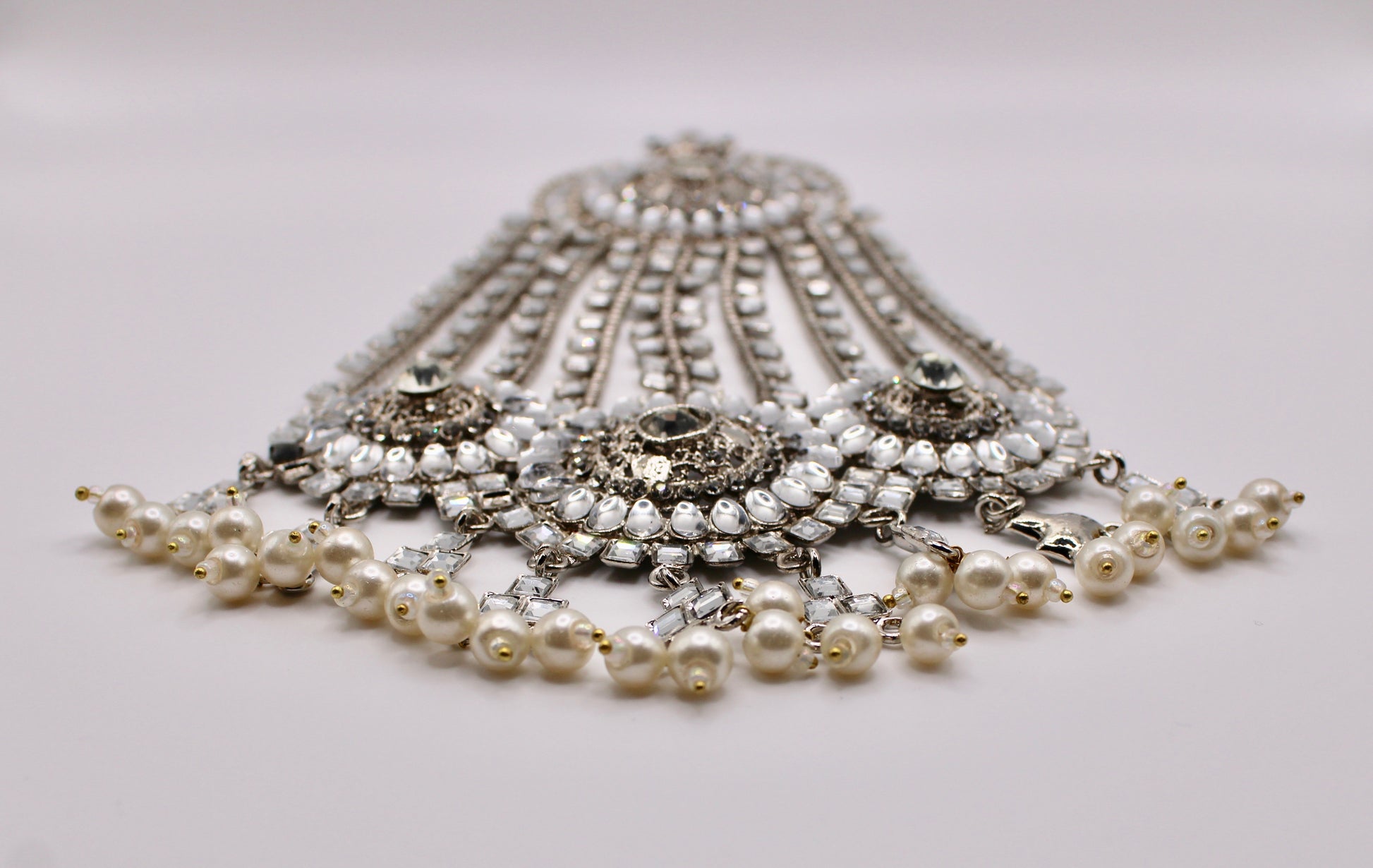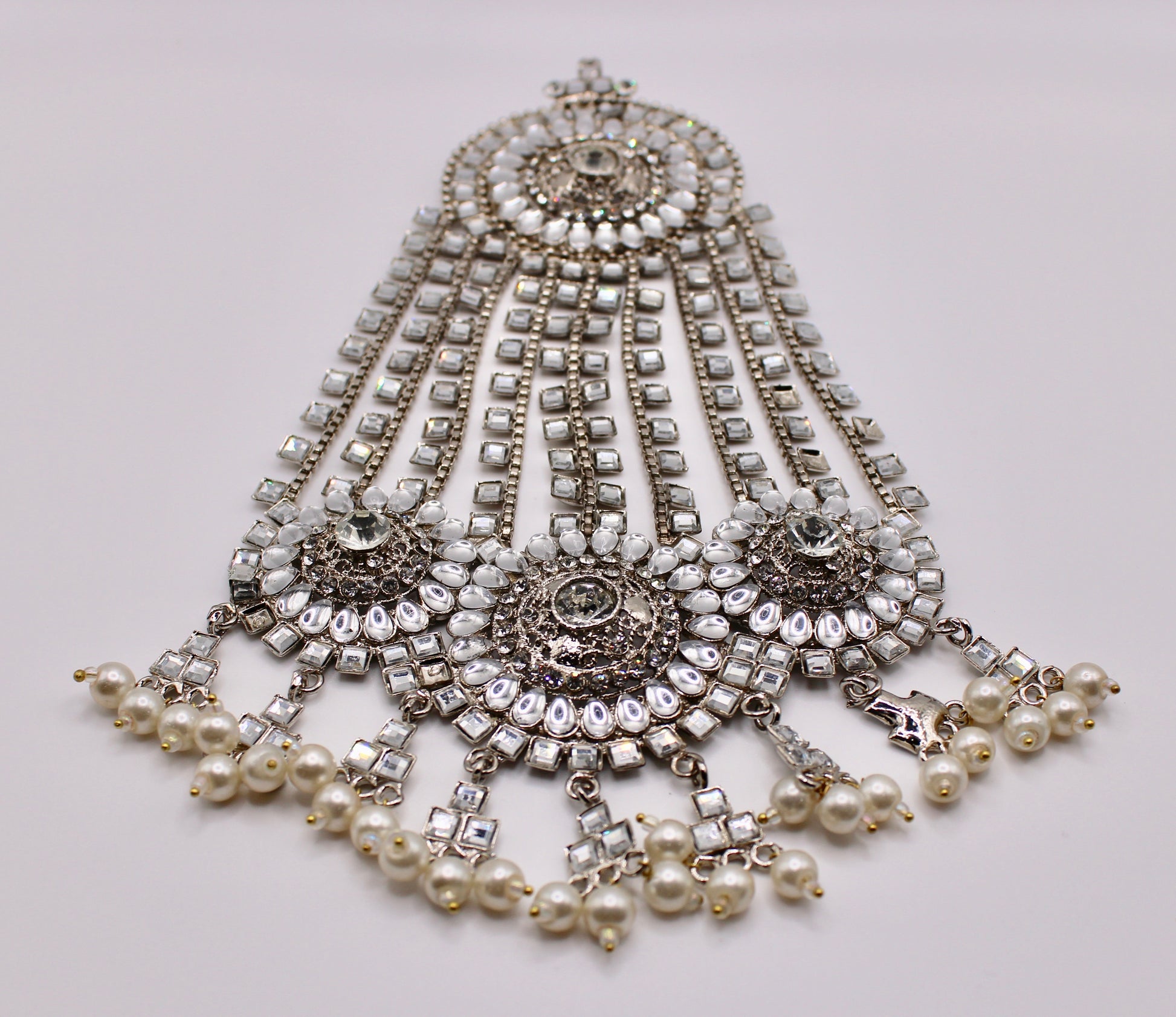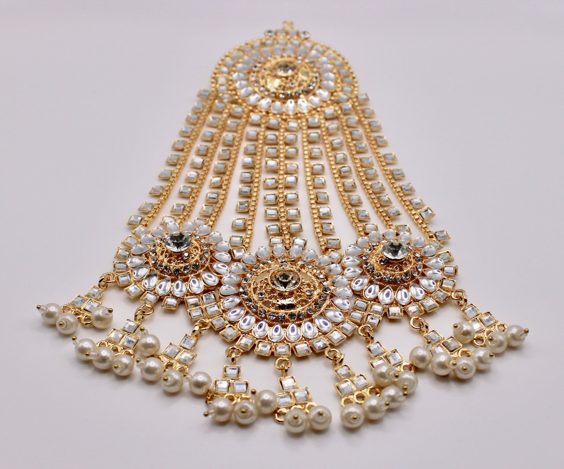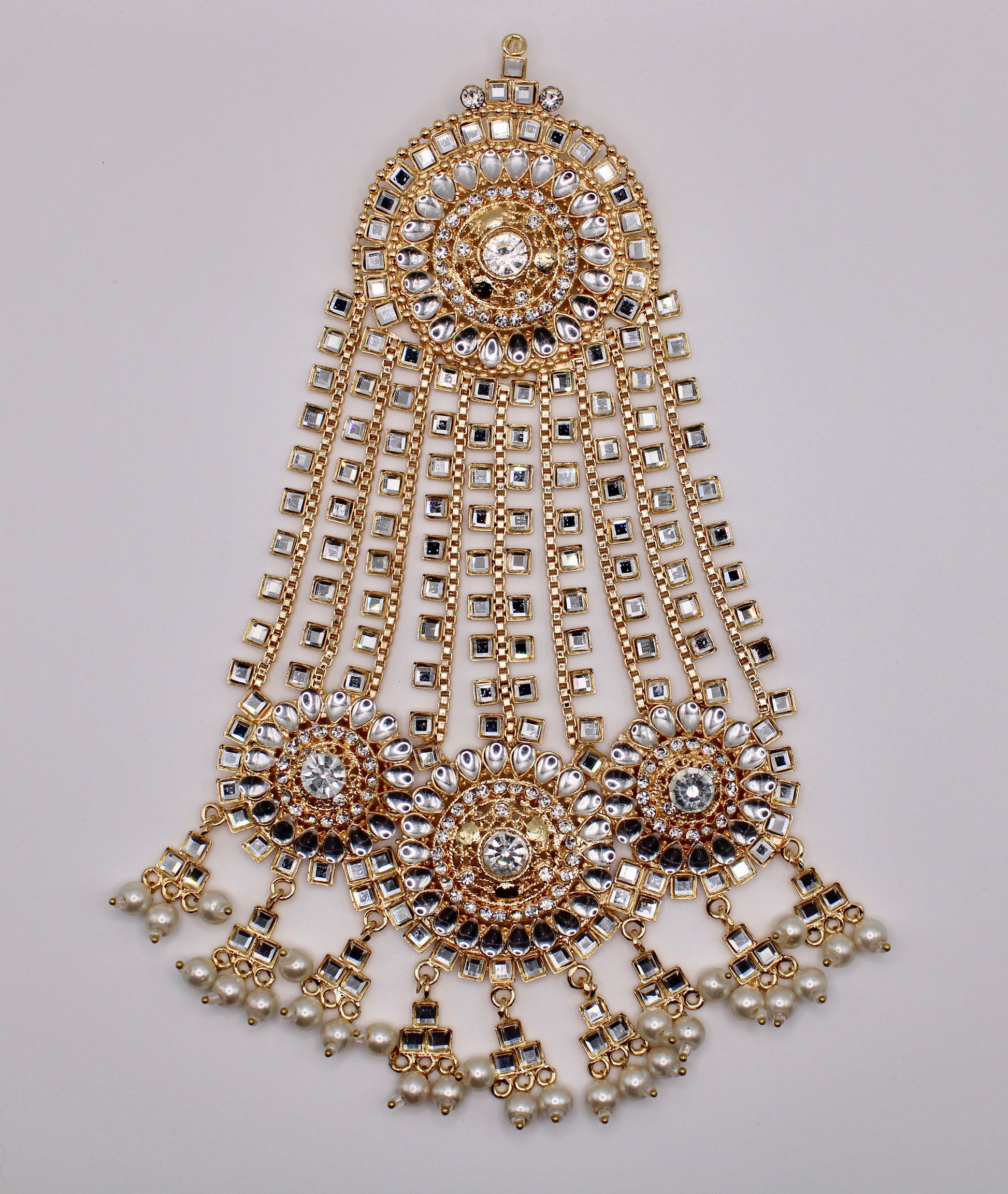 These unique sheesha kundan jhumers are complete with faux pearl detailing throughout. They are available in two variations.
