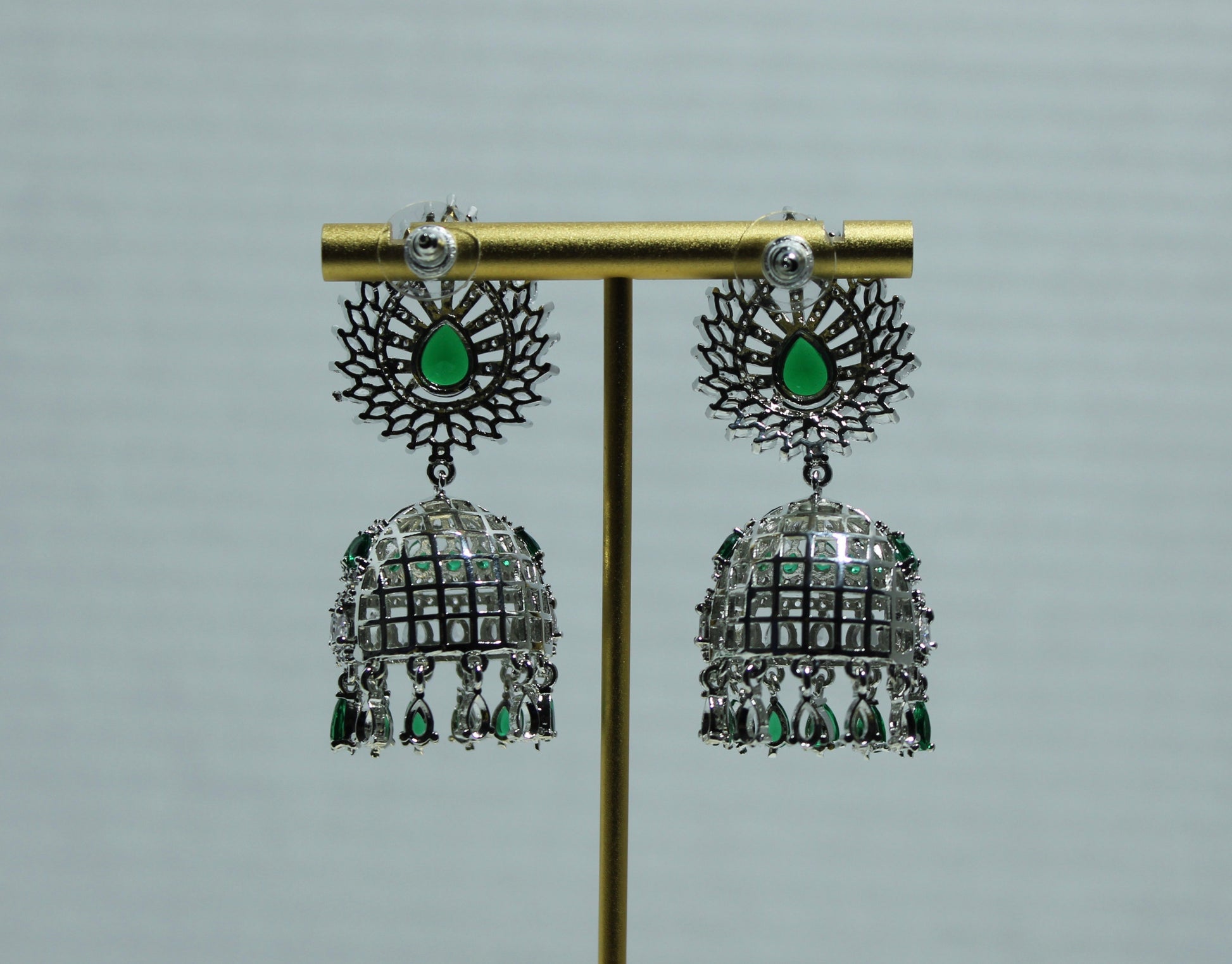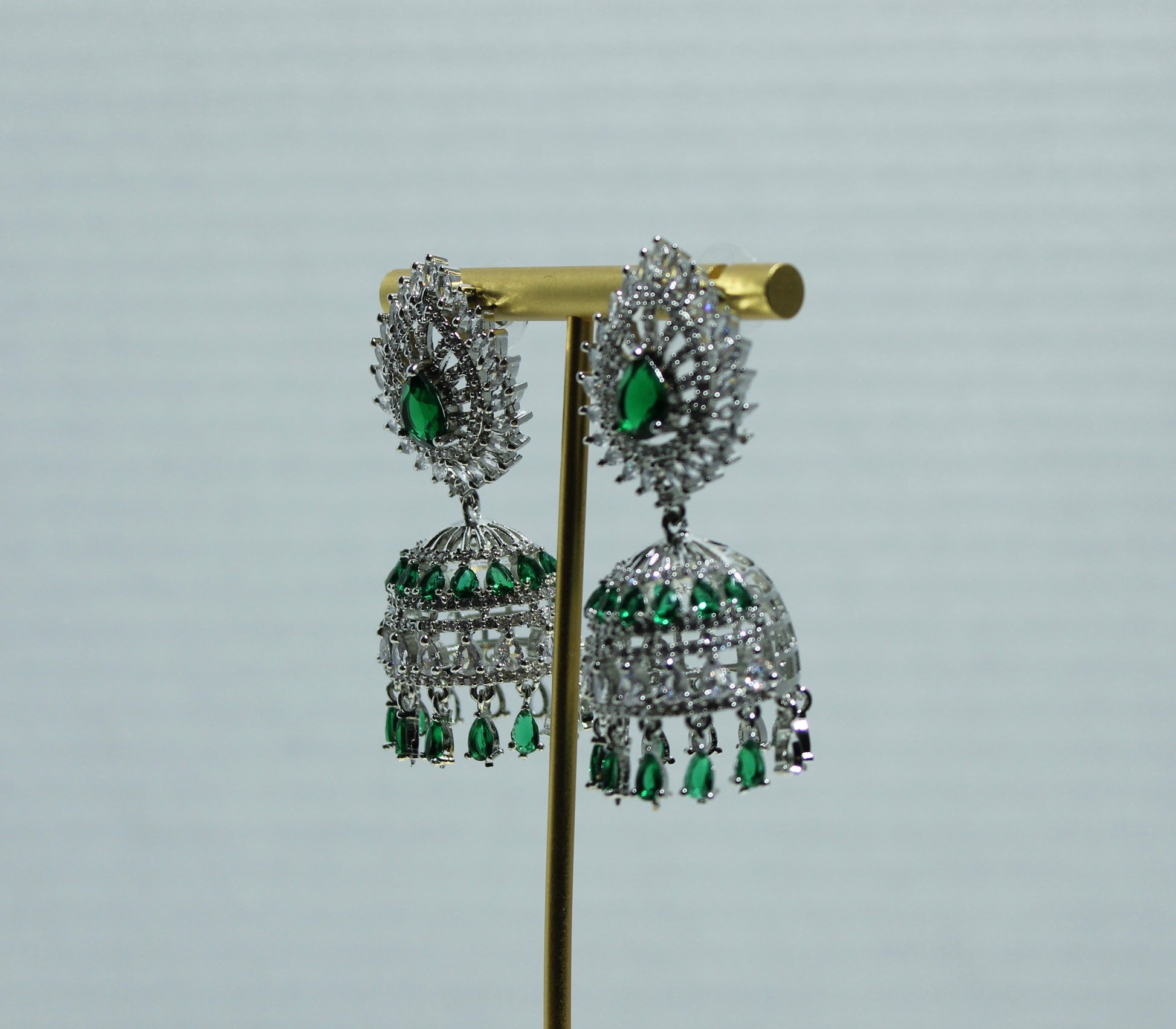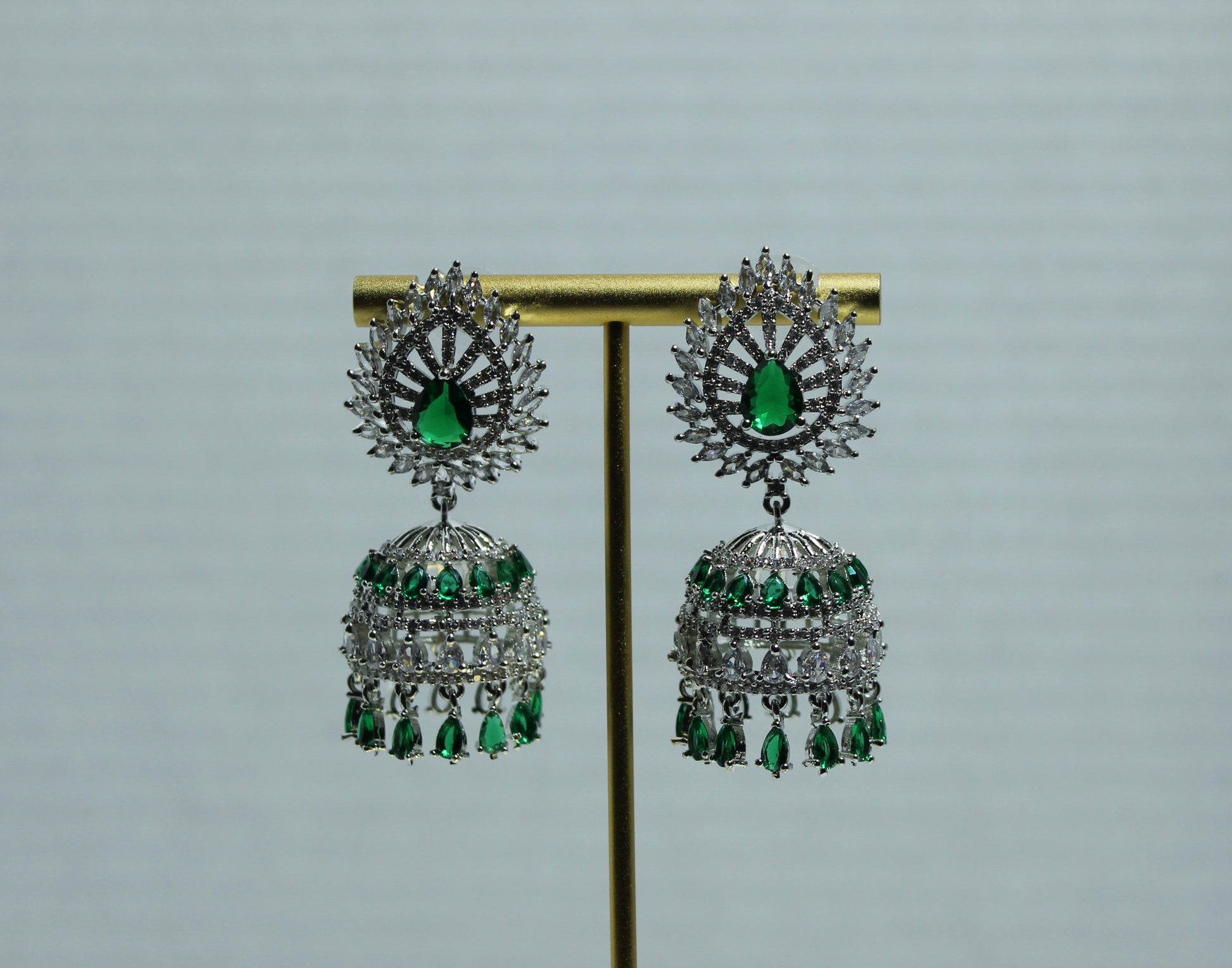 This beautiful jhumki set is complete with cubic zirconia detailing throughout, and has a unique pear-cut design.