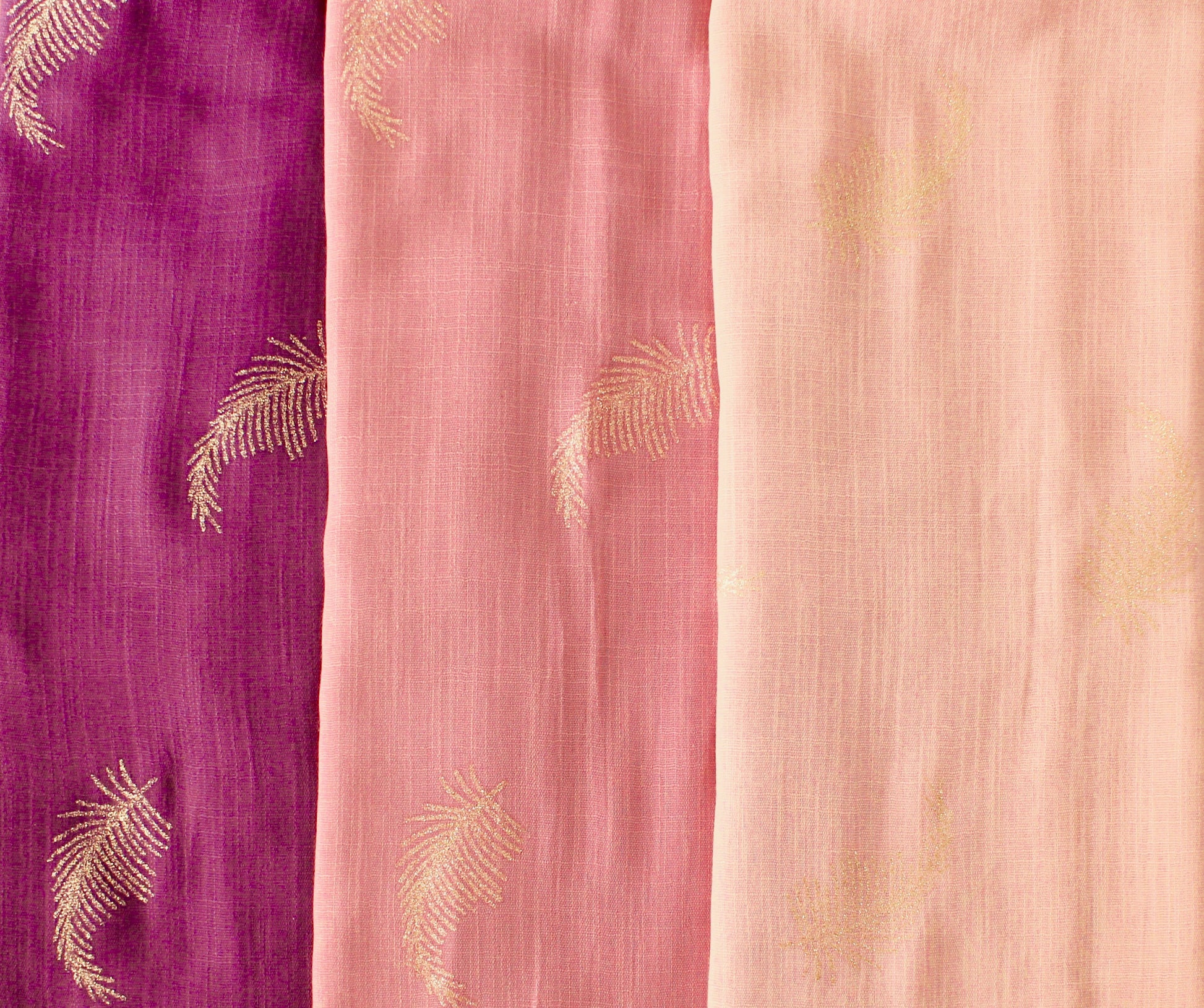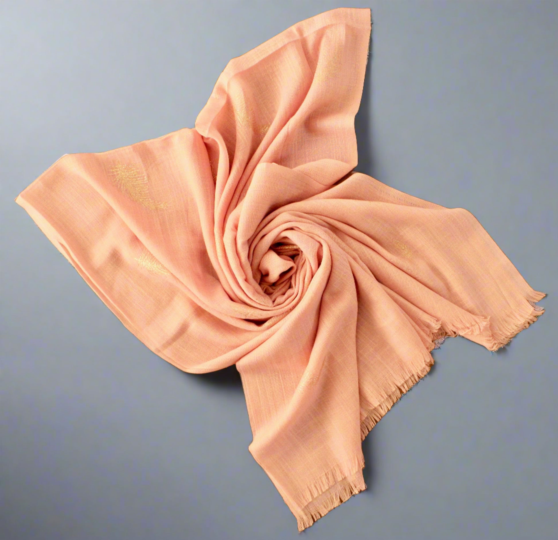 Lawn hijab with glitter printing in feather patterns, available in three colours.