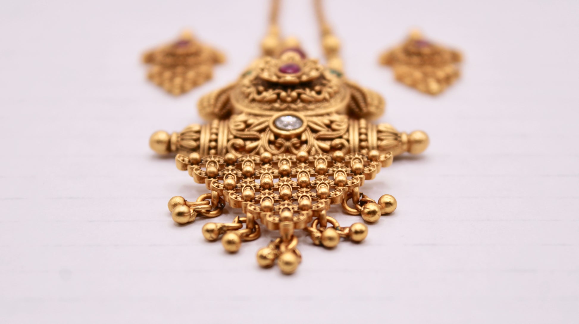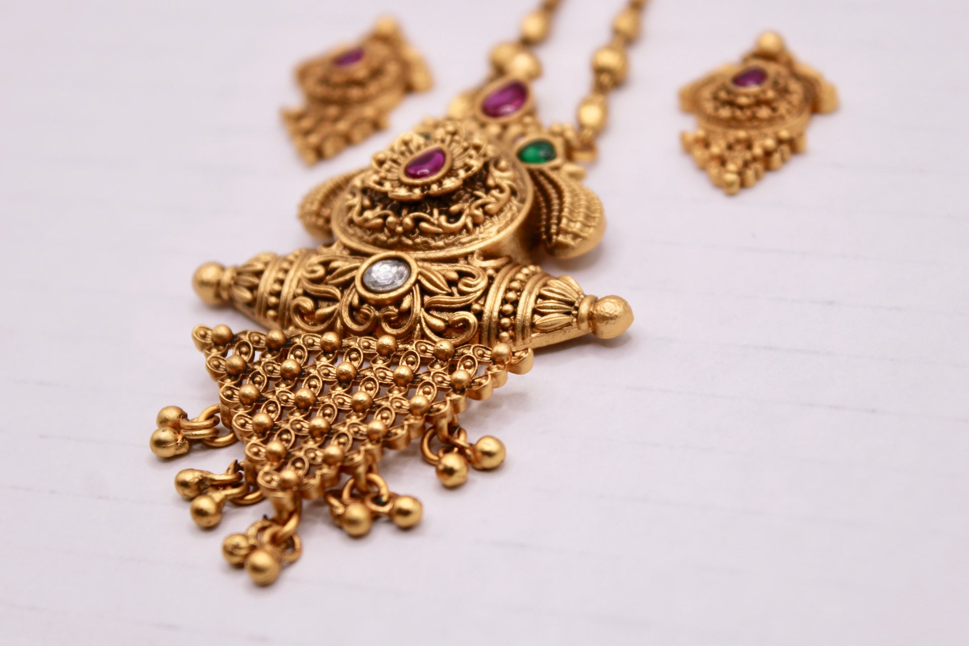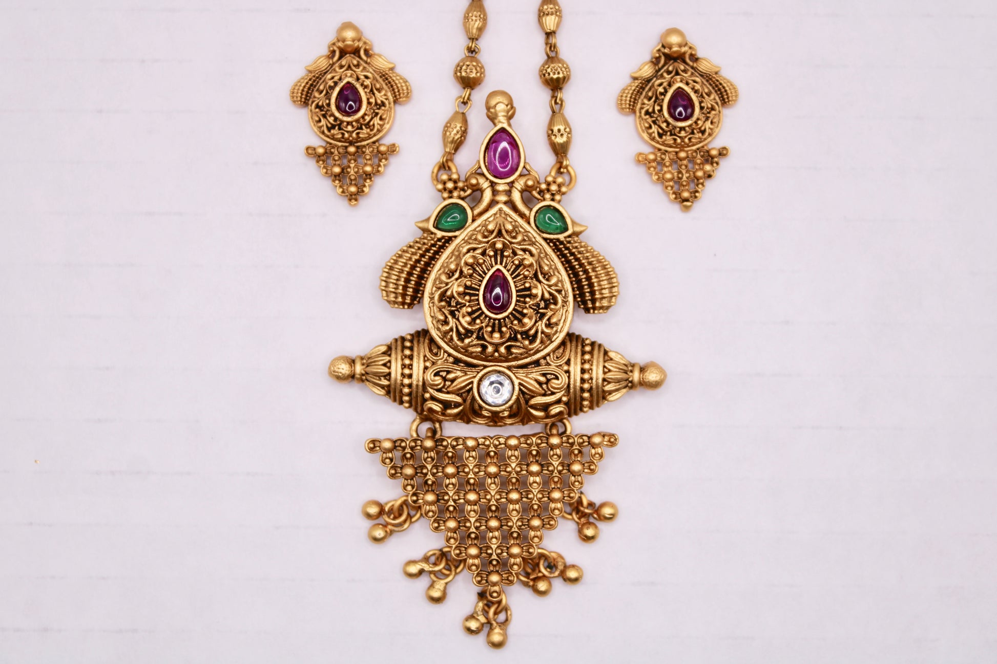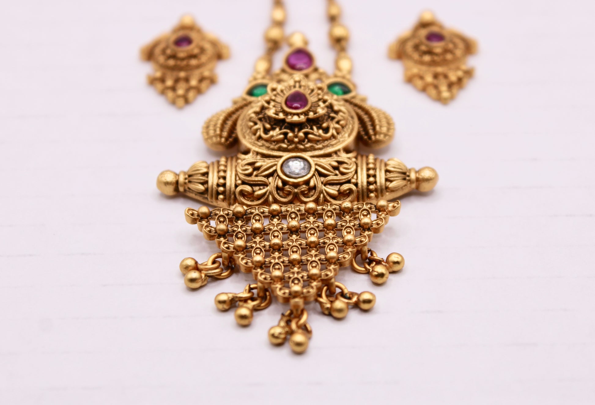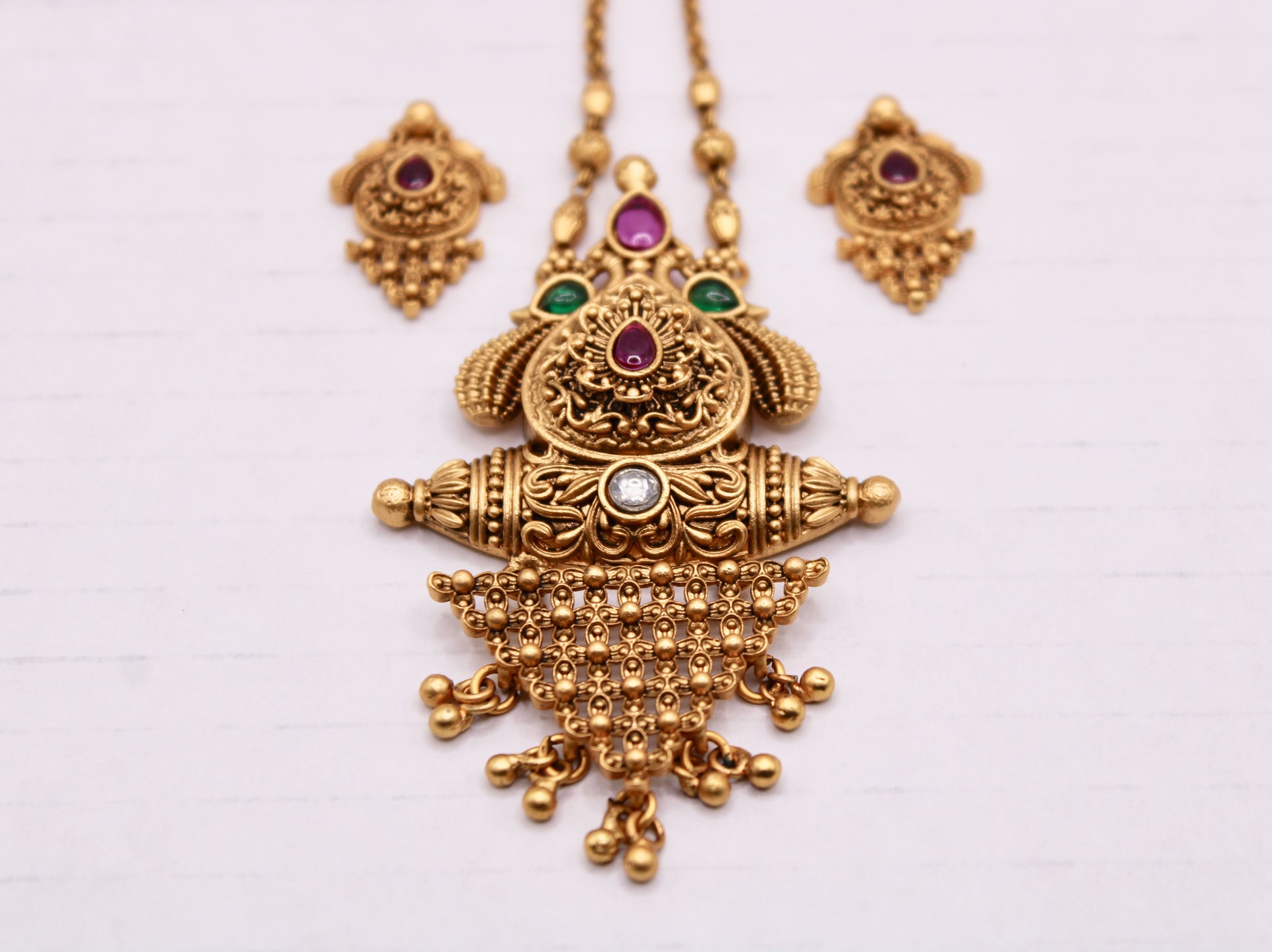 This classic Rajwadi pendant set is complete with two-tone stone detailing and matching studs to complete the set.