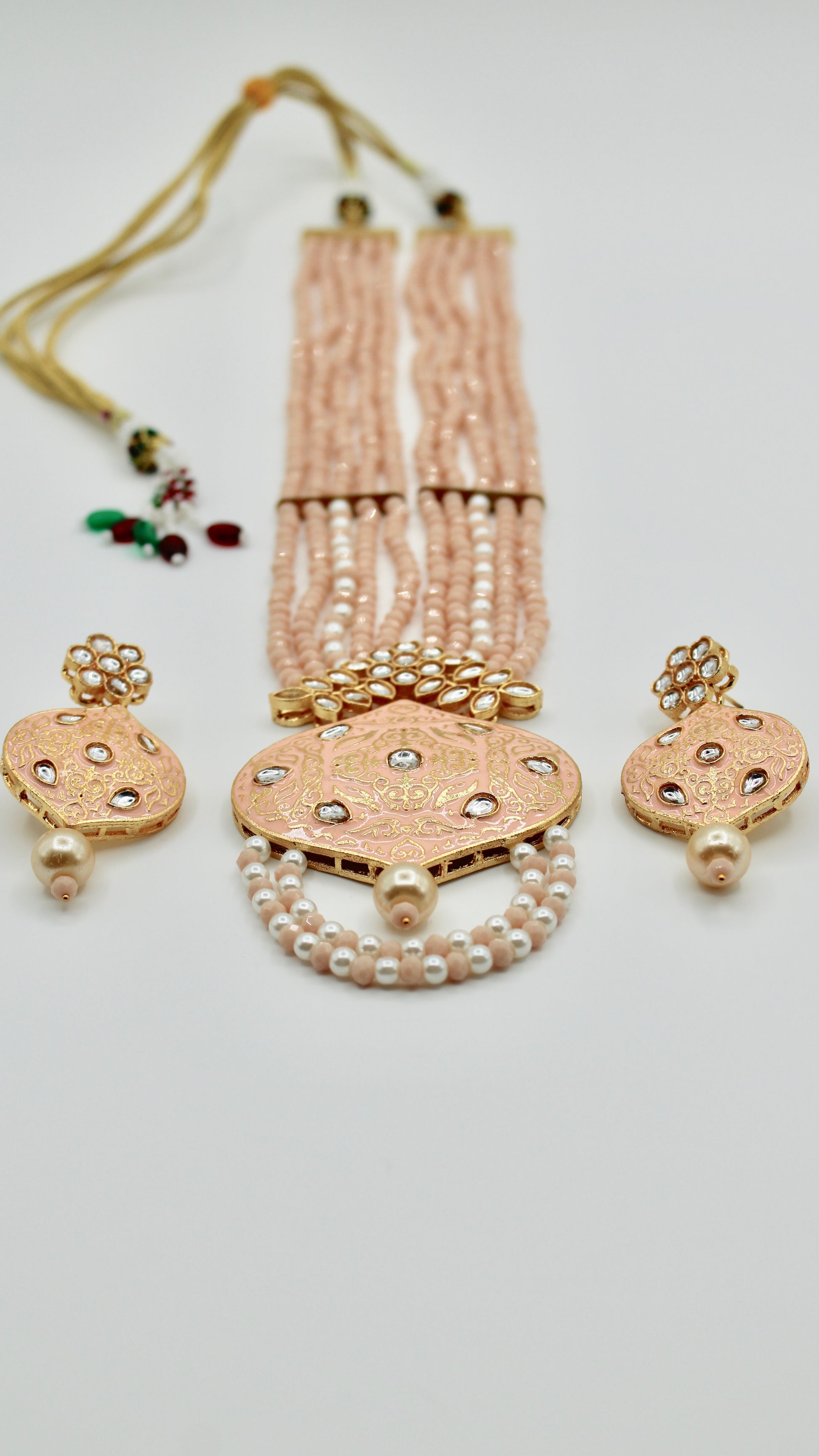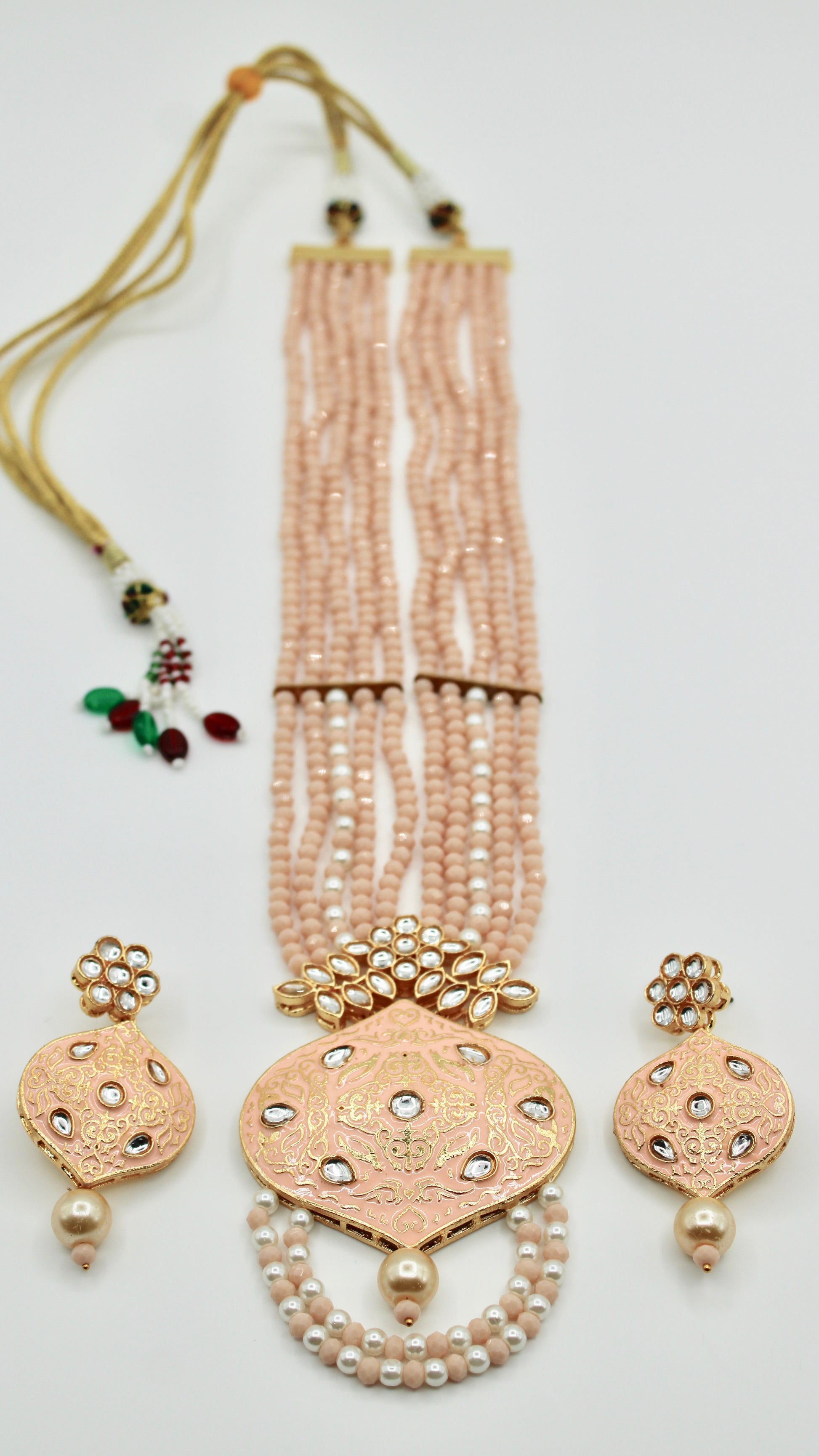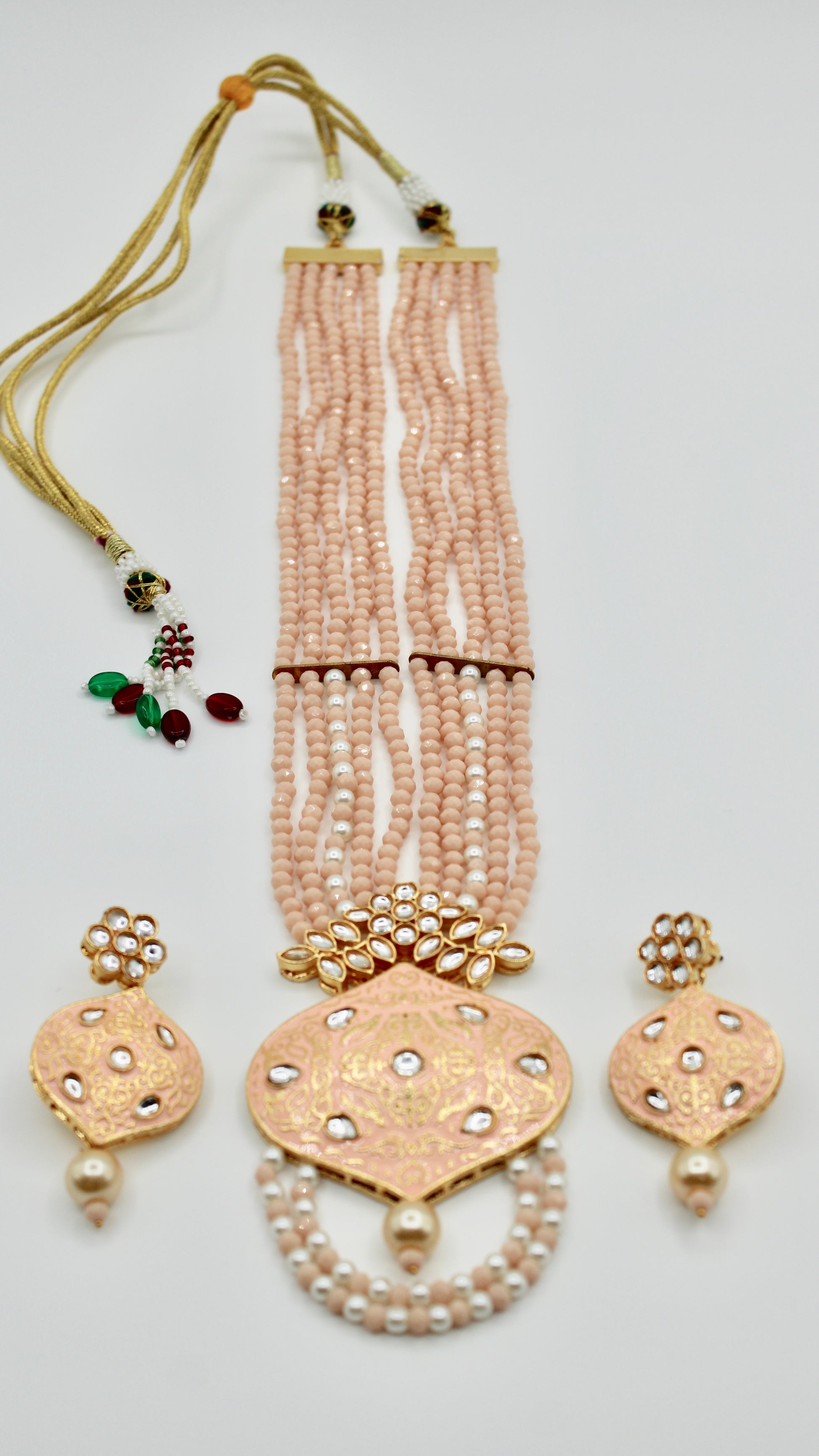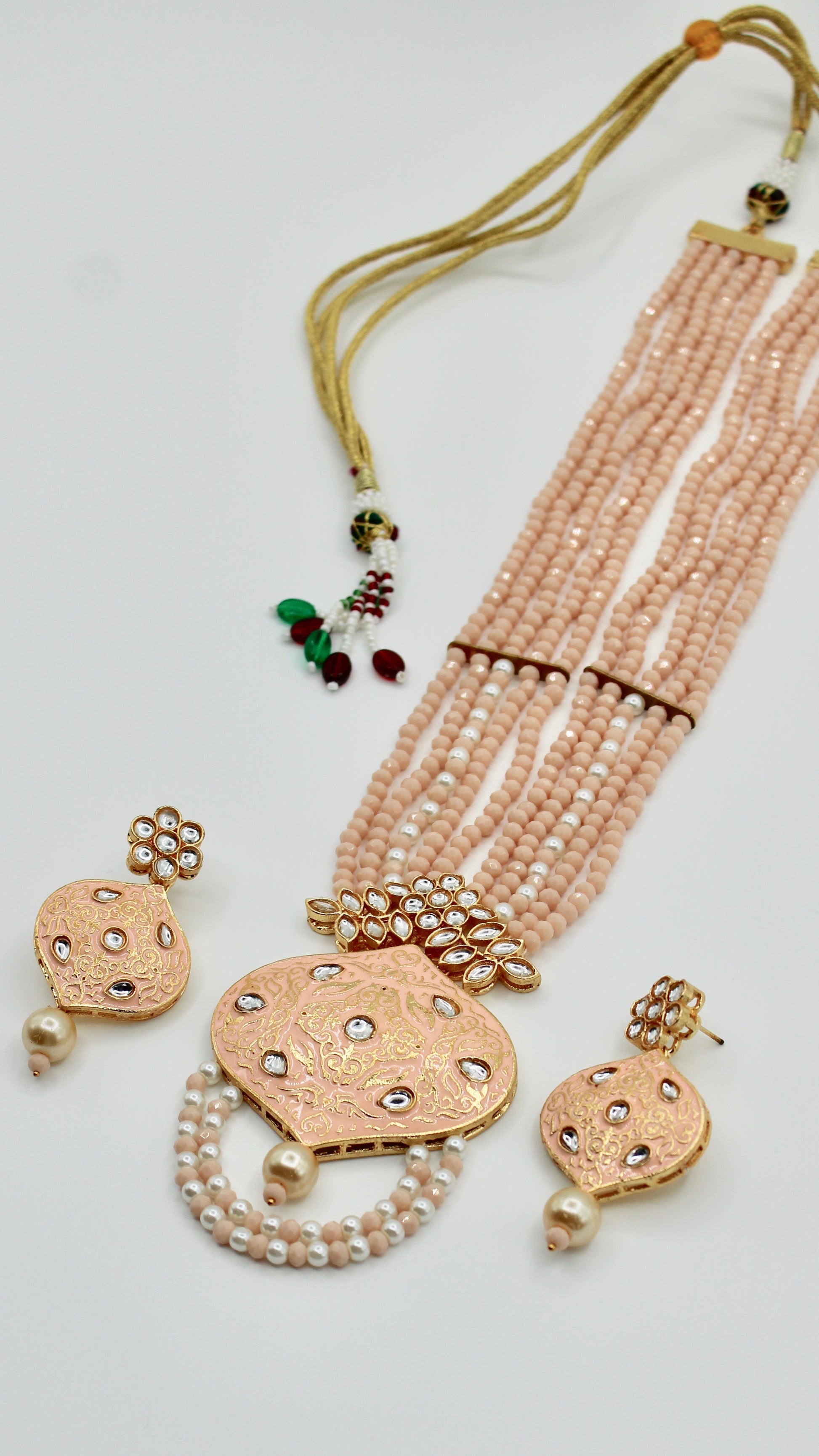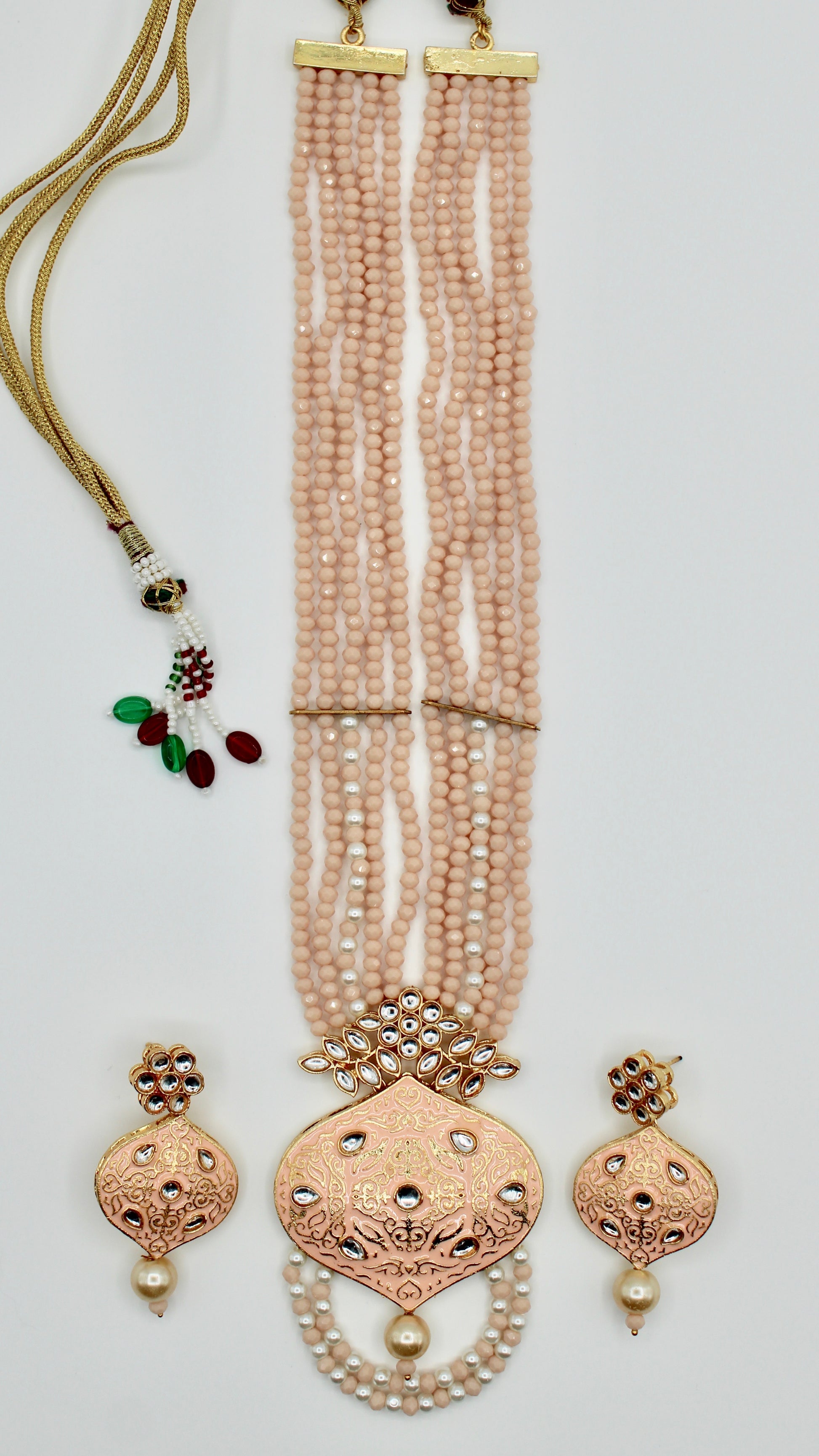 This elegant mala set is complete with with glass bead detailing. It is the perfect look for a minimalist, and includes earrings. Made of brass to increase product lifetime.