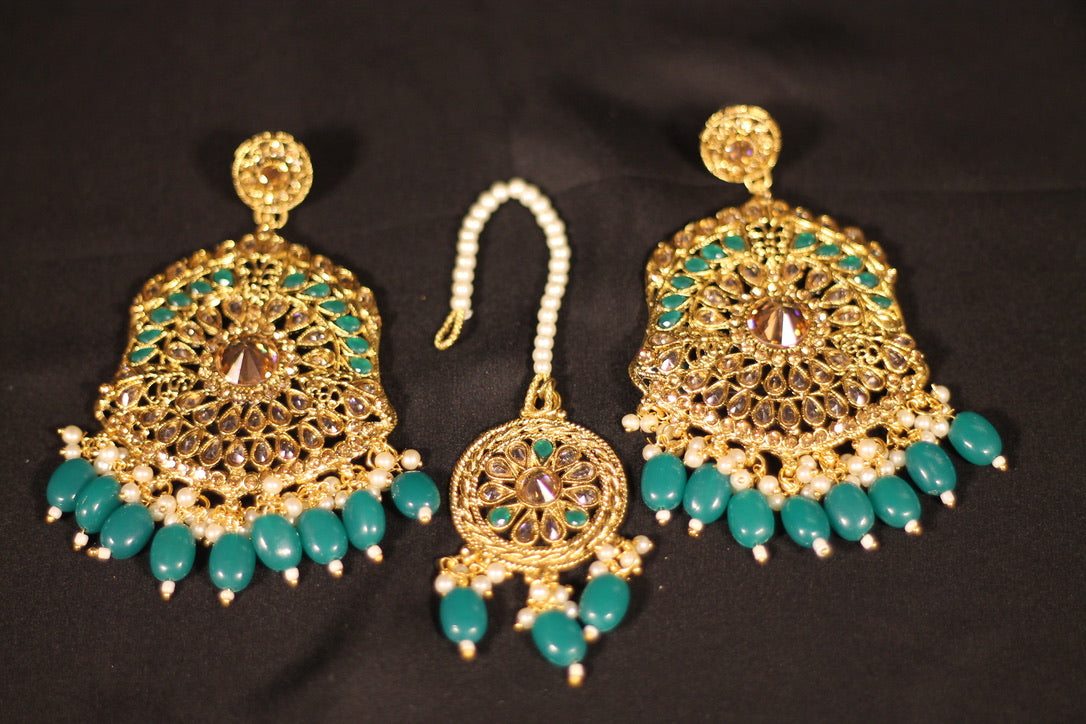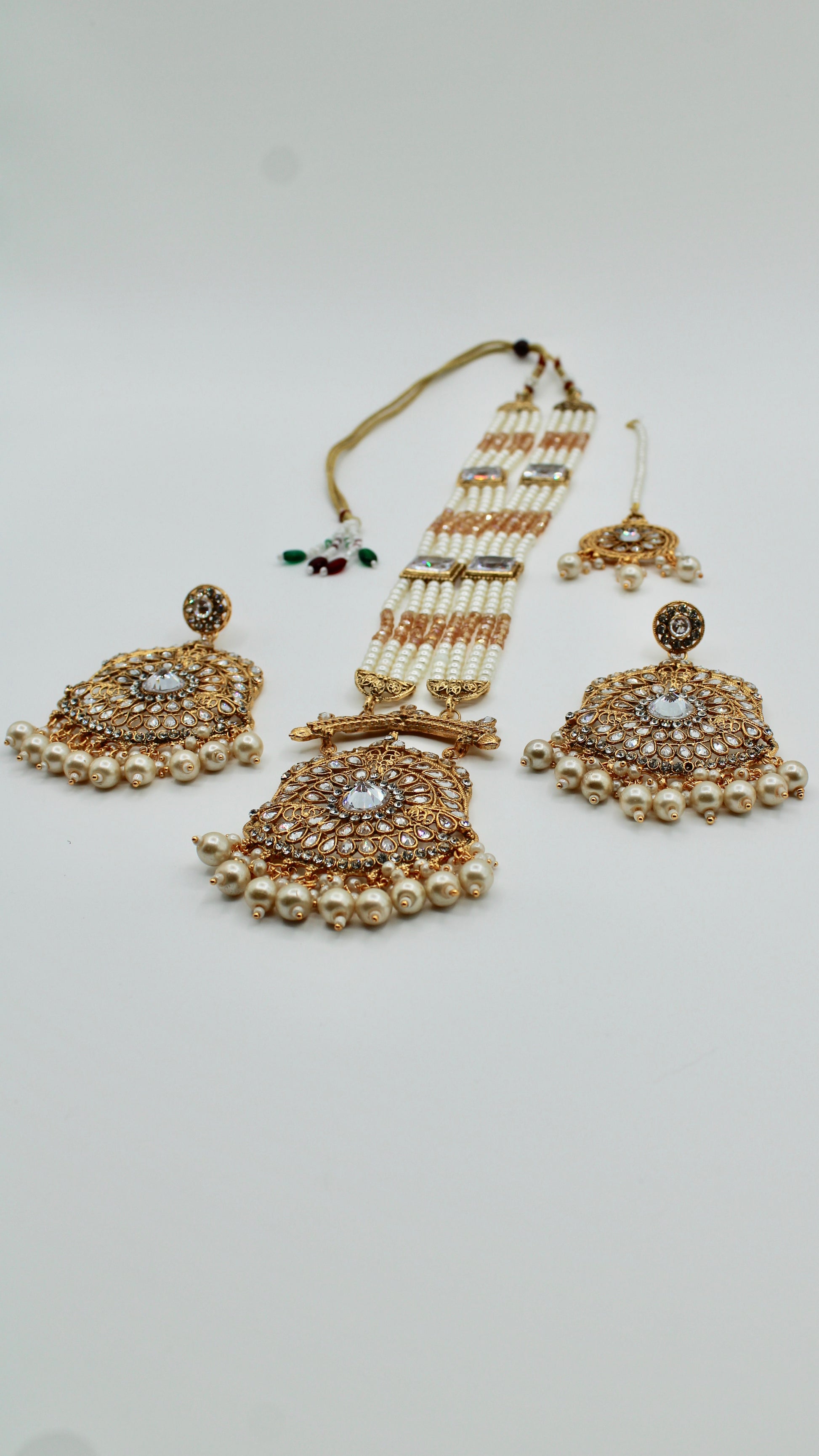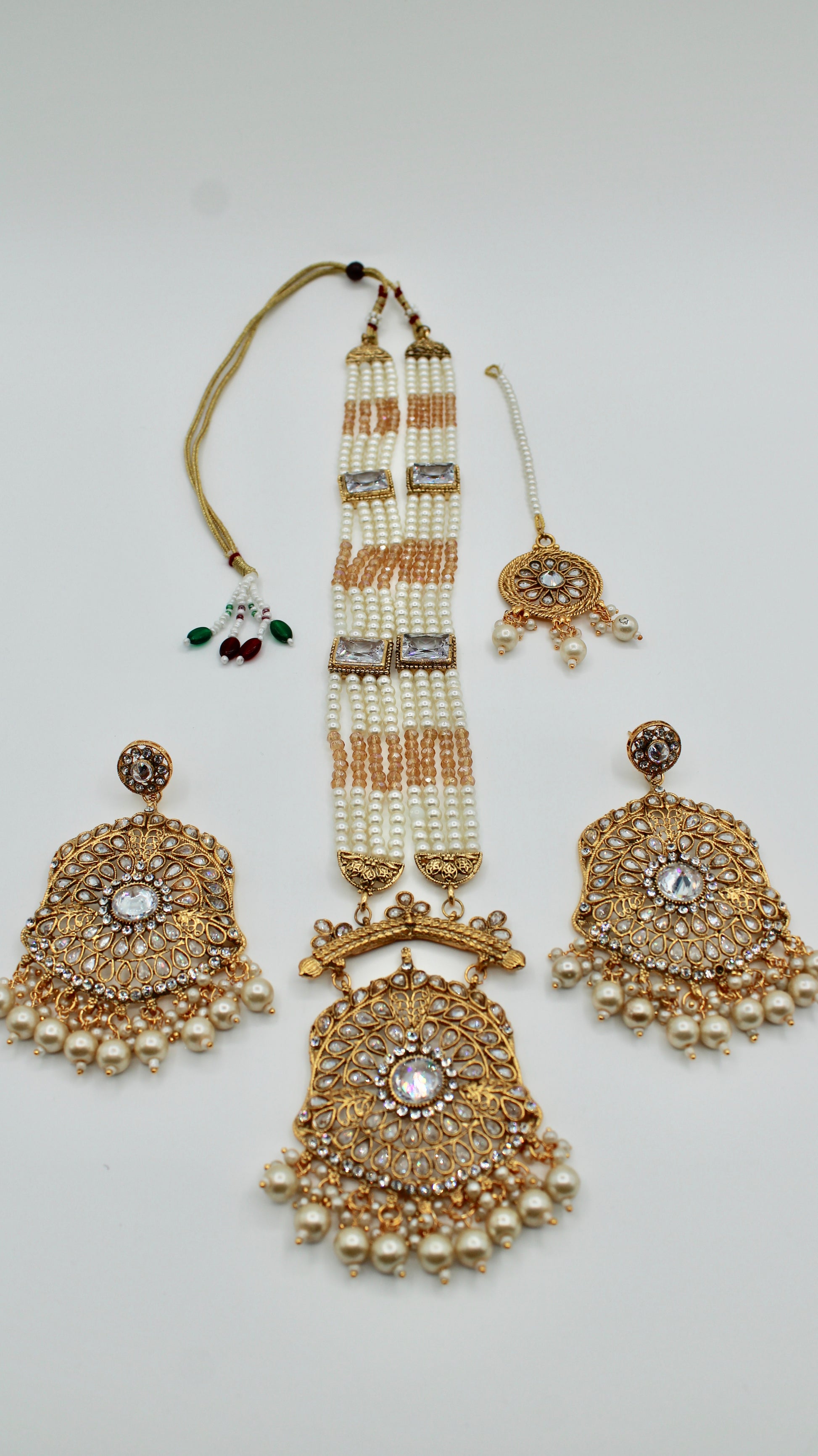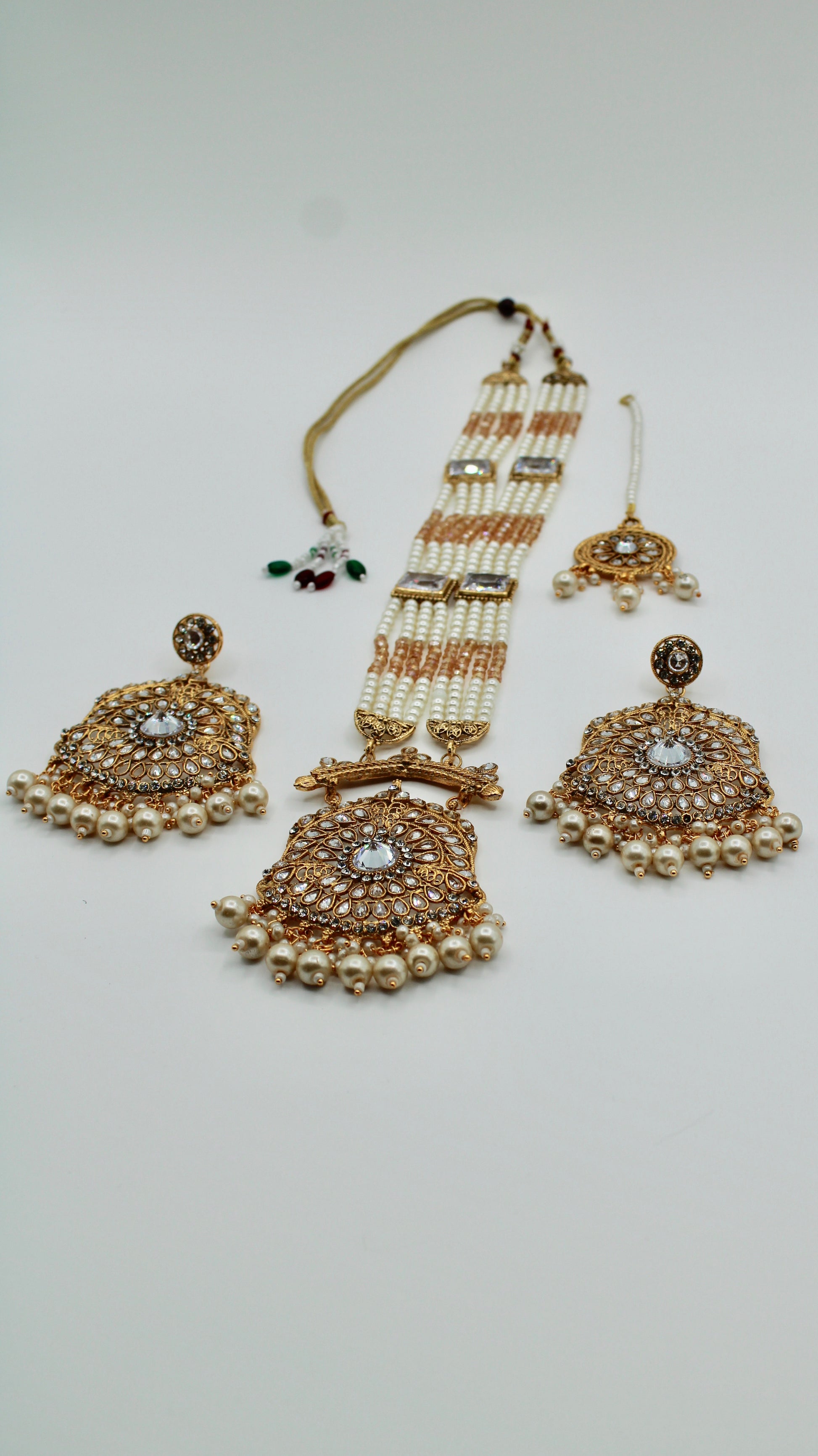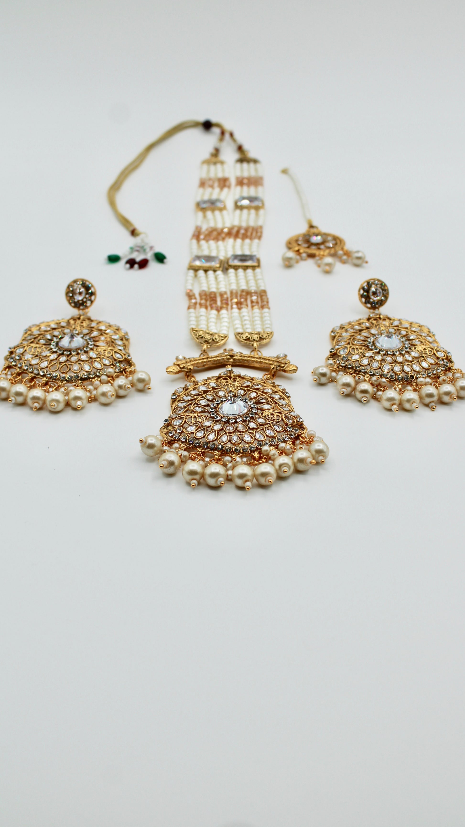 This traditional mala is hand-made with glass polki, cubic zirconia, layers of pearls, and is complete with crystal beads. This mala set includes matching broad earrings and a teeka. Made of brass to increase product lifetime.