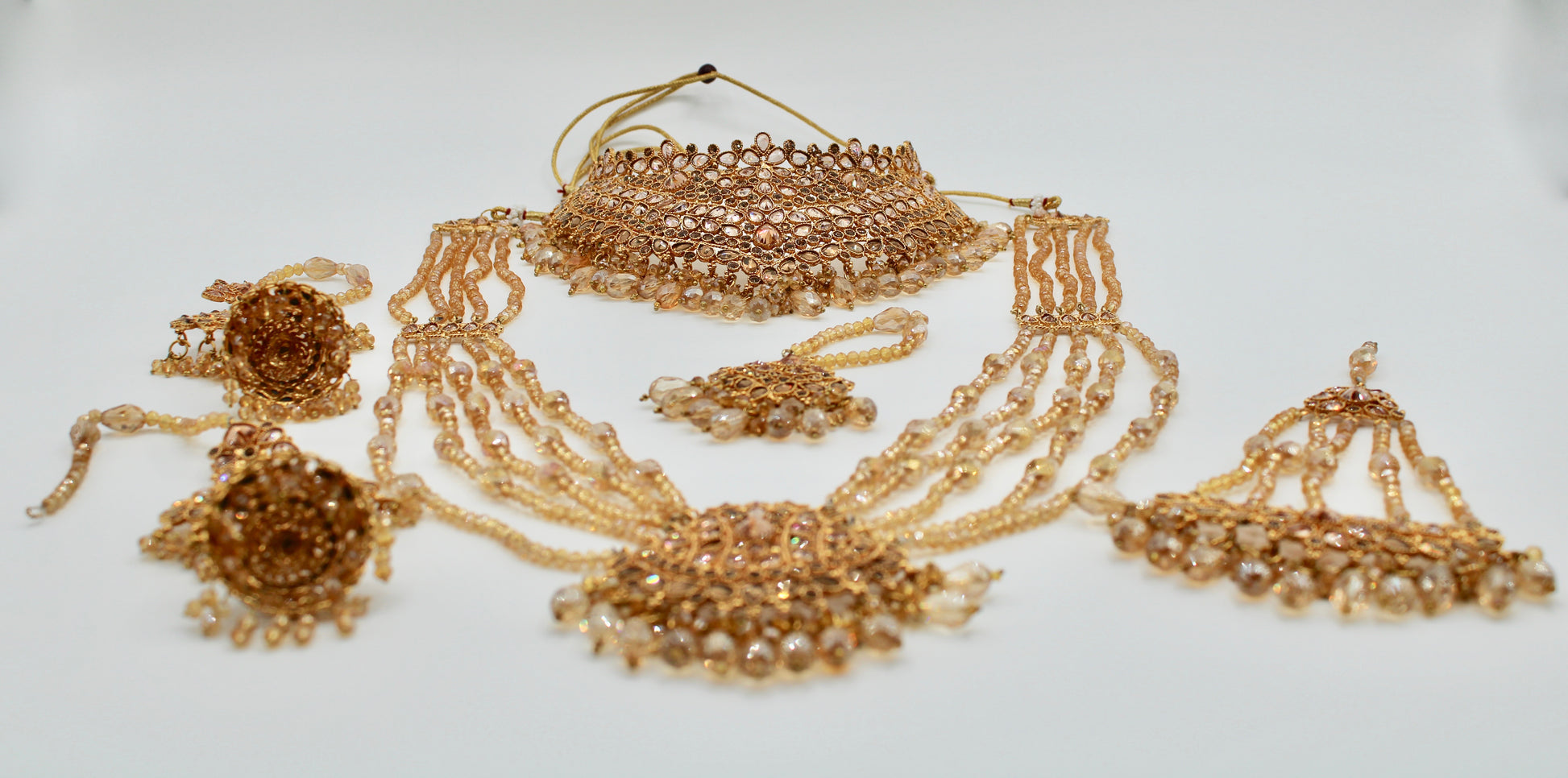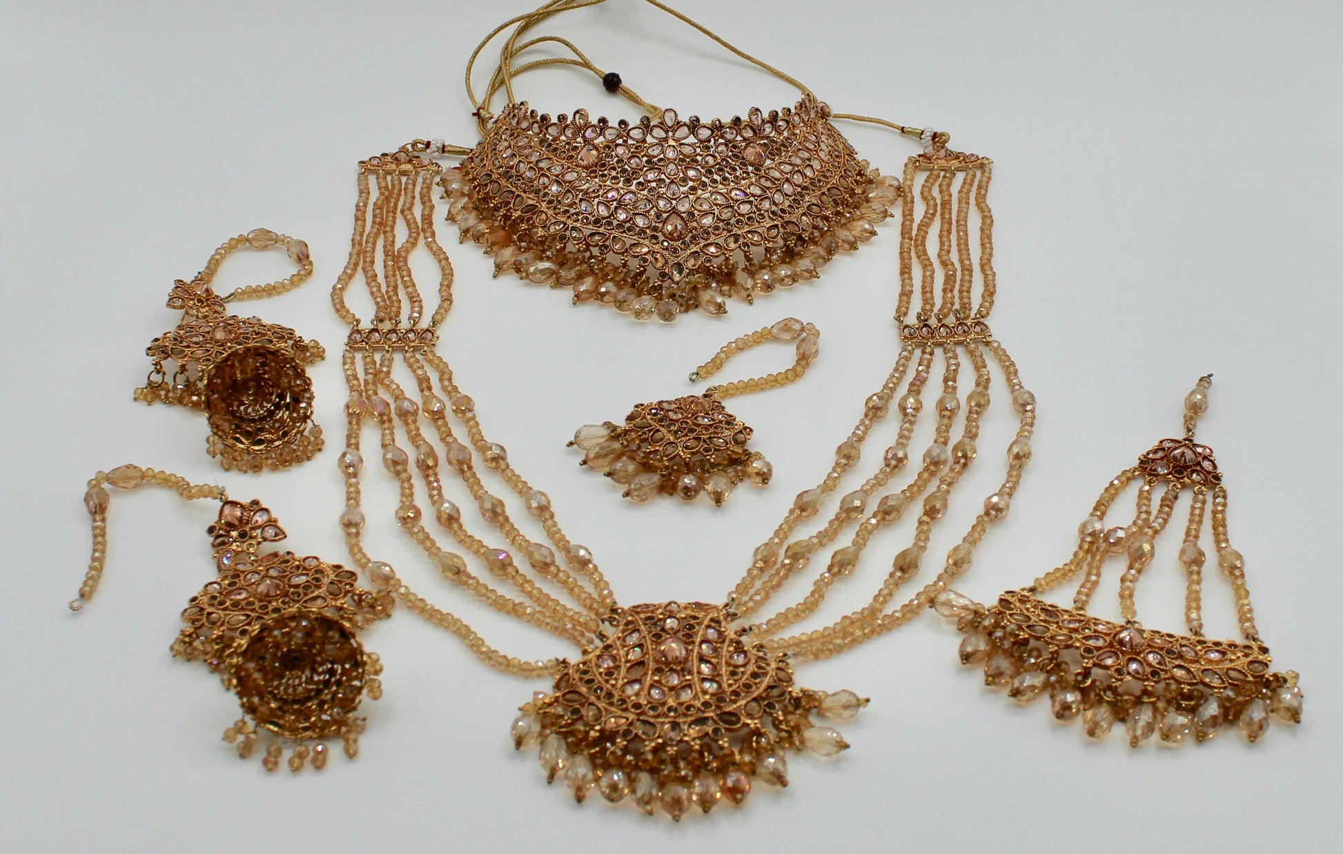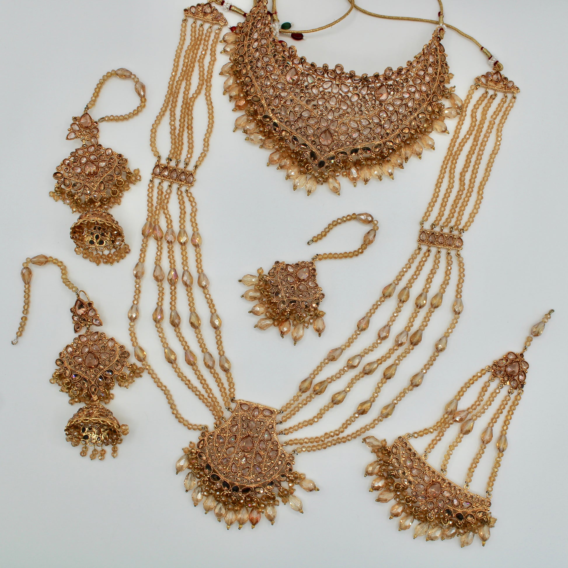 This mesmerizing champagne bridal set is complete with cubic zirconia work and water shine crystals, giving it a serene look. This set includes a heavy choker, layered dholna, jhumka earrings, a teeka and jhumer.