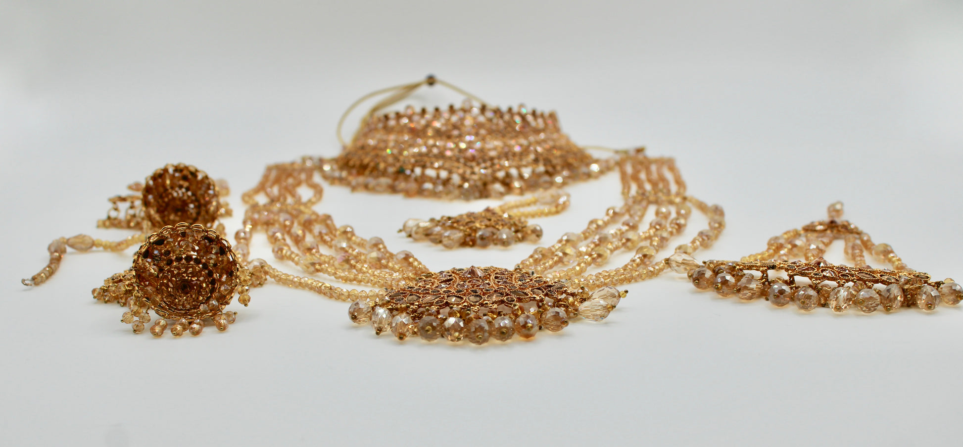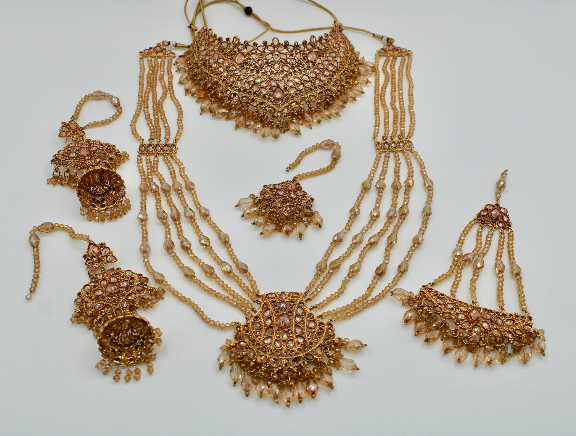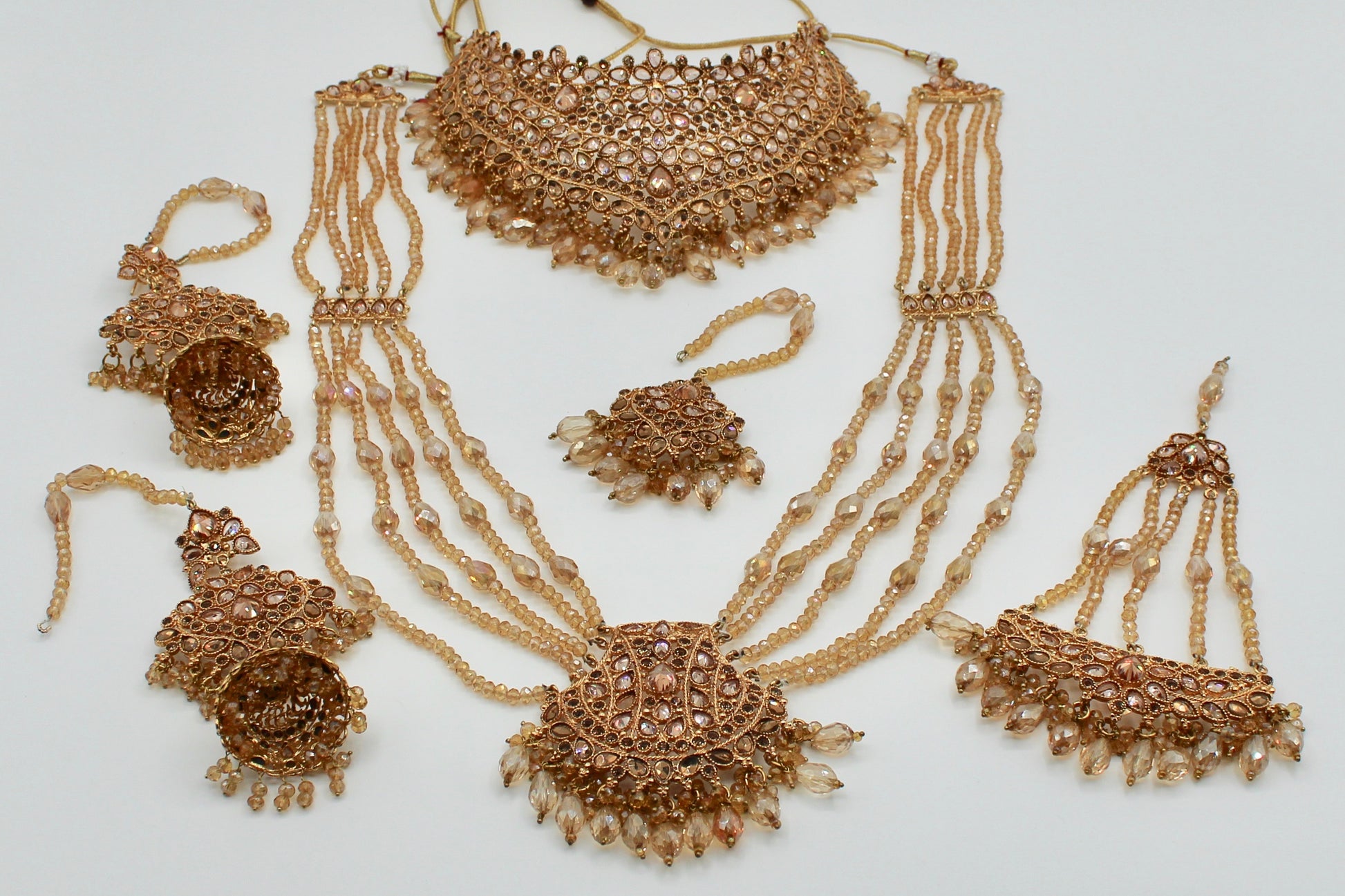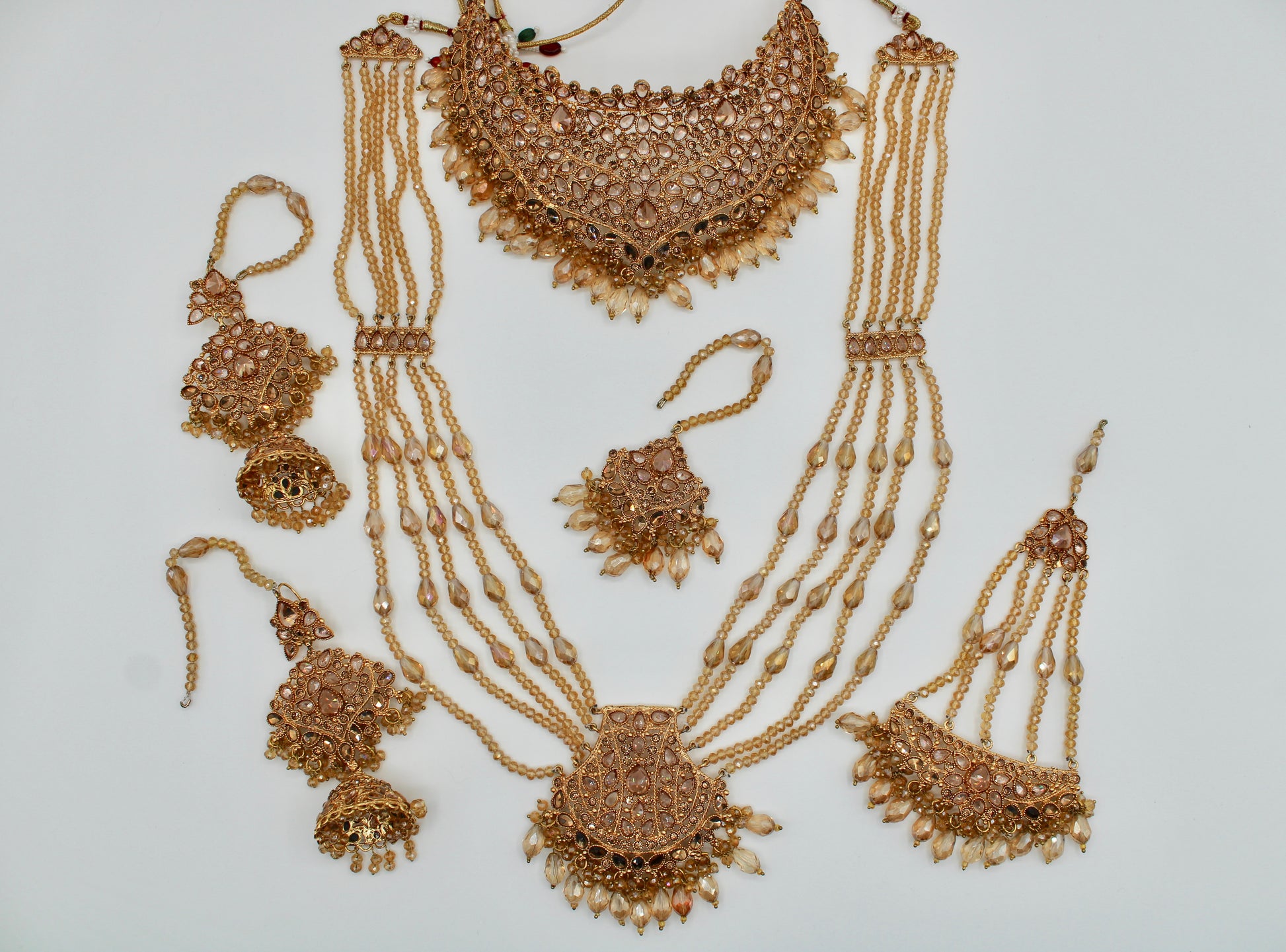This mesmerizing champagne bridal set is complete with cubic zirconia work and water shine crystals, giving it a serene look. This set includes a heavy choker, layered dholna, jhumka earrings, a teeka and jhumer.