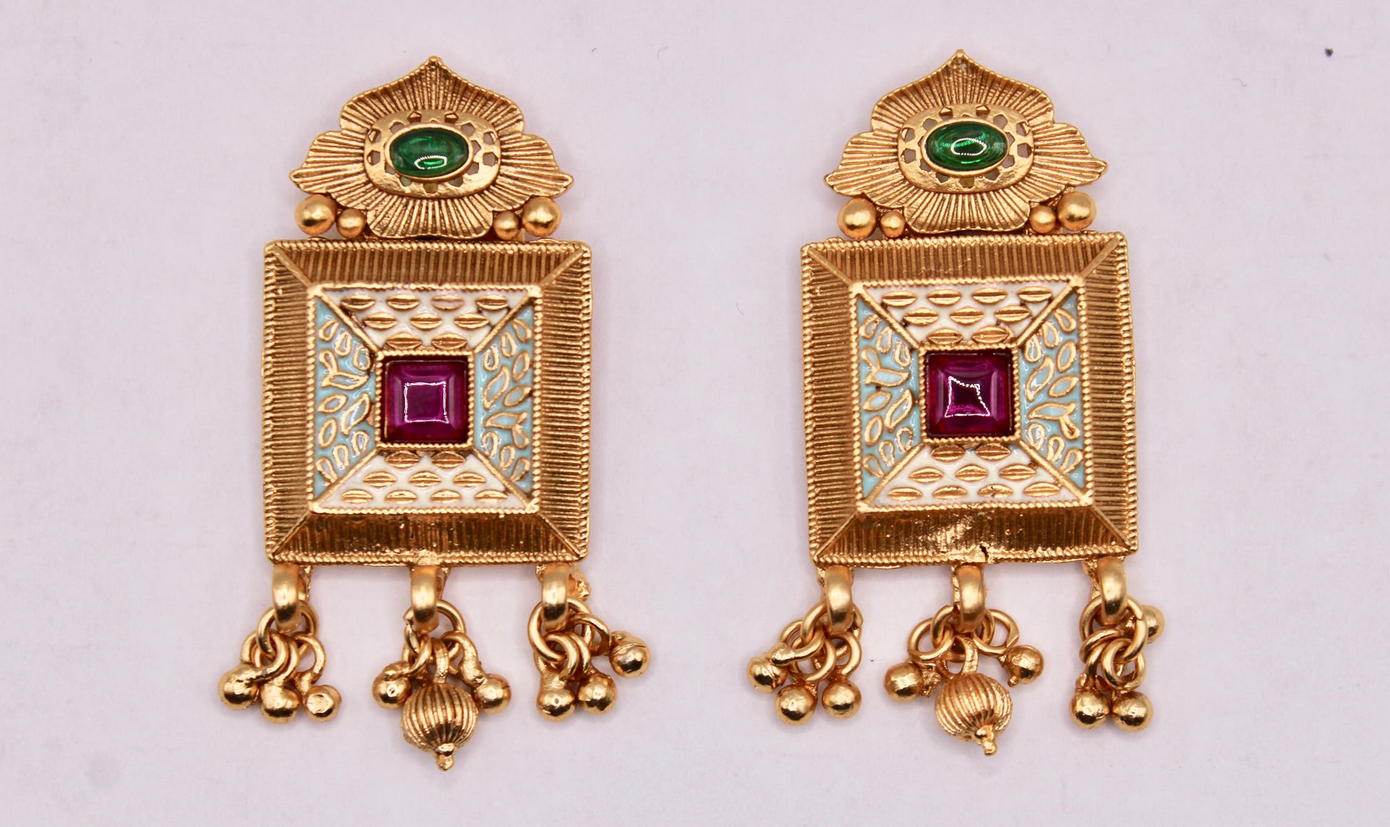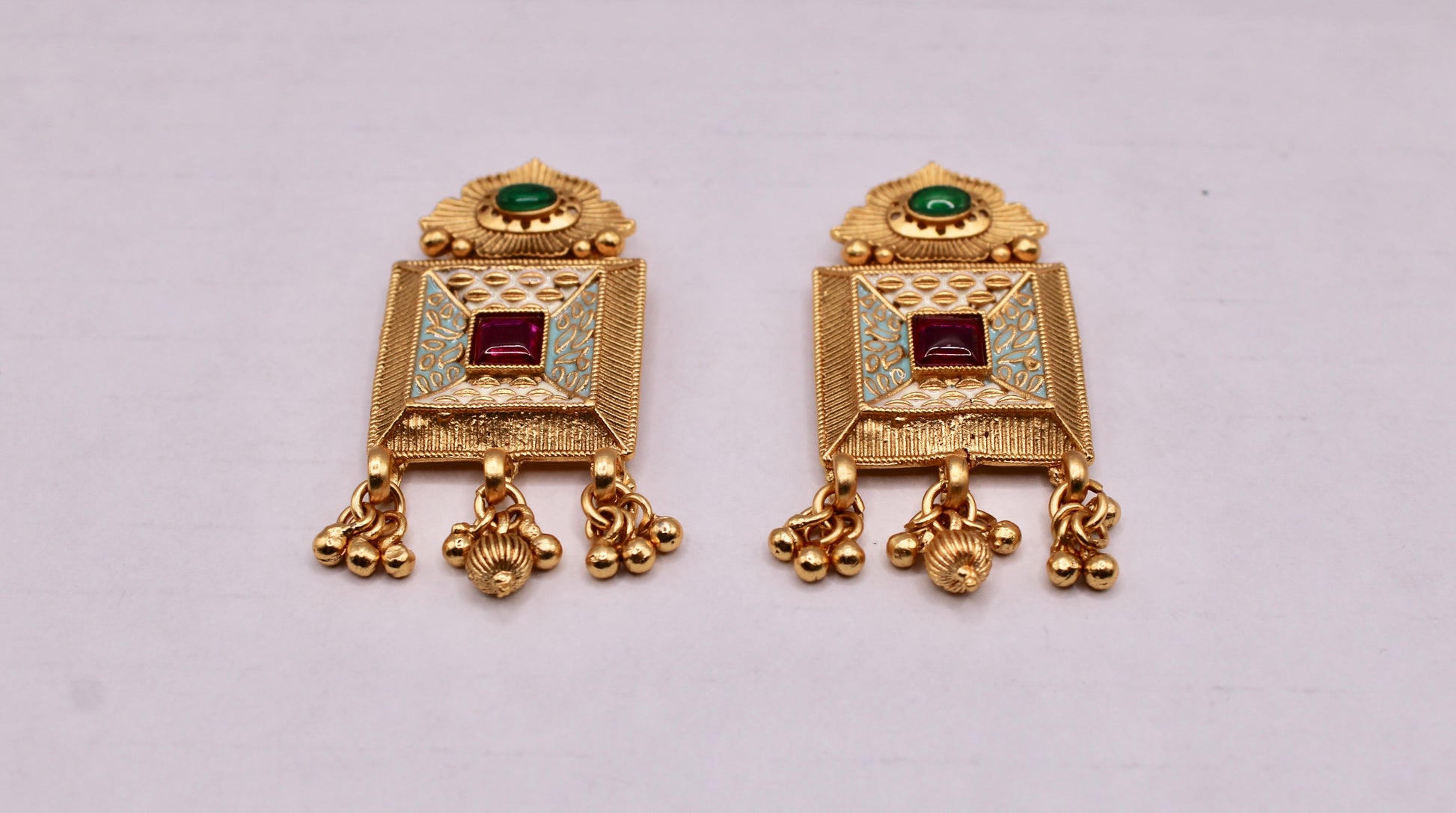 These traditional Rajwadi earrings are hand-painted and complete with faux gem detailing.