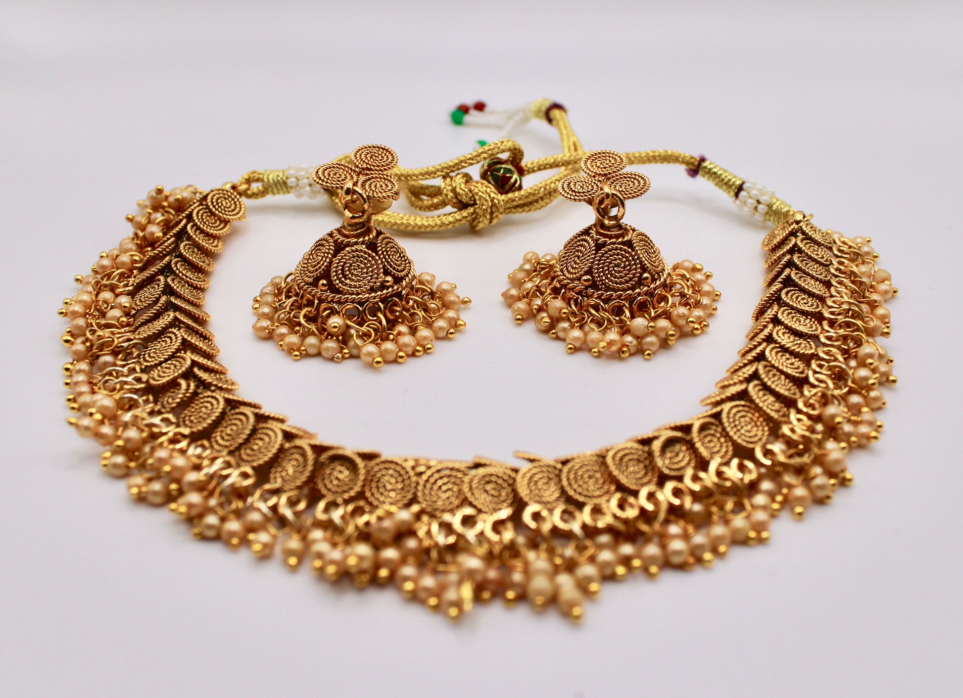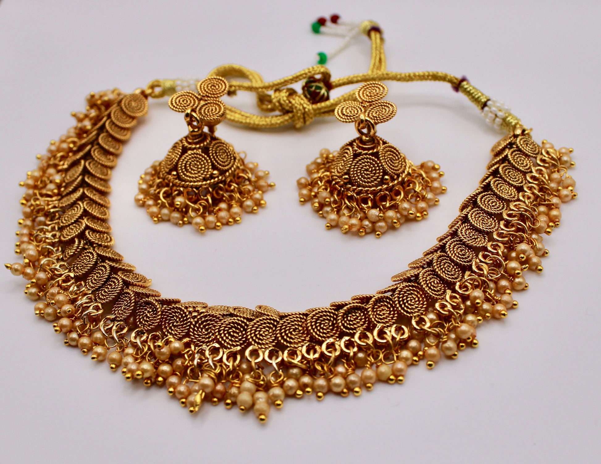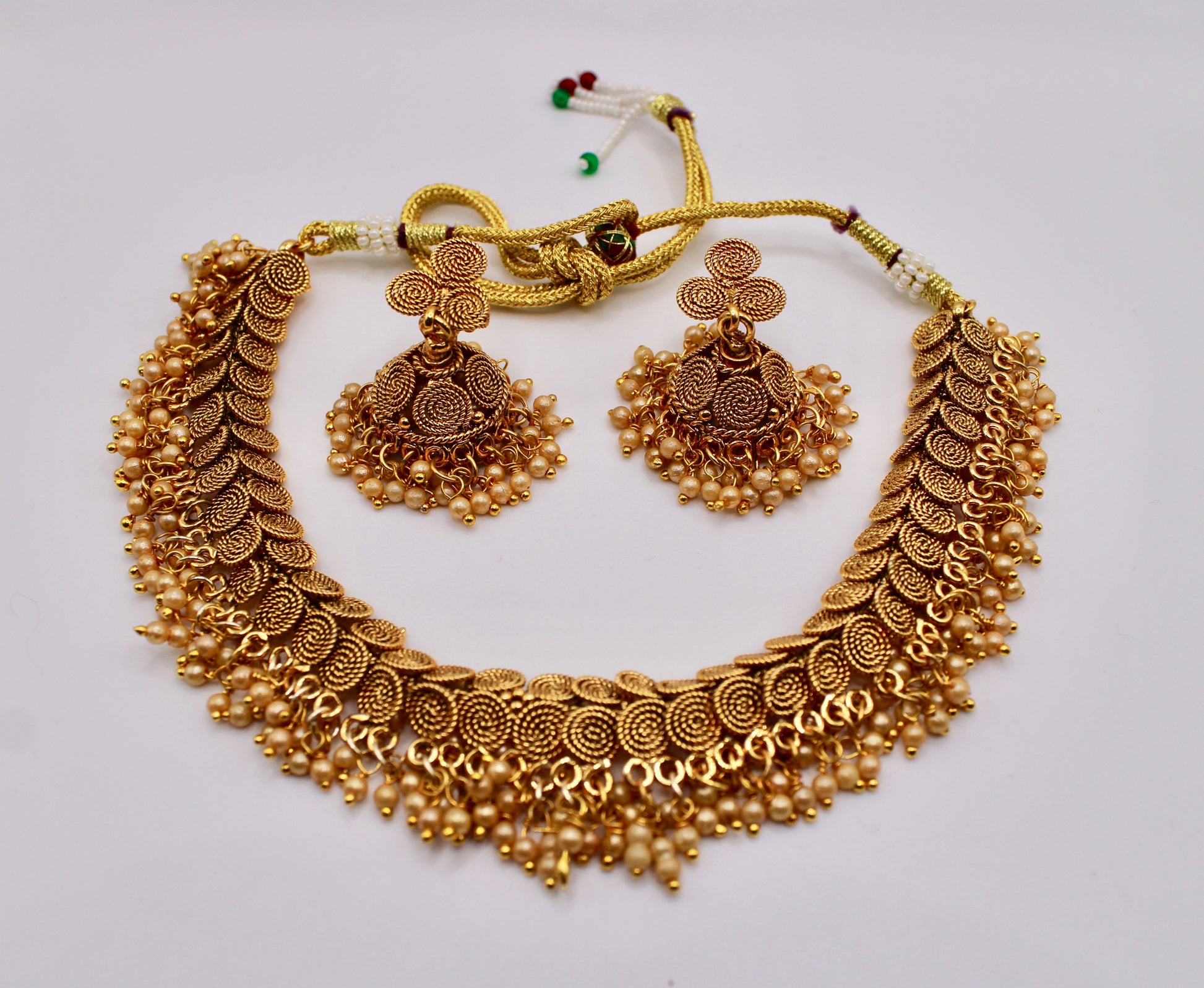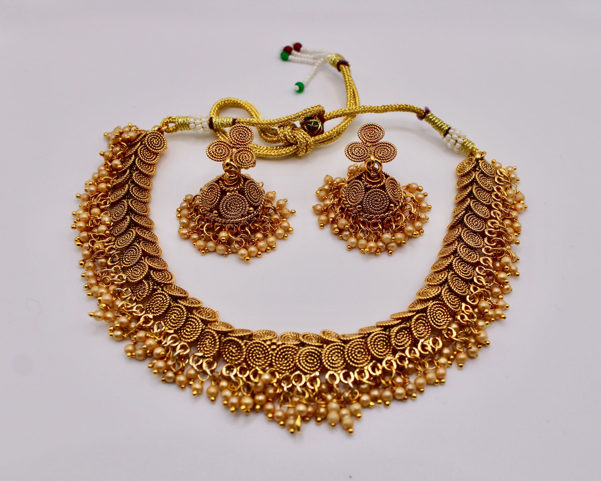 This traditional Rajwadi necklace set is complete with faux pearl detailing. It is complete with matching jhumki earrings.