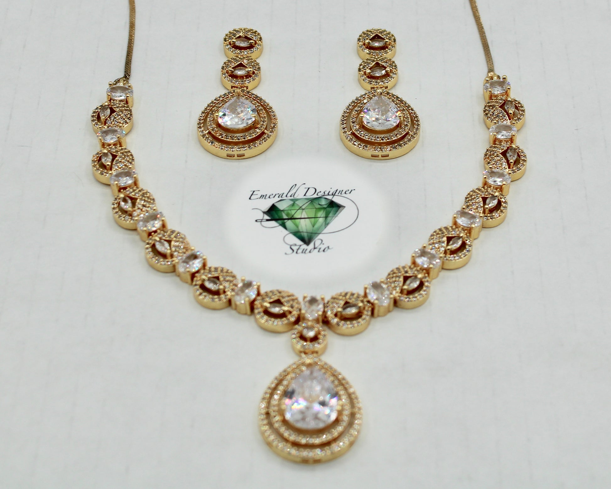This stunning pear-cut cubic zirconia necklace set is complete with matching earrings. It is the perfect set for all ages and occasions!