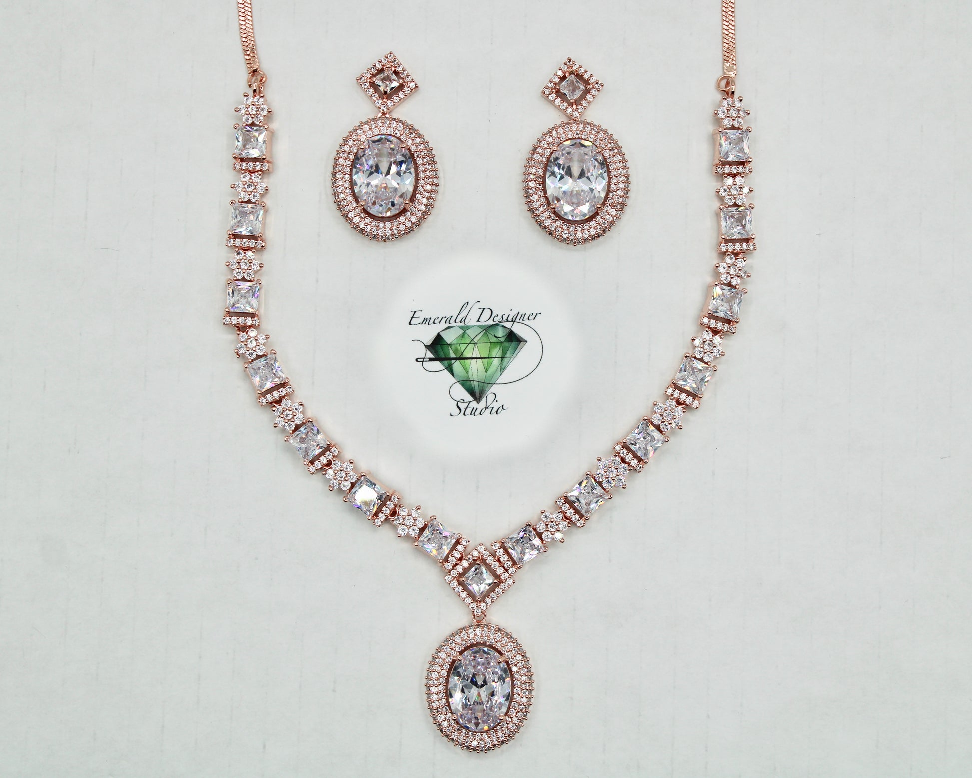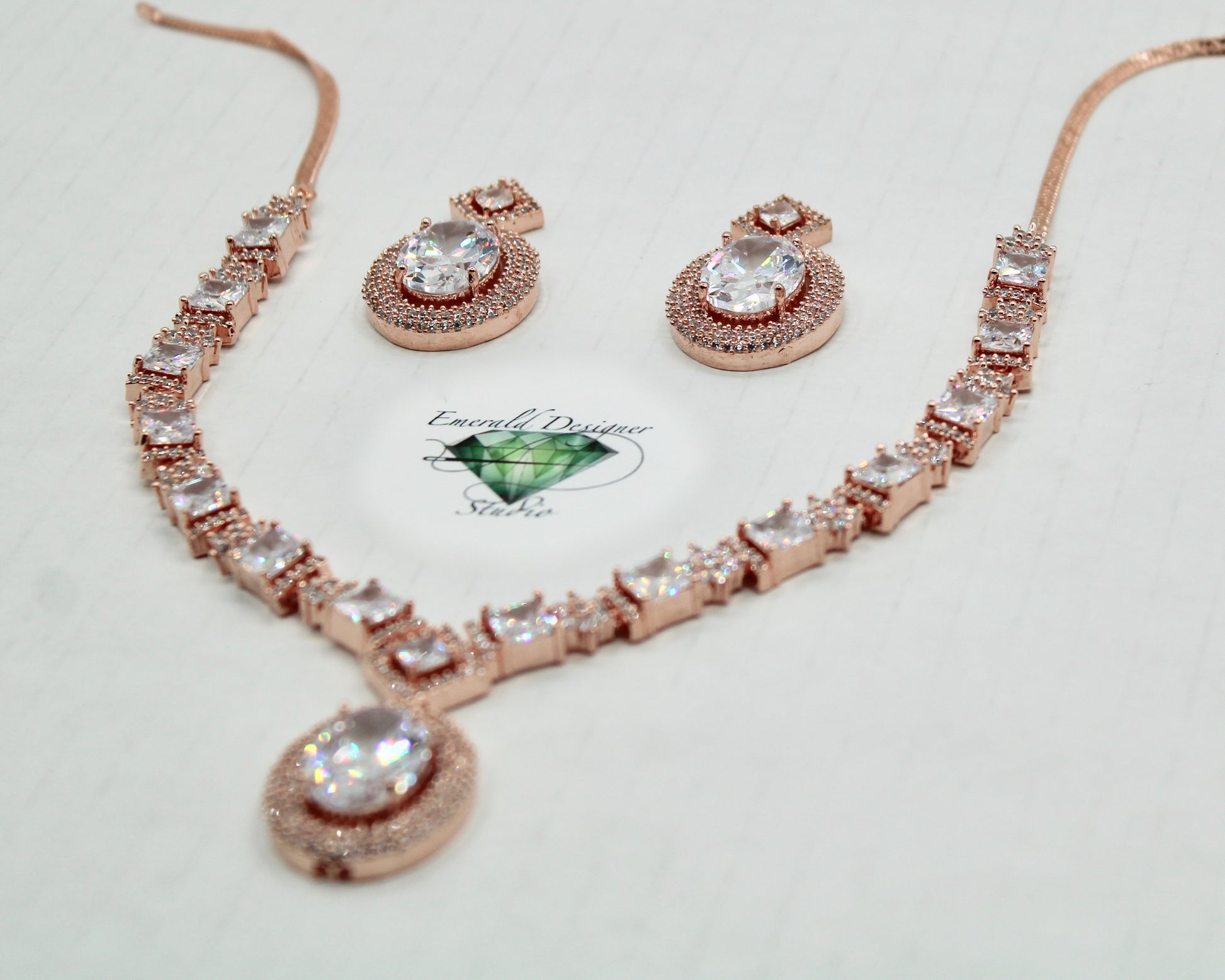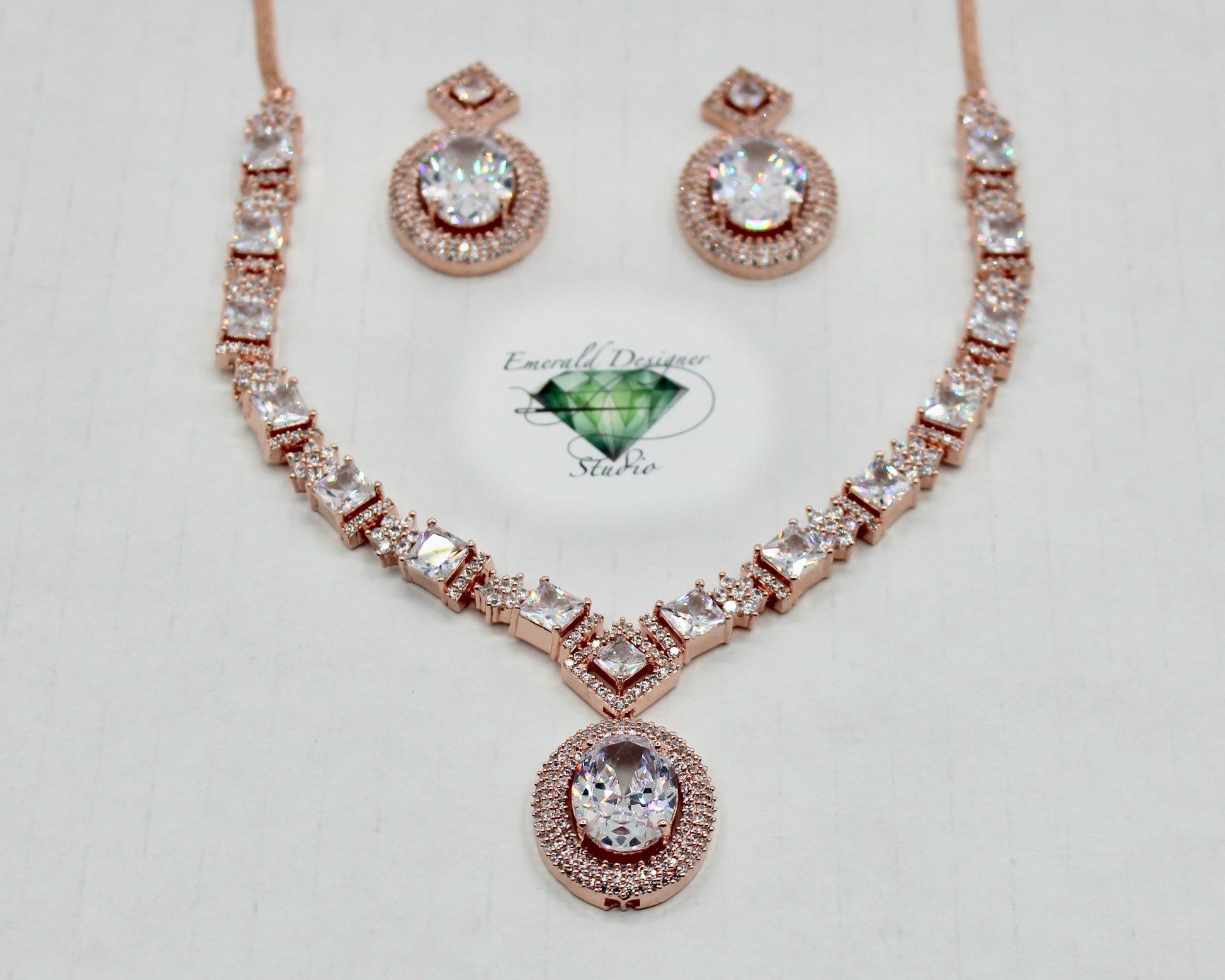 This stunning rose gold necklace set is truly timeless. It is complete with oval-cut cubic zirconia throughout and matching earrings. It is the perfect necklace set for yourself or someone you love!