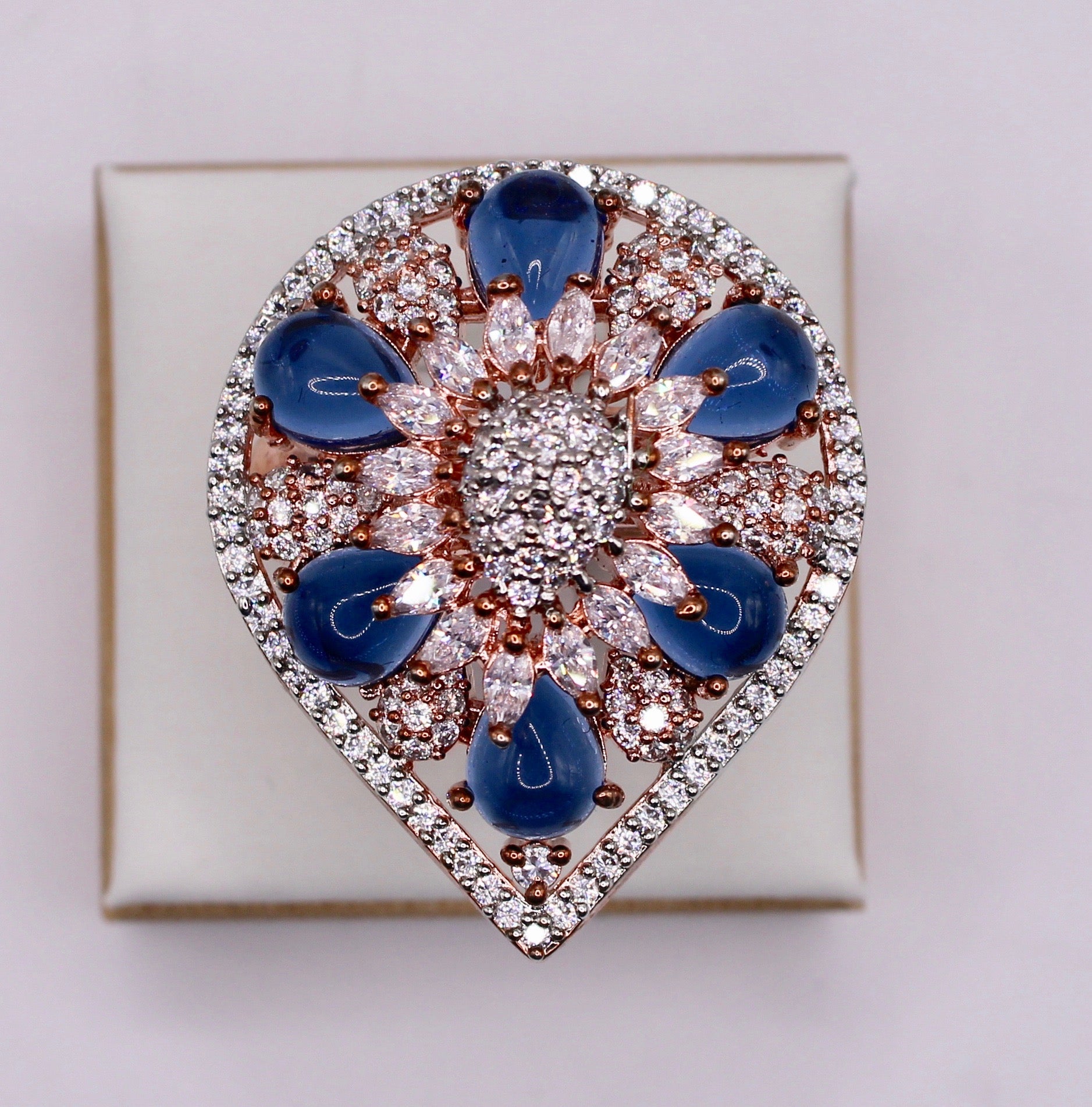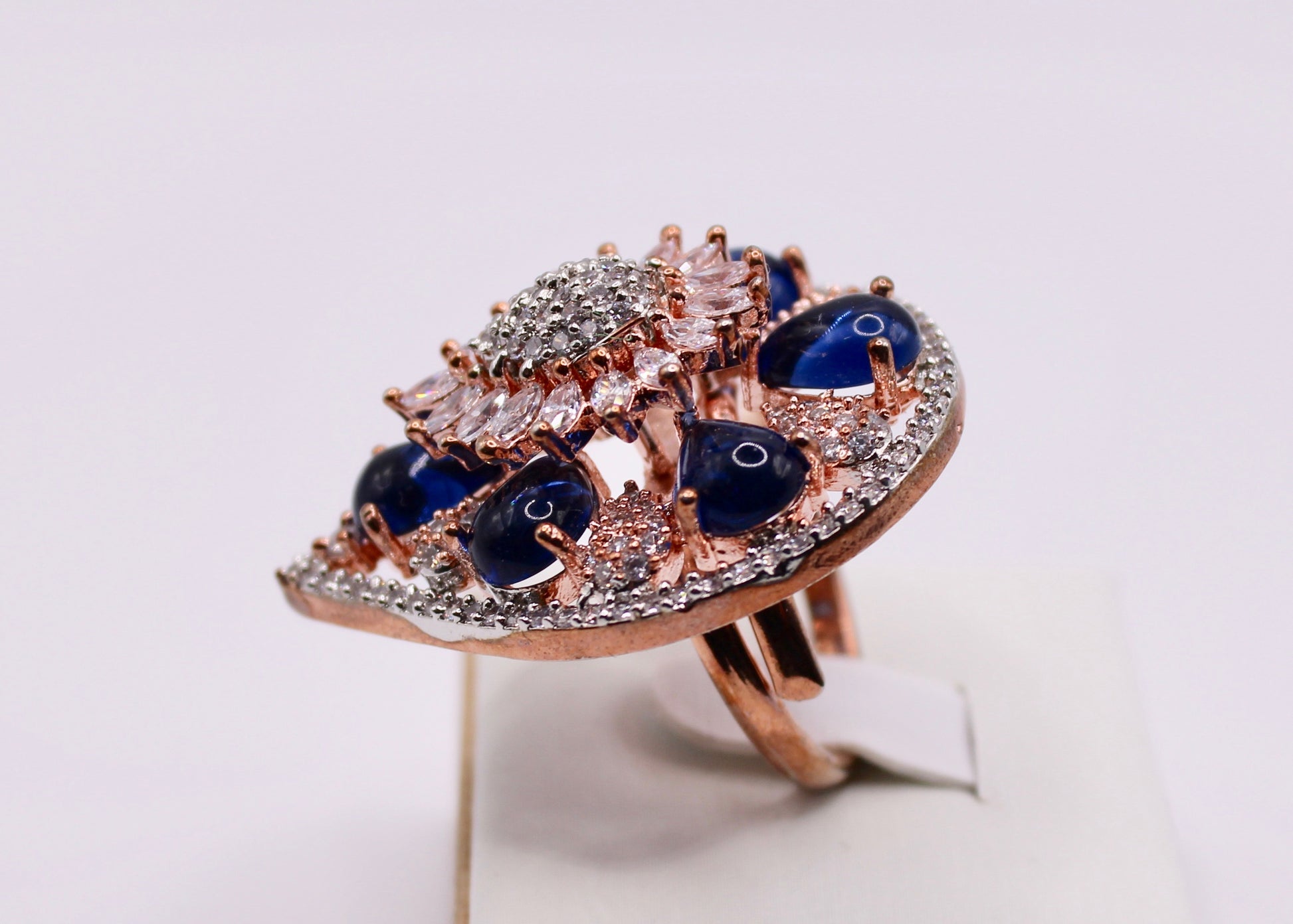 This double layered, pear-shaped rose gold and jadao cocktail ring is made with blue crystals and cubic zirconia. Adjustable, made of brass to increase product lifetime.