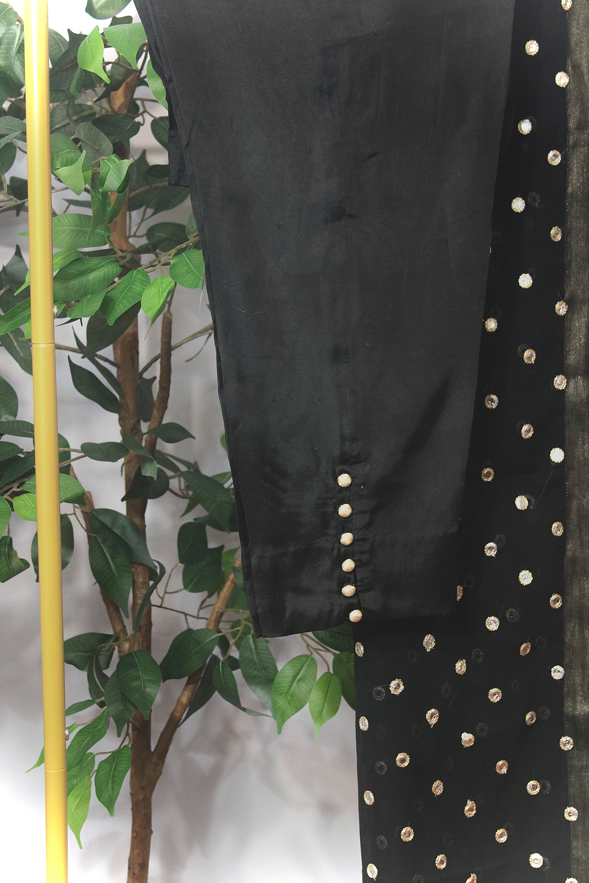 Elevate your style with this elegant ready-to-wear three-piece suit from the Emerald Originals collection. Designed for effortless sophistication, this ensemble features a luxurious foil-printed chiffon top and matching dupatta, exuding a subtle shimmer that's perfect for any occasion. Complementing the look are tailored cotton silk trousers, combining comfort and elegance for a refined touch. Perfect for festive celebrations, formal gatherings, or adding a hint of glam to your everyday wardrobe, this suit beautifully blends tradition with modern style. Experience timeless beauty with Emerald Originals