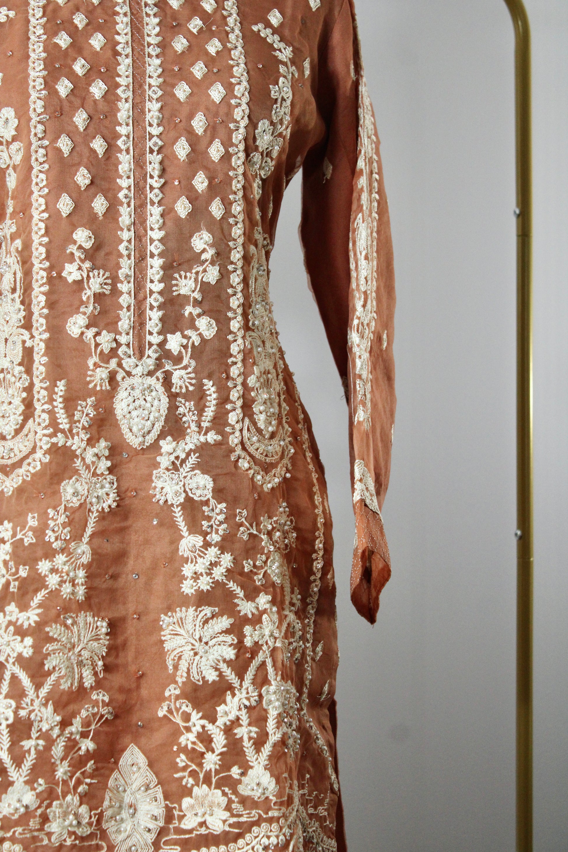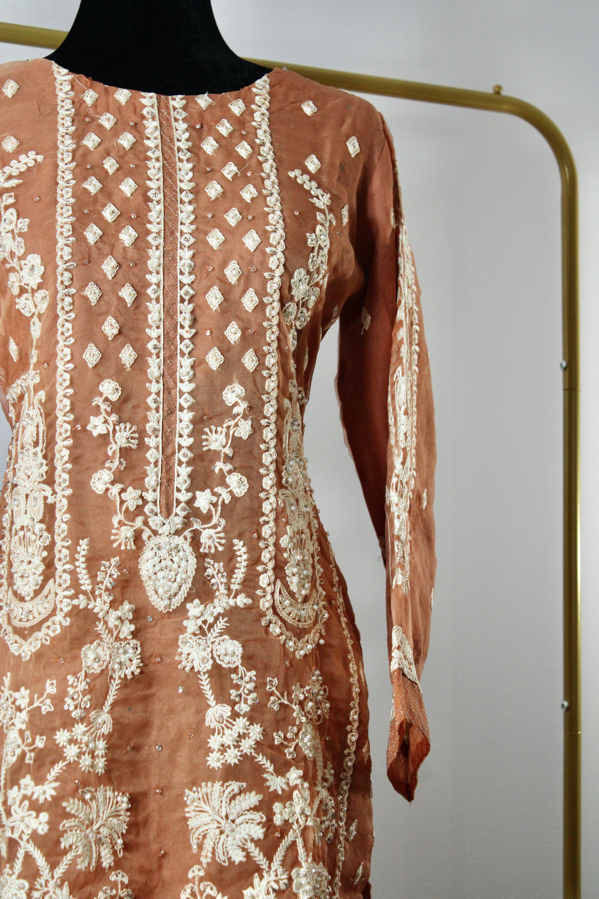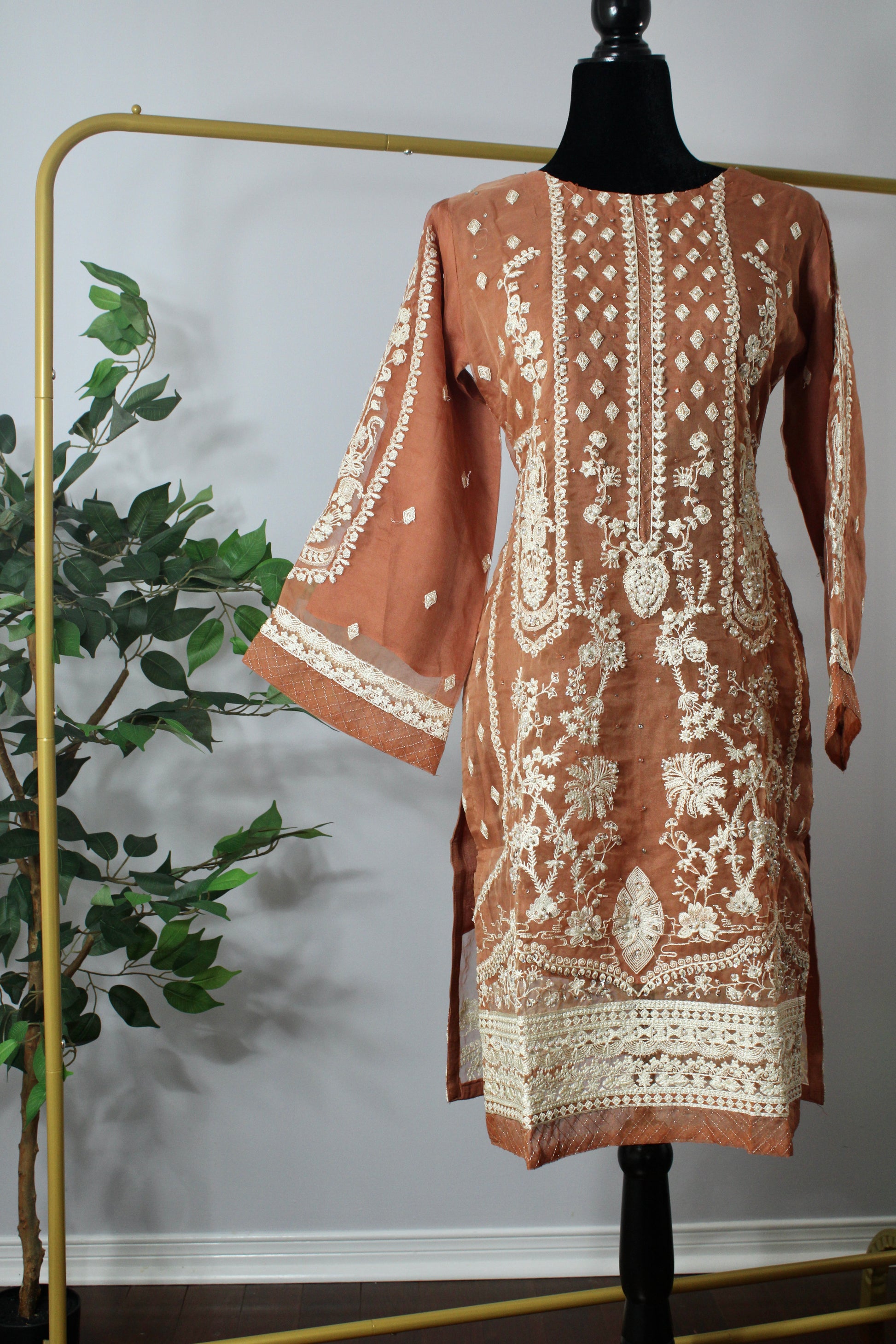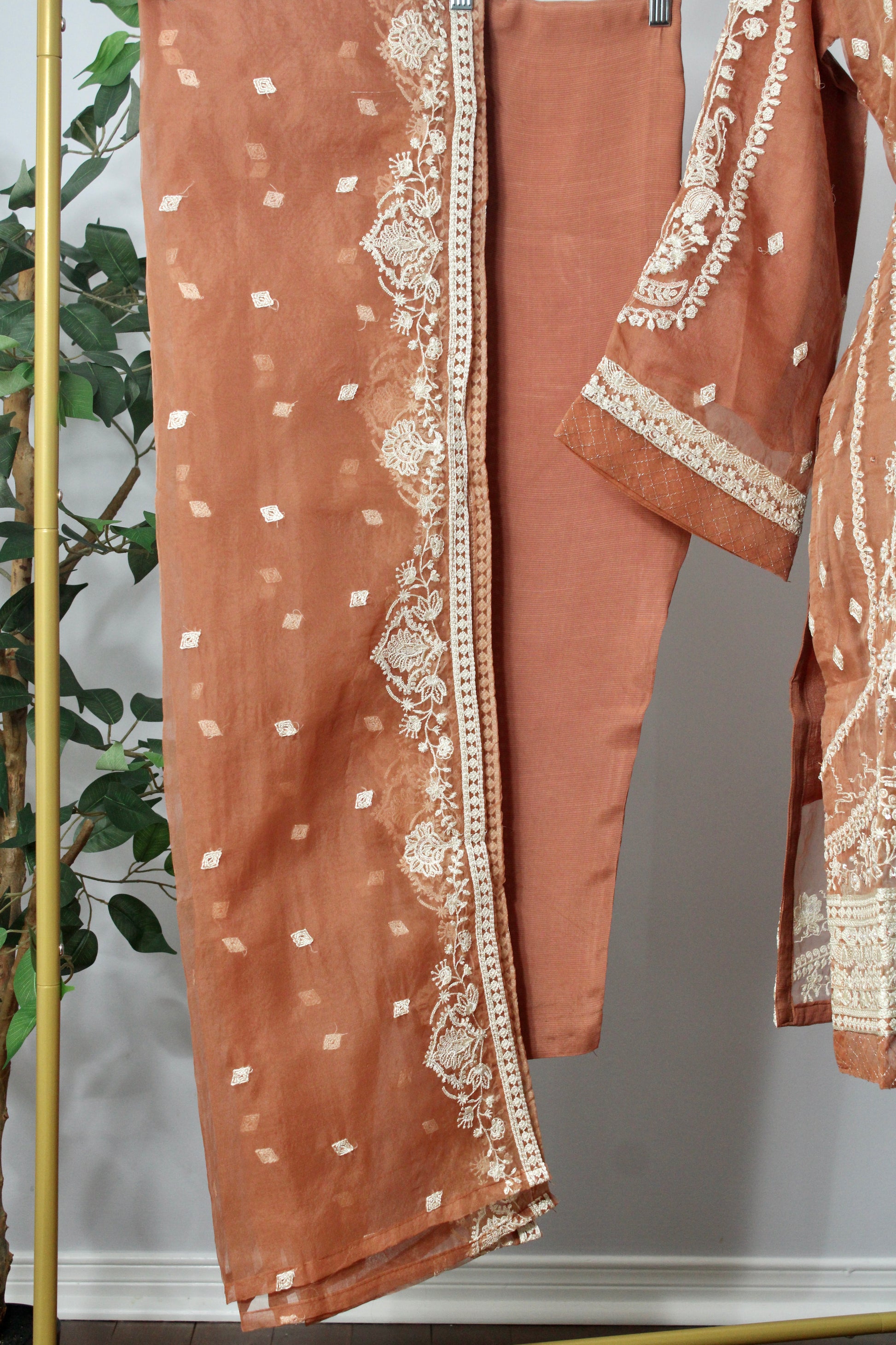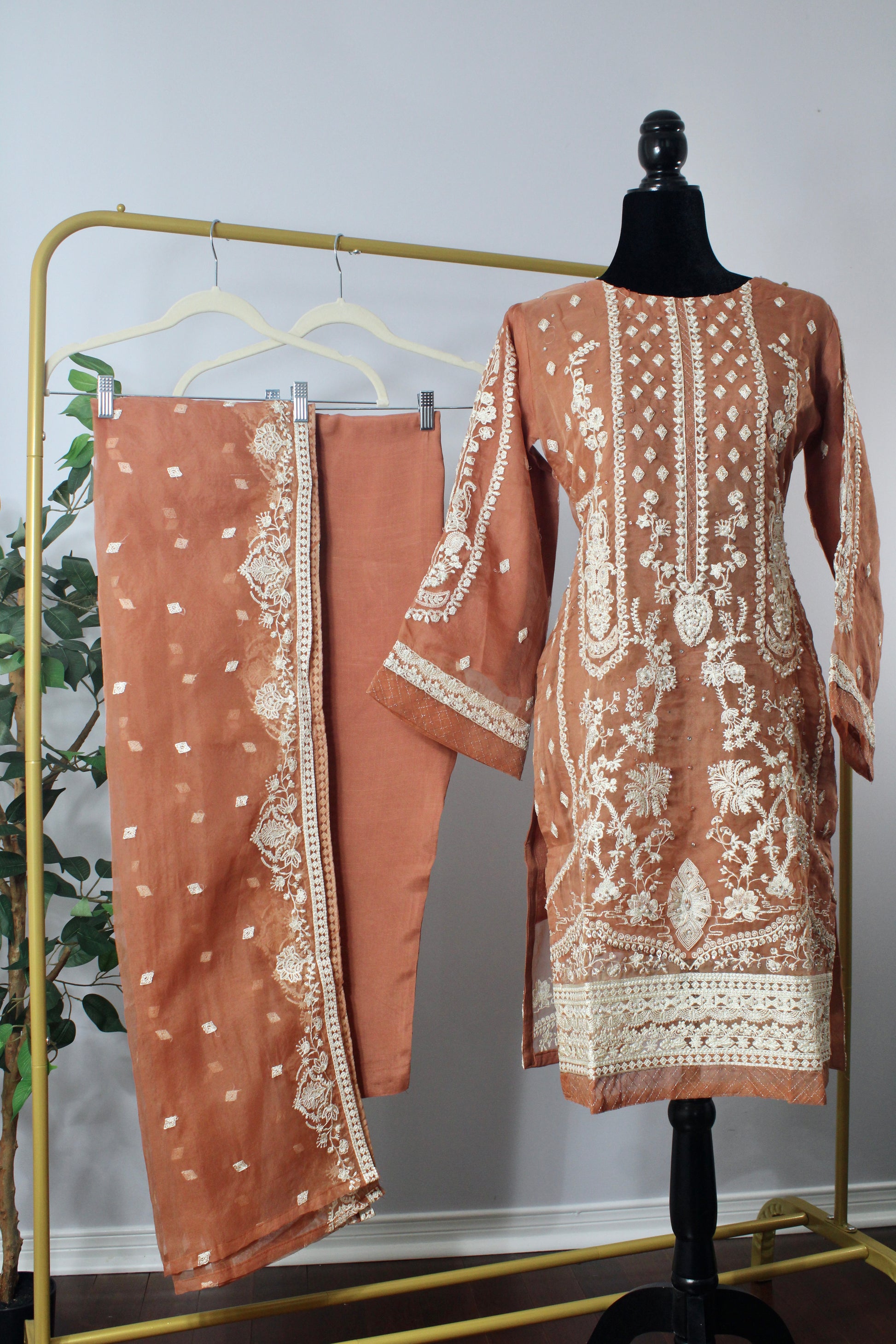 This breathtaking suit is finely crafted with contemporary pearl embroidery and thread-work throughout the shirt and dupatta, paired with lace-detailed viscose trousers. 3 piece suit, stitched and ready to wear.