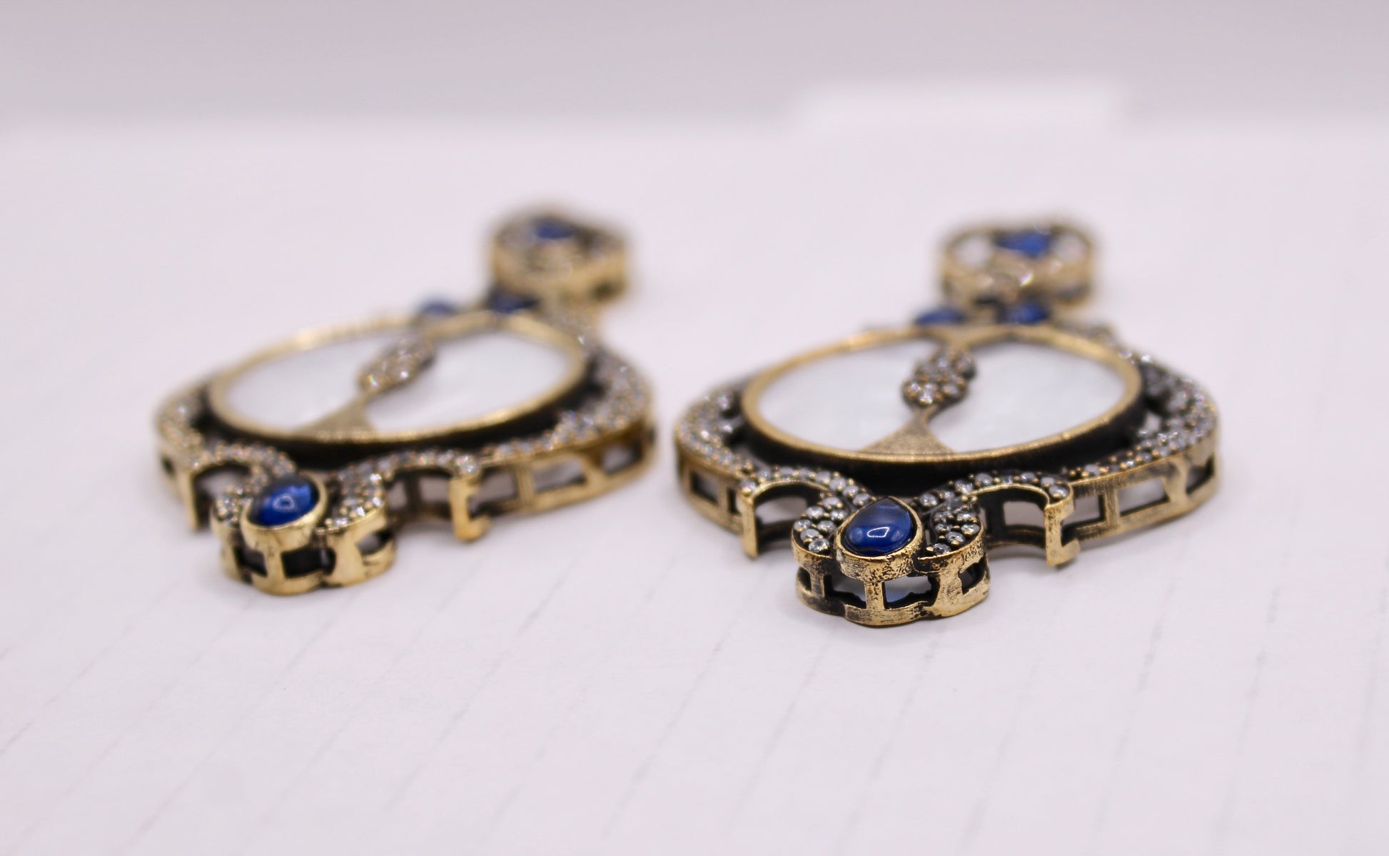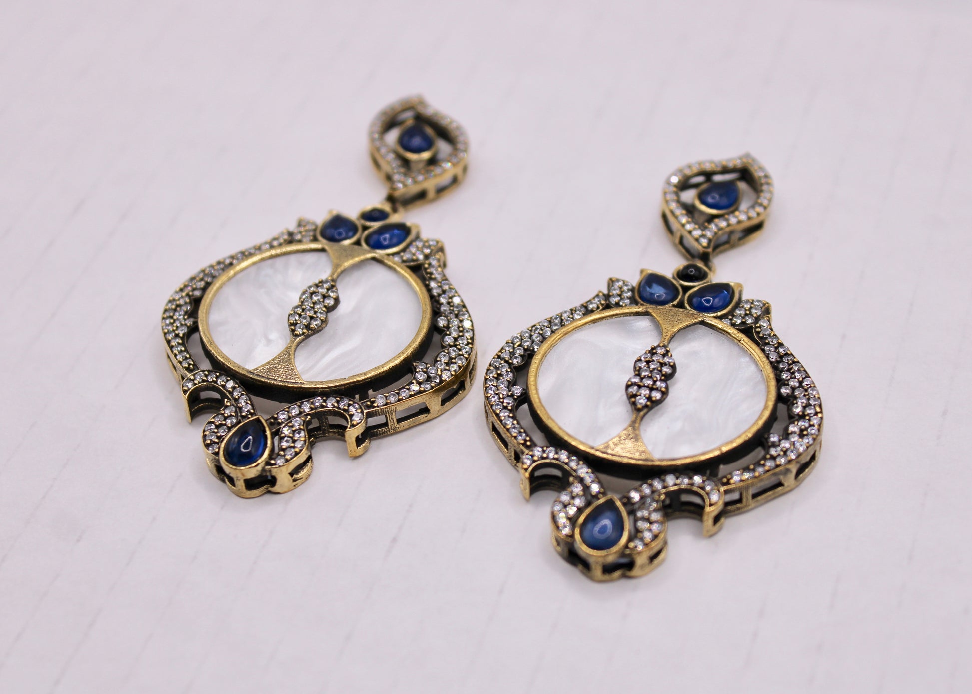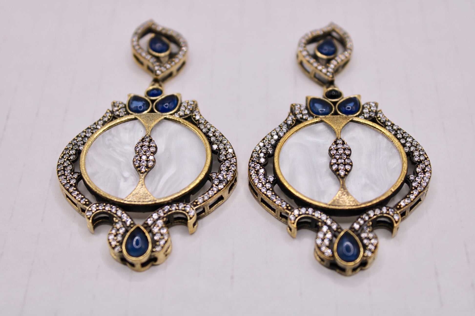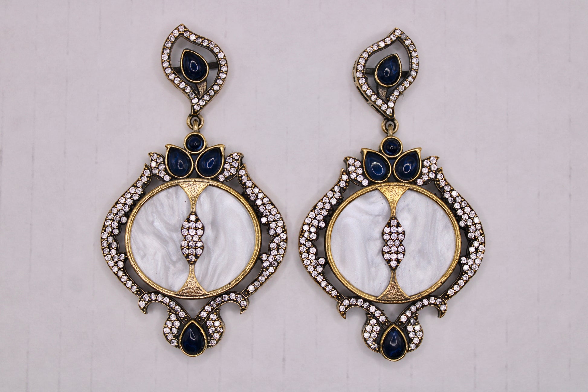 These dazzling oxidized earrings are complete with Nacre, also known as mother of pearl, and cubic zirconia detailing throughout. These earrings are a timeless and can be worn with both Eastern and Western outfits.