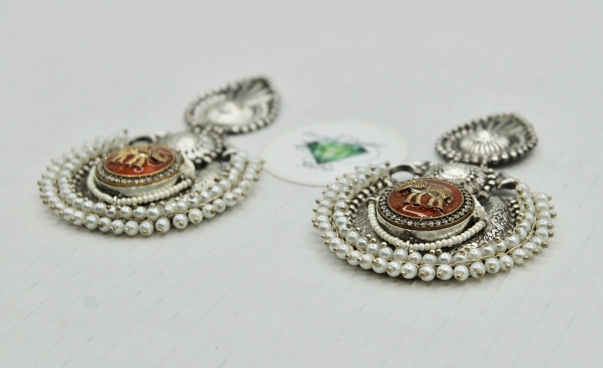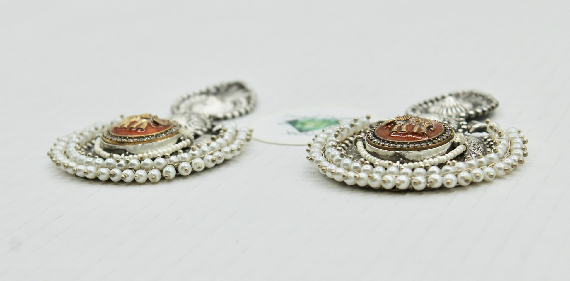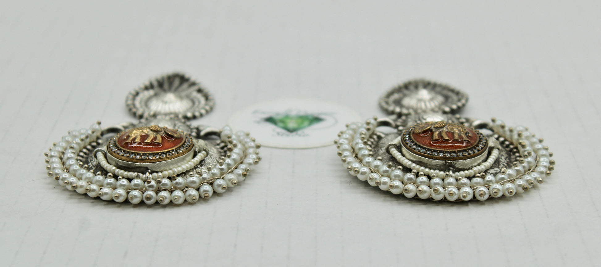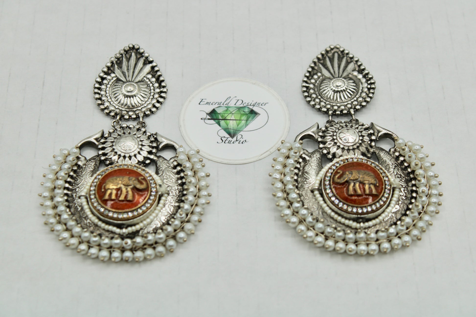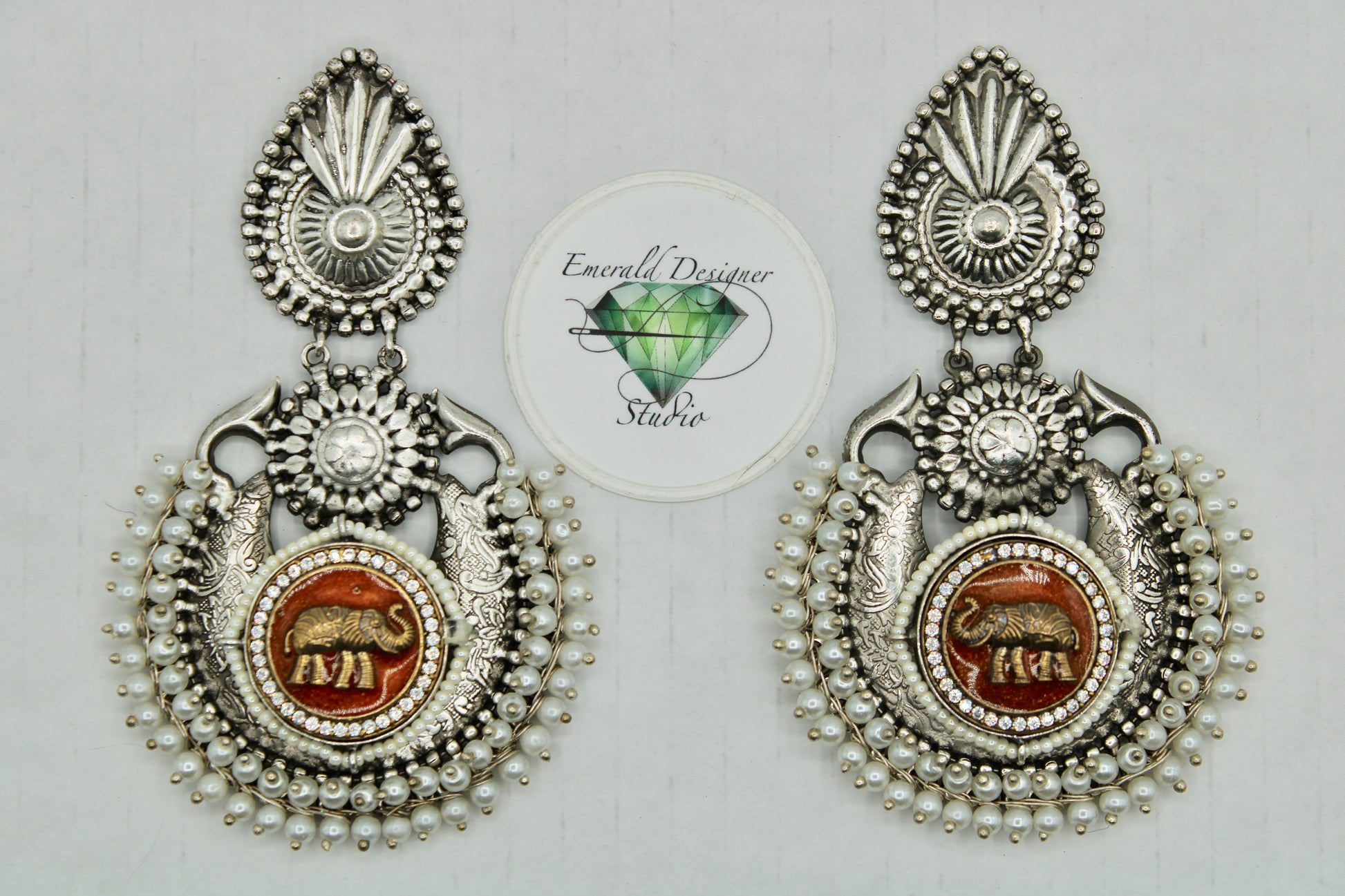 These stunning oxidized earrings are detailed with elephants to reflect Hindu culture. They are complete with faux pearl gajra appliqués.