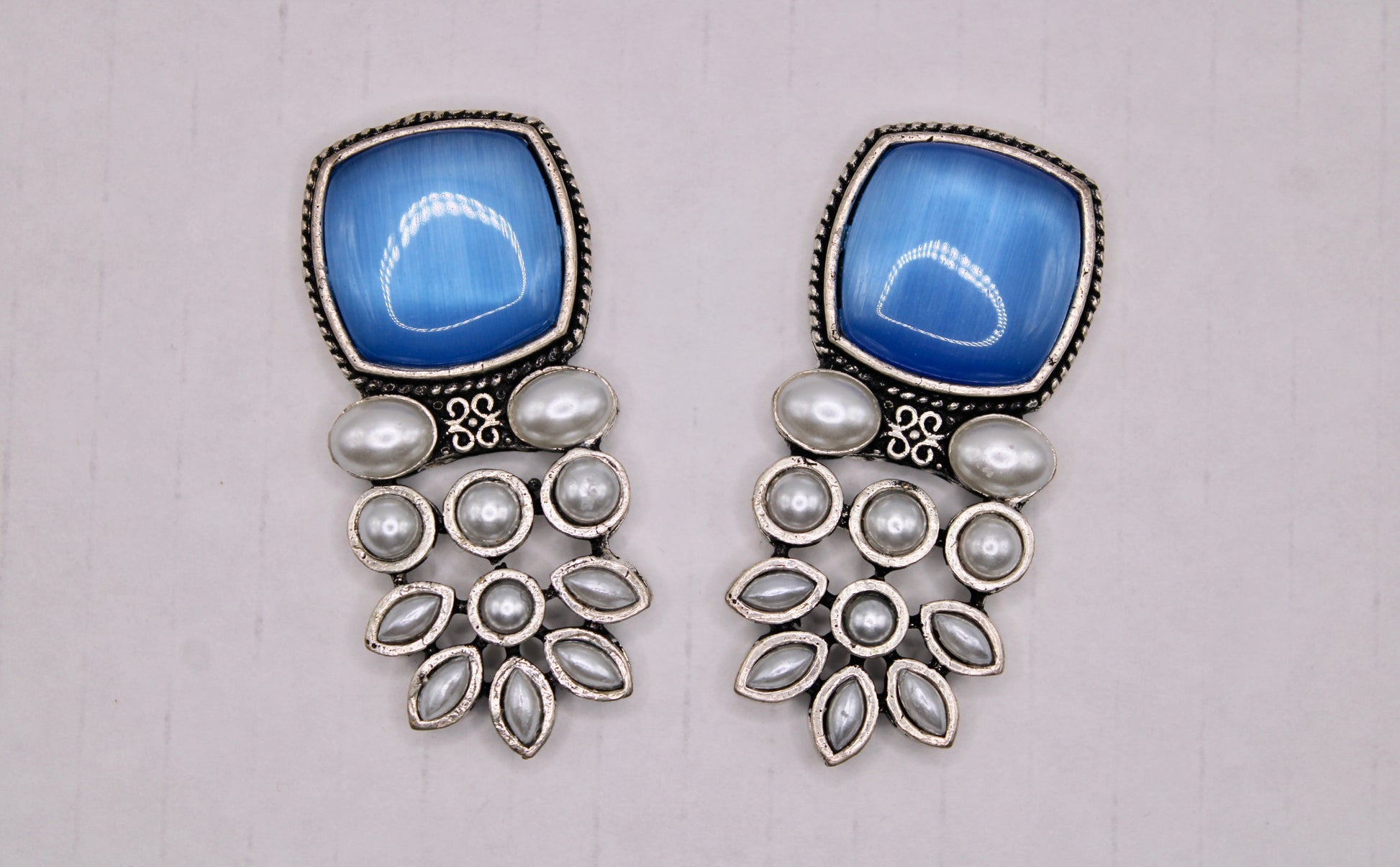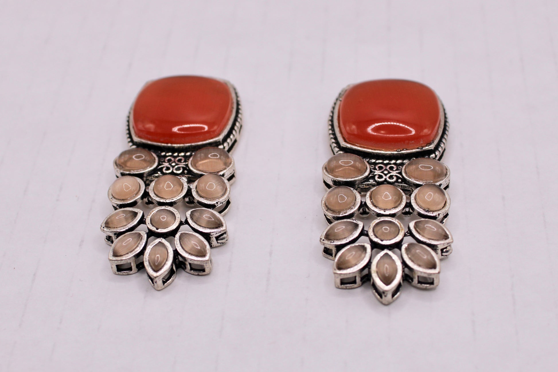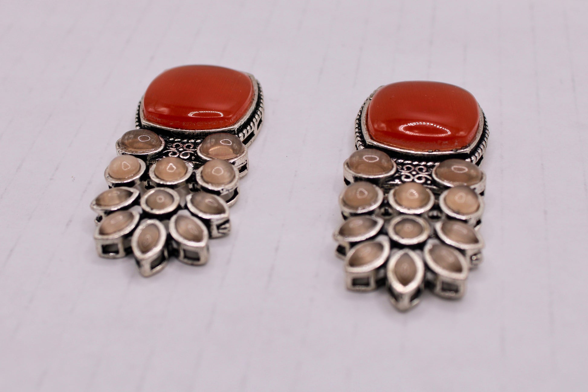 These oxidized earrings complete with mona lisa are a trendy addition to any outfit, and their high quality makes them a long-lasting choice. Their oxidized finish adds a touch of uniqueness, and they can effortlessly enhance both eastern and western outfits. Make a statement with these versatile earrings. Available in two colours.