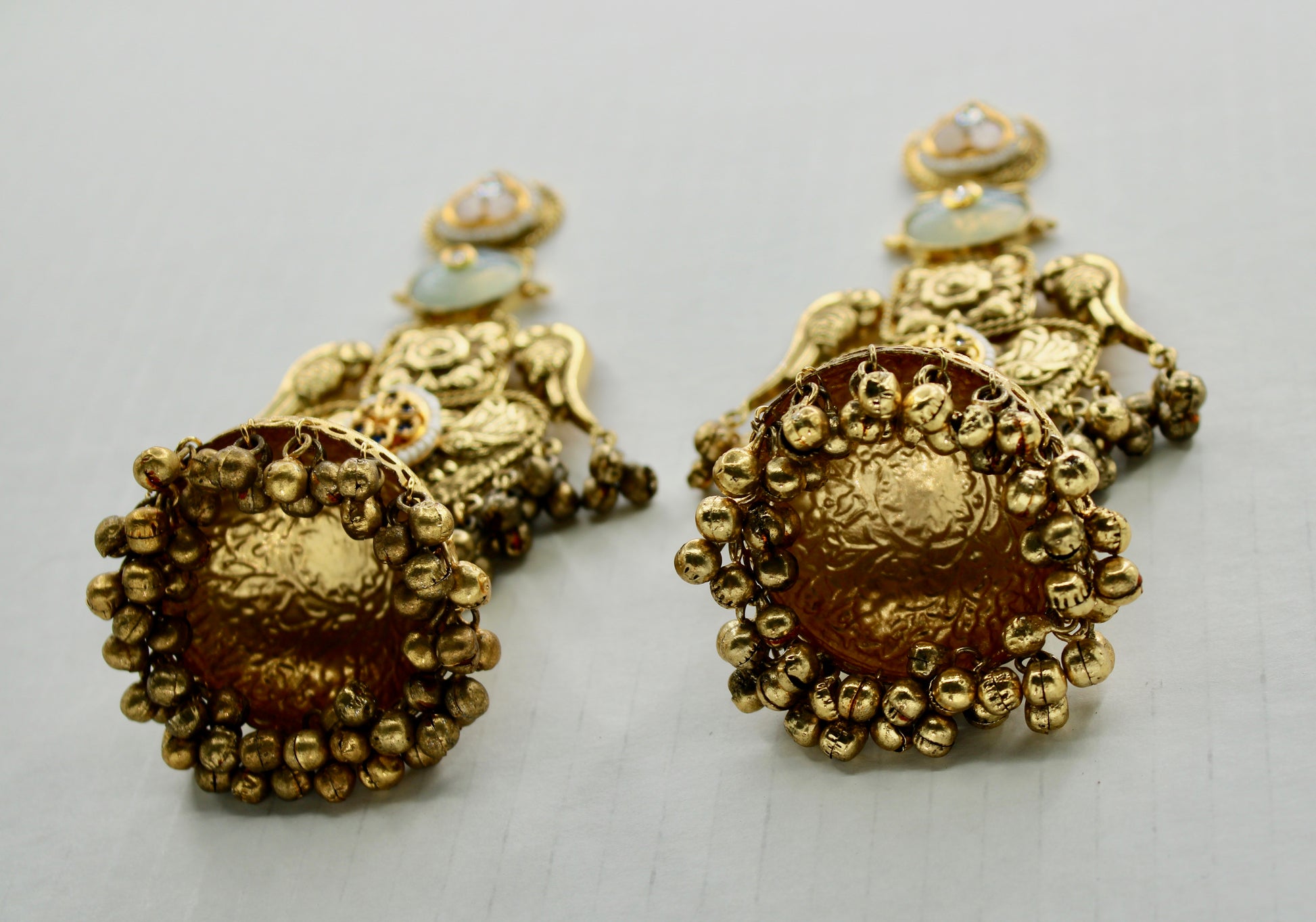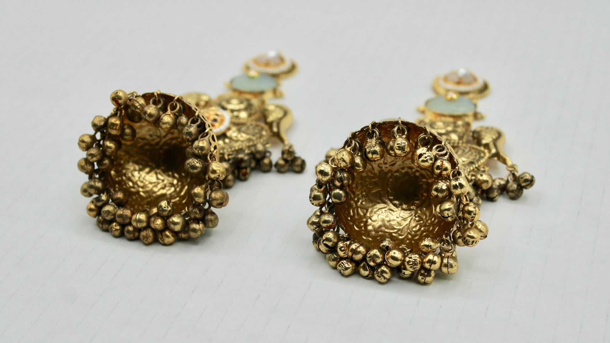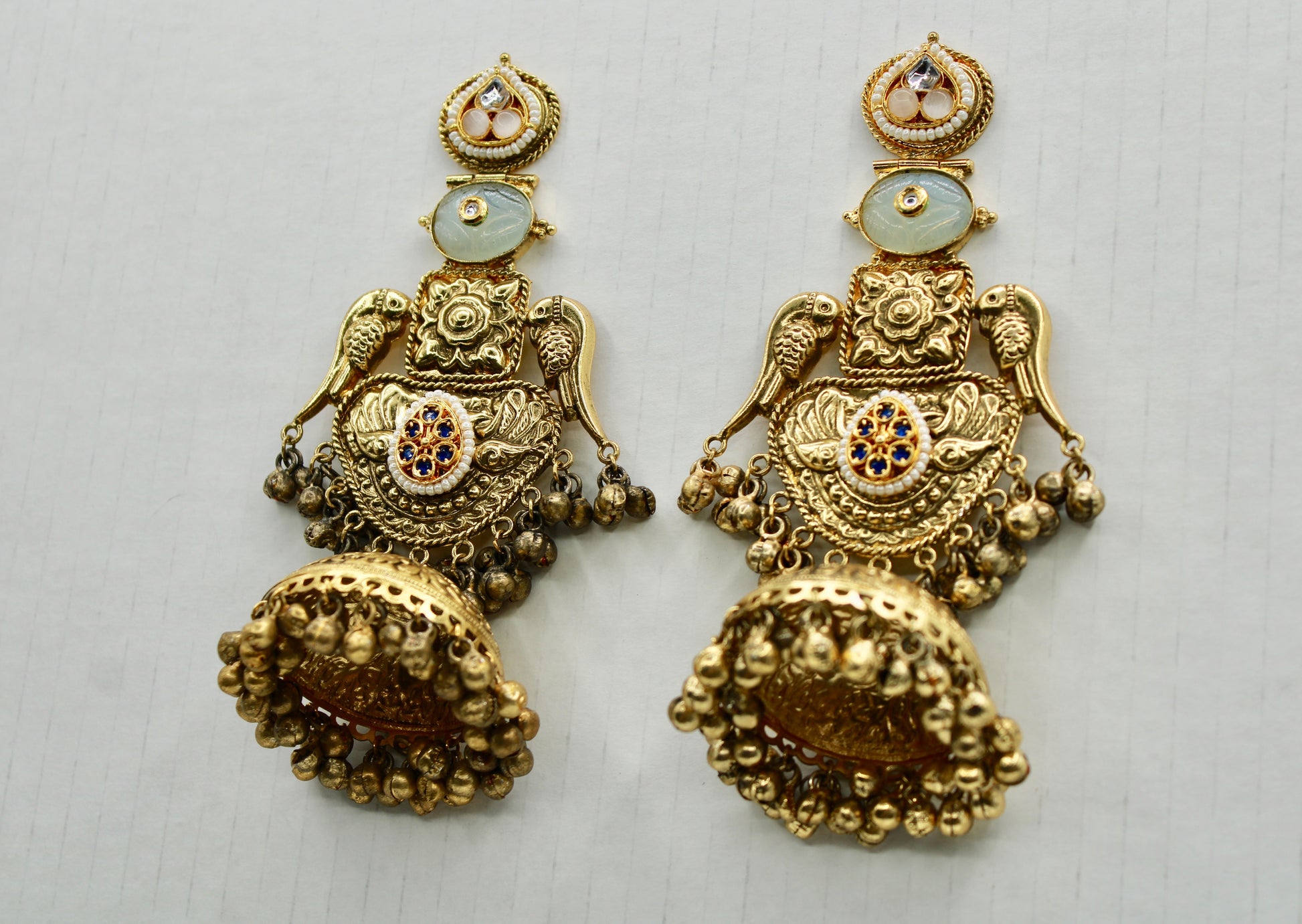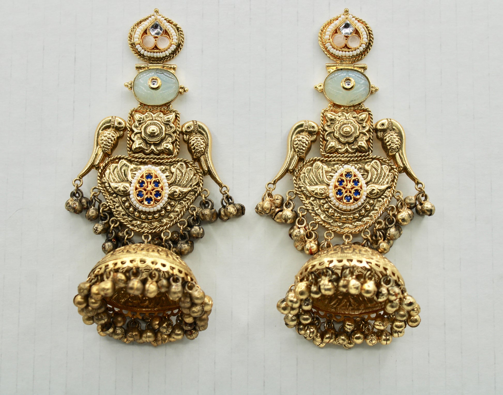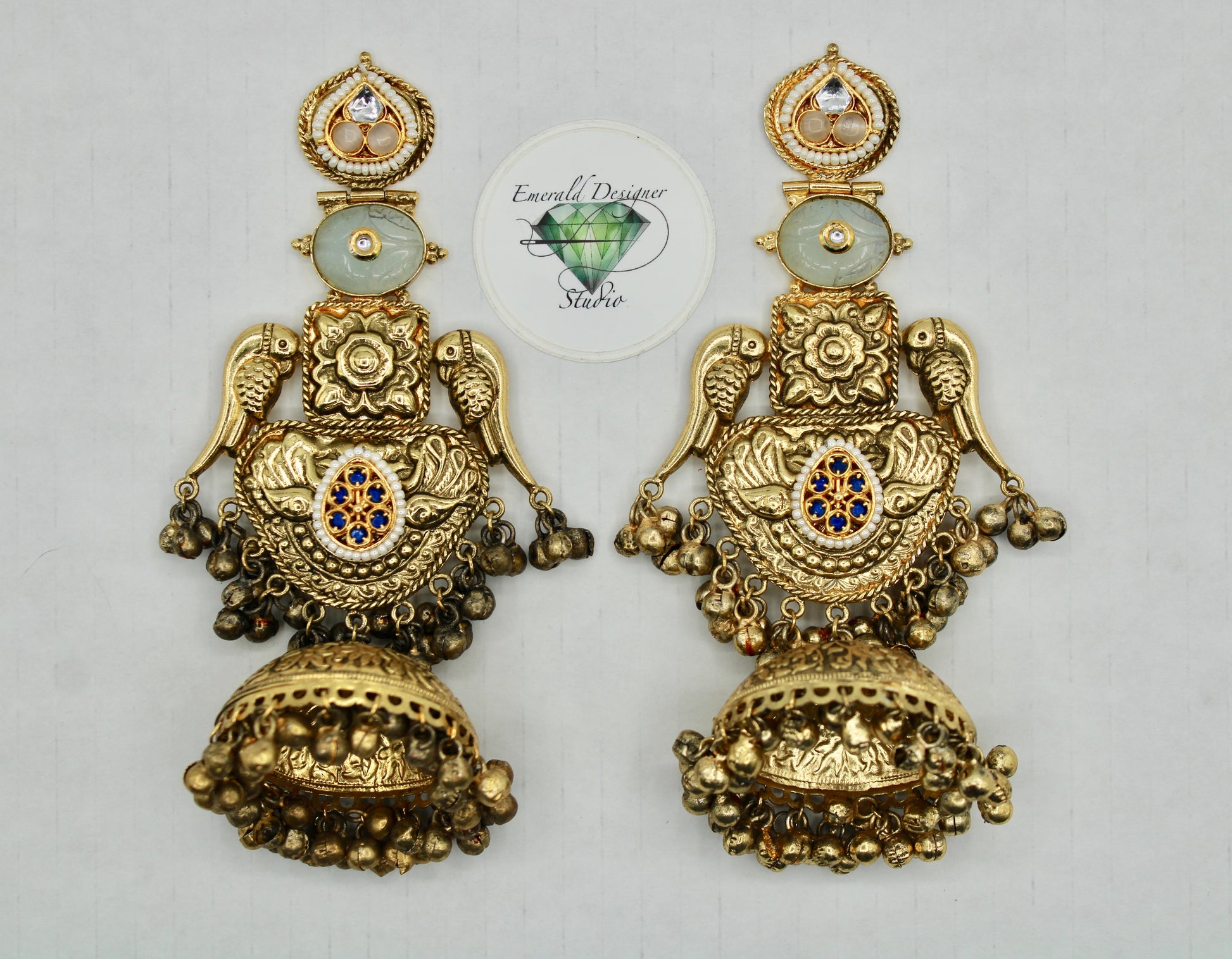 Elevate any look with these oxidized fusion jhumkis. These high-quality earrings feature a fusion of traditional and modern design, complete with kundan, faux pearl detailing, and carved stone. Add a touch of elegance to your style with these versatile and stylish earrings.
