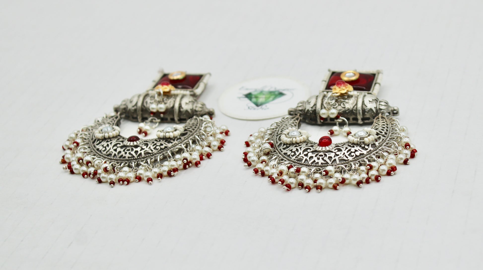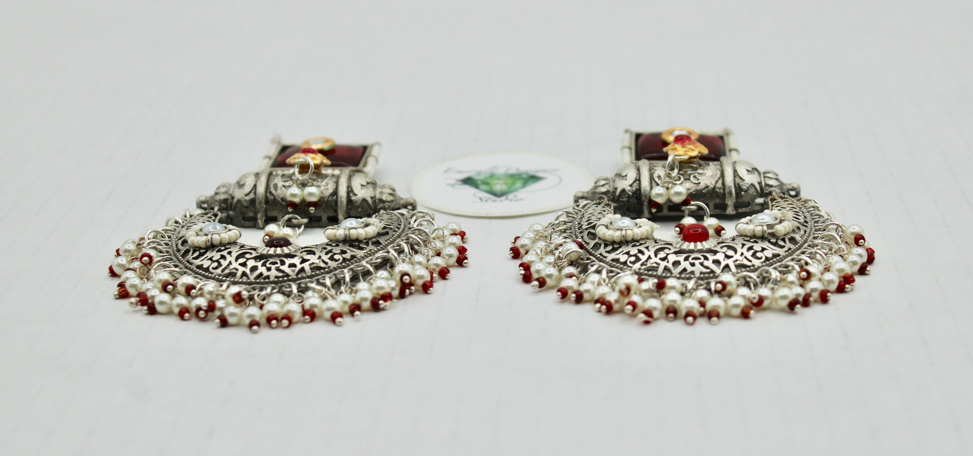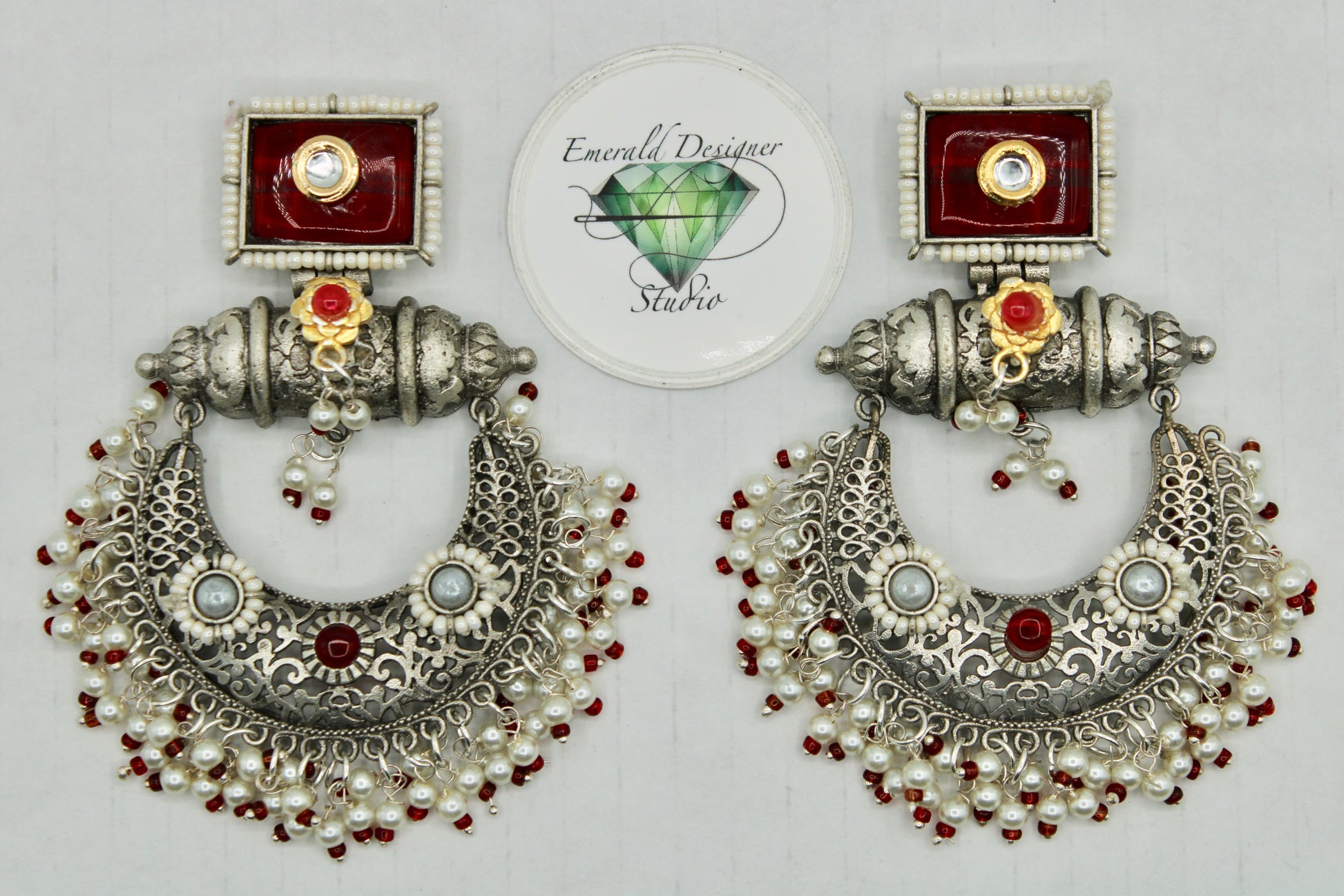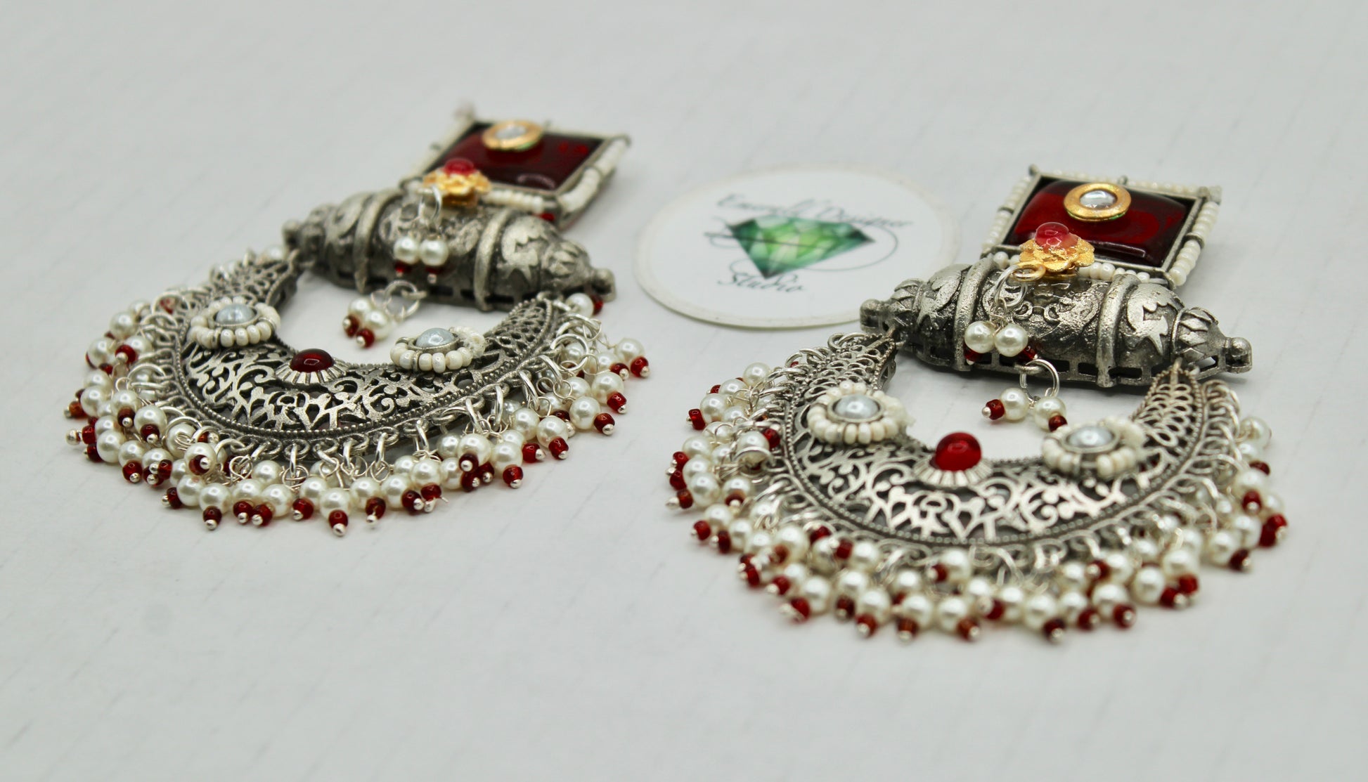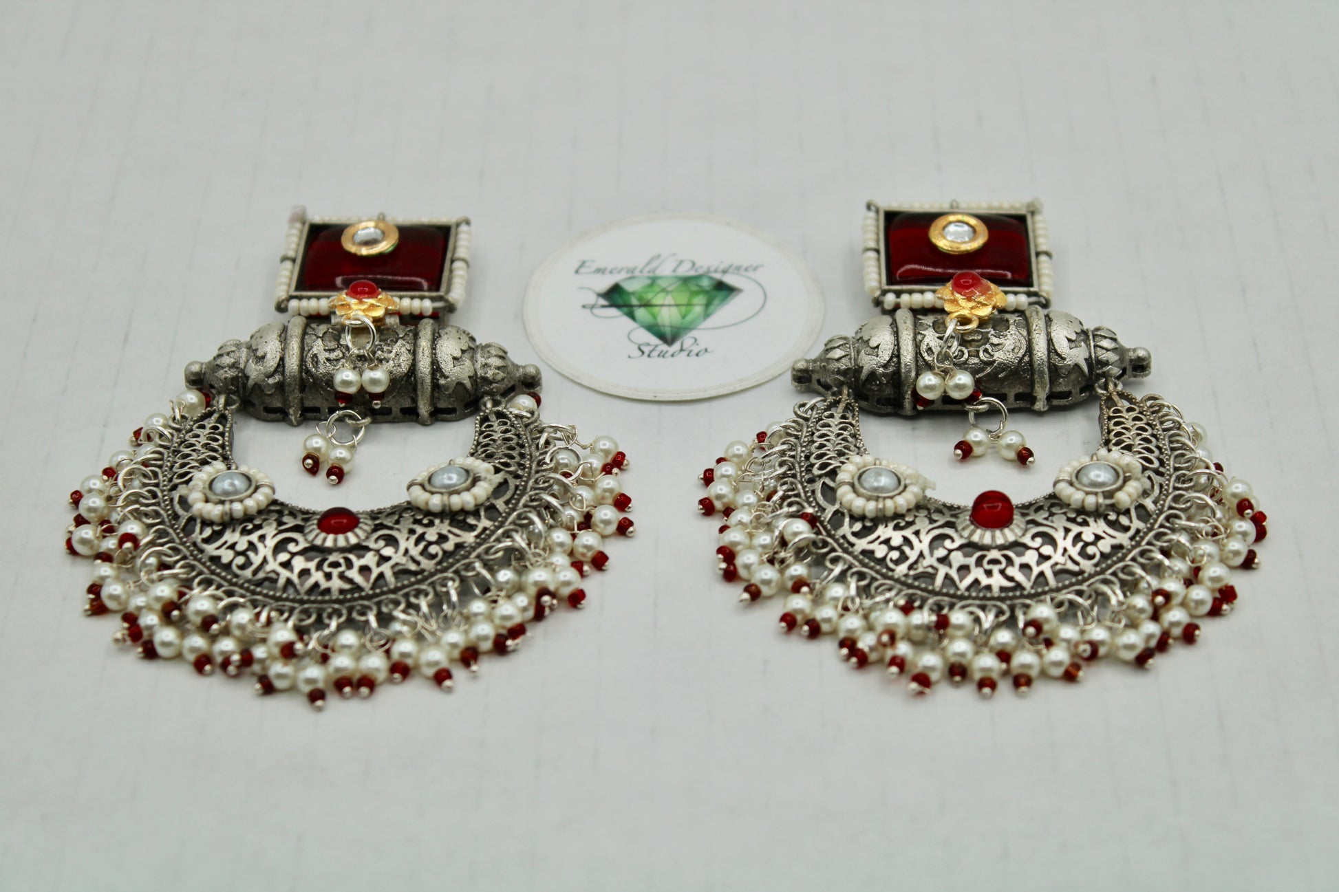 These elegant oxidized kundan earrings are intricately designed, featuring faux pearls, and add a touch of sophistication to any outfit. Made with high-quality materials, these earrings are the perfect accessory for any occasion.