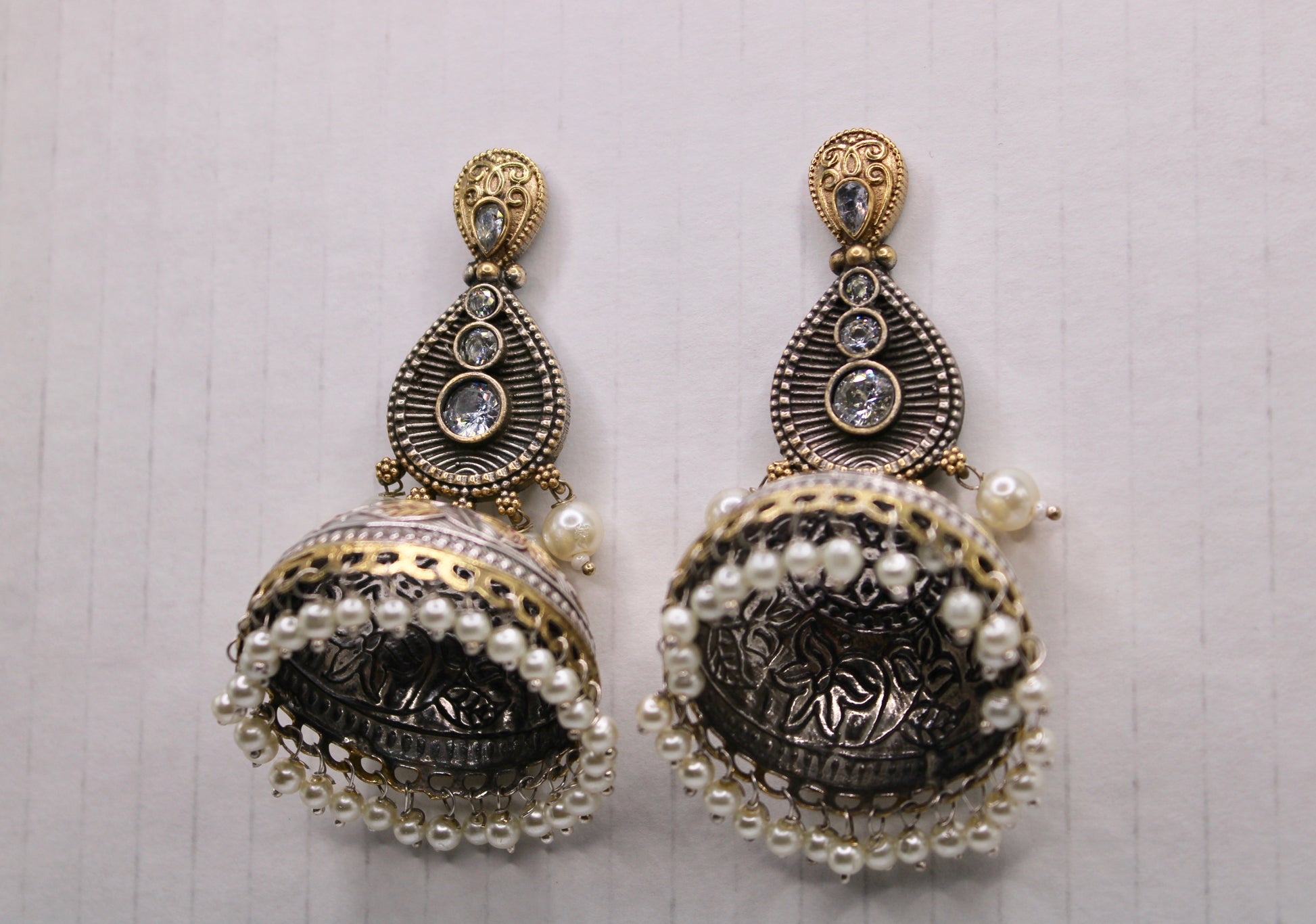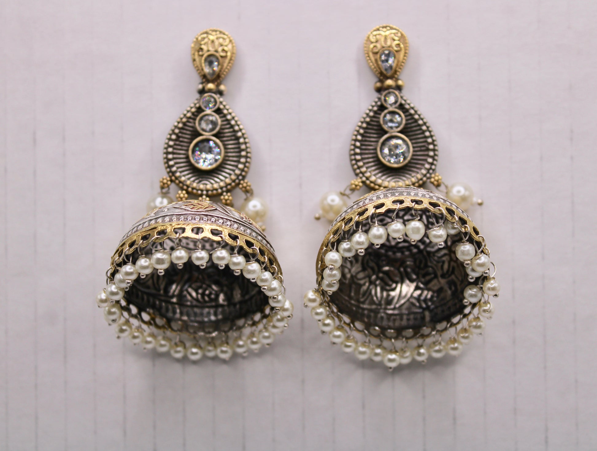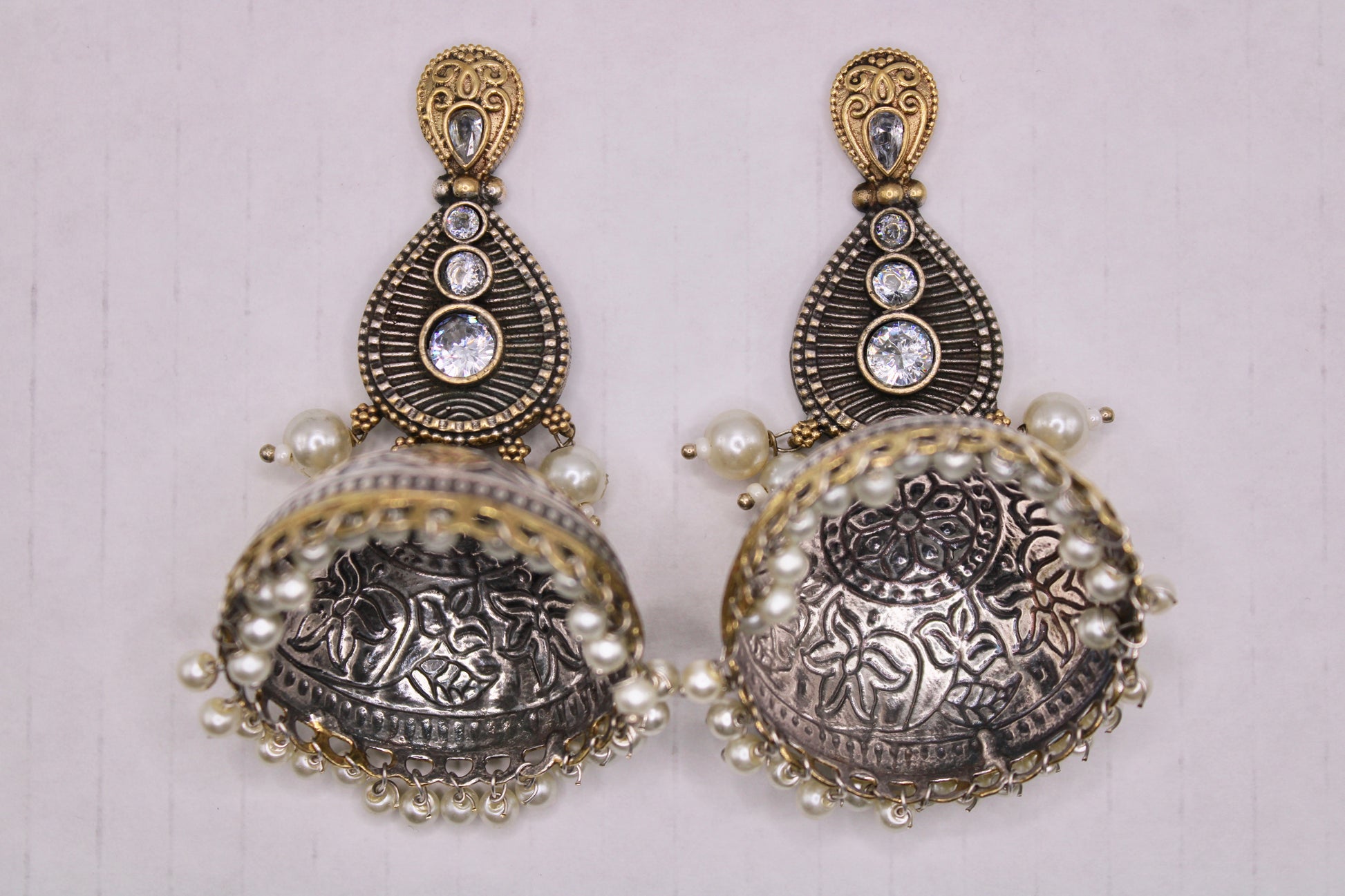 These expertly crafted oxidized two-toned jhumkis are complete with high-quality cubic zirconia and faux pearl details. Elevate your look with these elegant and versatile earrings, adding a touch of sophistication to any outfit. Perfect for any occasion, these jhumkis are sure to become a staple in your jewelry collection.