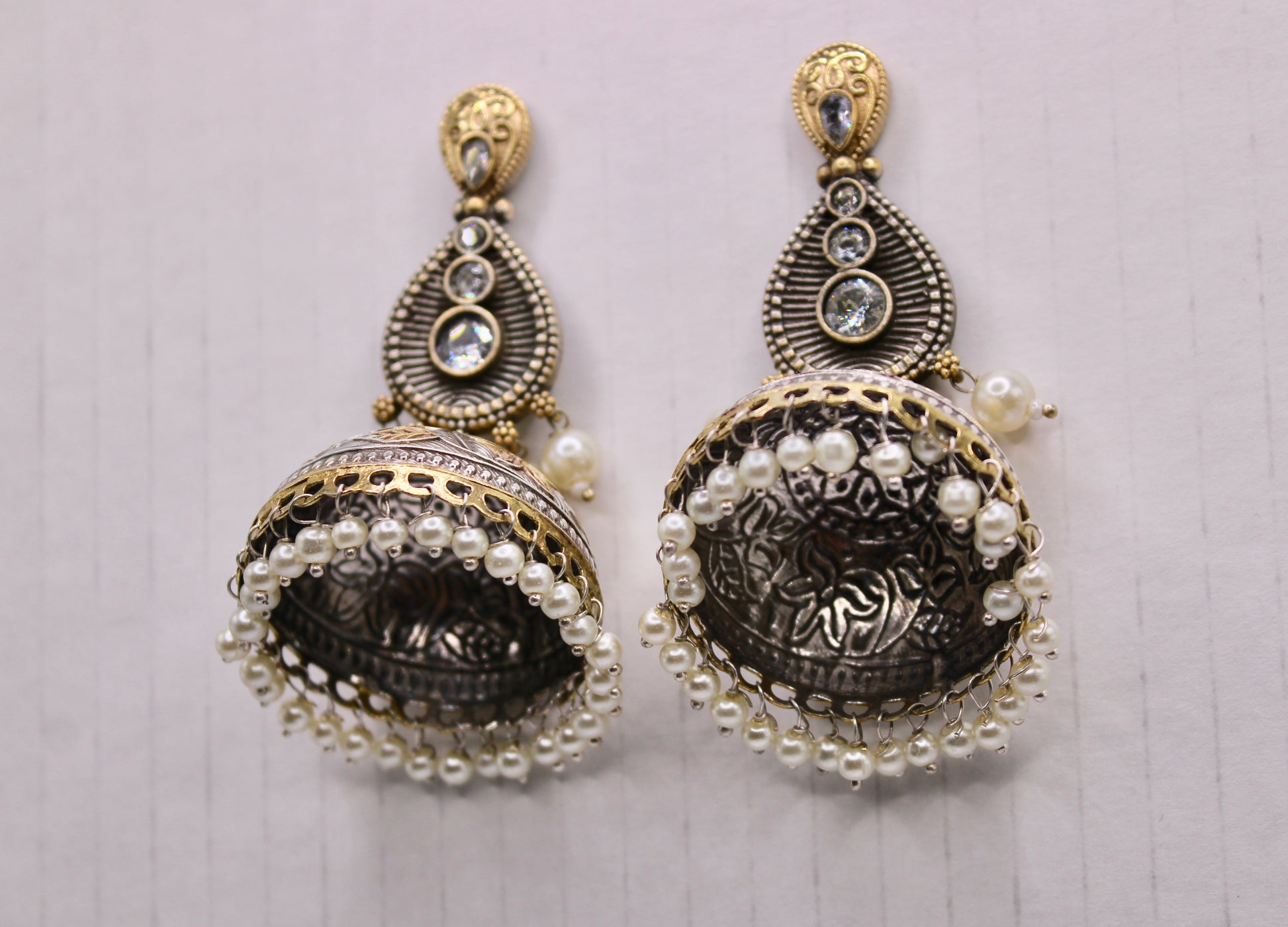 Oxidized Two-Toned Jhumkis With Faux Pearls - E1268